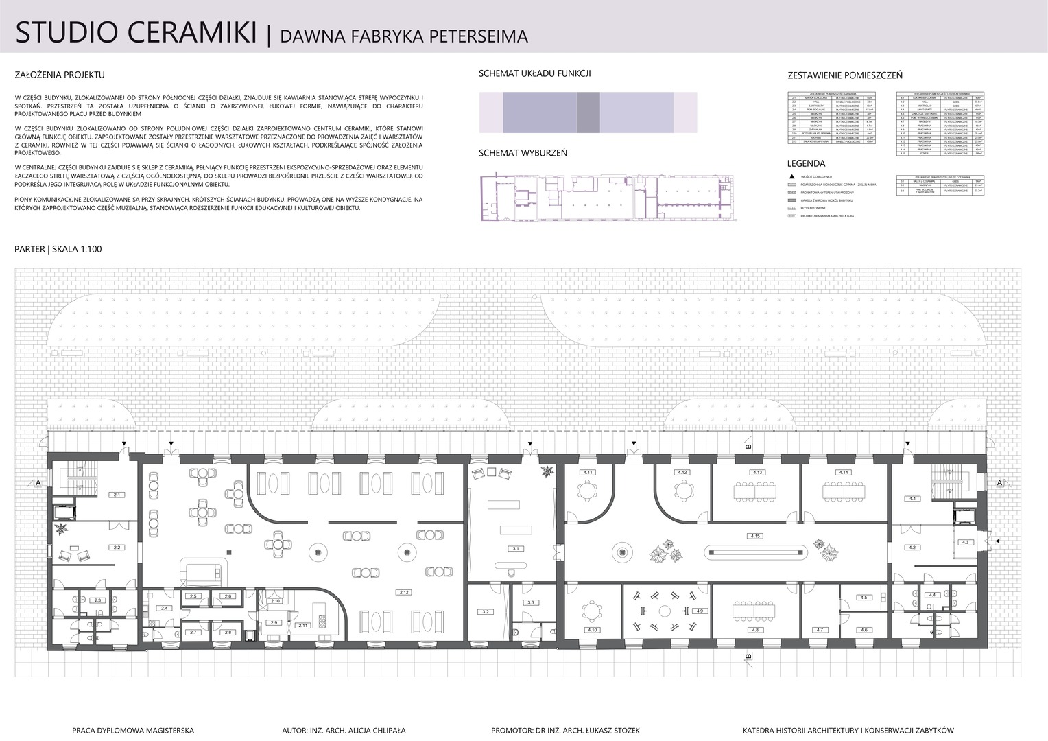 Ideą projektu jest stworzenie wielofunkcyjnego obiektu łączącego funkcje warsztatową, ekspozycyjną i społeczną, stanowiącego dialog pomiędzy tradycją a współczesnością oraz rzemiosłem i sztuką. Układ funkcjonalny oparto na czytelnym podziale stref odpowiadających różnym formom aktywności. W południowej części budynku zlokalizowano Studio Ceramiki – główną funkcję założenia – obejmujące część warsztatową oraz sale zajęciowe. Prosty układ przełamano ścianami krzywoliniowymi, nawiązującymi do plastyczności gliny. Centralną strefę stanowi sklep z ceramiką, pełniący rolę funkcjonalnego i ideowego łącznika. W północnej części zaprojektowano kawiarnię jako przestrzeń wypoczynku i integracji. Piony komunikacyjne umieszczono przy skrajnych ścianach budynku, prowadząc na kondygnacje muzealne. Na pierwszym piętrze zaprojektowano Muzeum Ceramiki, a na drugim Muzeum Sztuki – oba z podziałem na strefę starożytną i współczesną, budując narrację ciągłości i ewolucji. Istotnym elementem ideowym jest szklana fasada tworząca zewnętrzny korytarz – strefę przejścia pomiędzy „codziennością” a wnętrzem obiektu. Kolor fioletowy symbolizuje przemianę