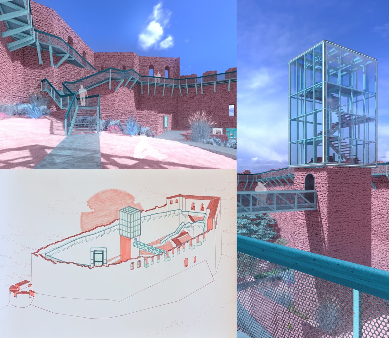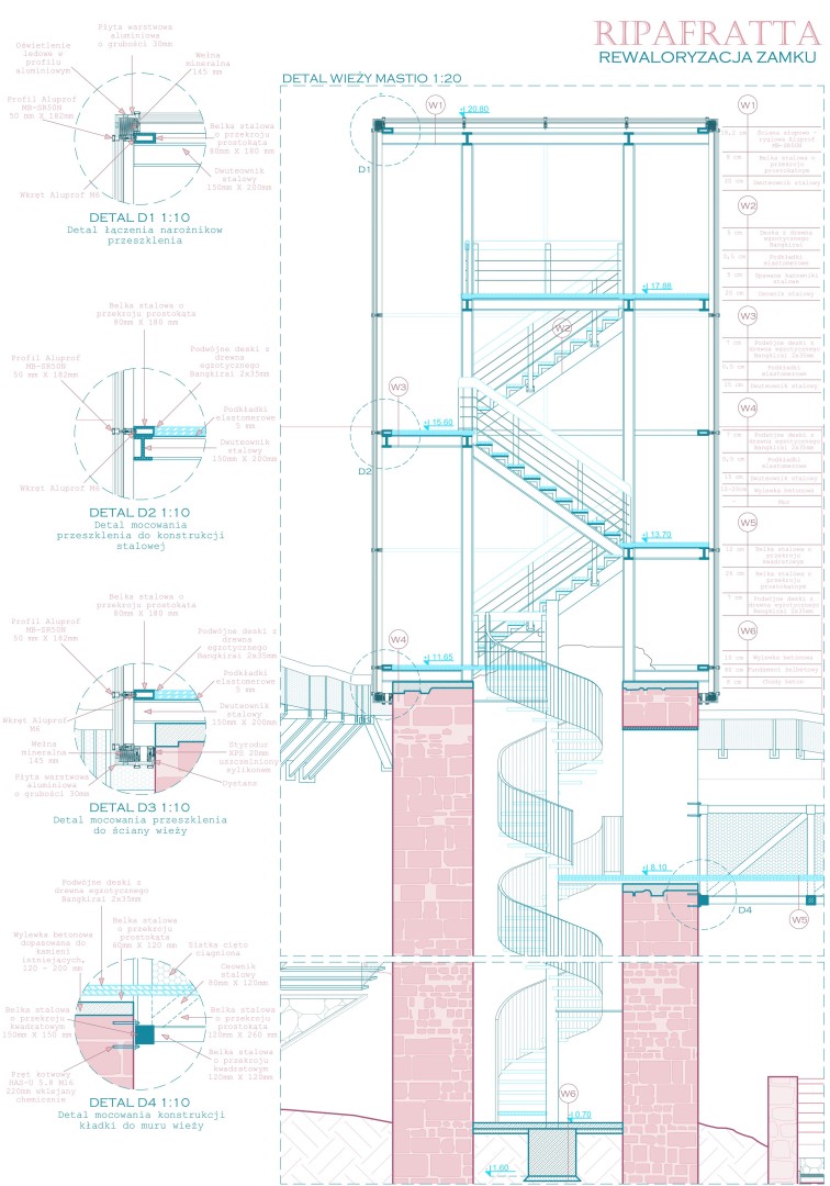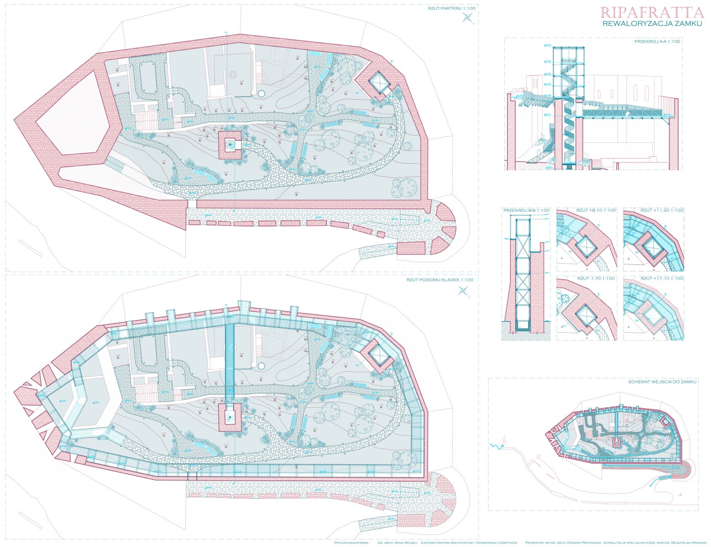 Praca dyplomowa koncentruje się na problematyce ochrony i rewaloryzacji obiektów zabytkowych w kontekście adaptacji zamków europejskich z okresu średniowiecza. Zakres opracowania obejmuje rewaloryzację średniowiecznego zamku Ripafratta (Rocca di San Paolino), zlokalizowanego na wzgórzu Vergario w Toskanii, jednego z istotnych, choć mało znanych obiektów obronnych regionu. Zamek, wznoszony etapami od X do XII wieku, pełnił kluczową rolę strategiczną na pograniczu wpływów Pizy i Lukki, a jego rozwój był ściśle związany z historią wioski Ripafratta oraz systemem rzeki Serchio. Obecnie obiekt znajduje się w stanie trwałej ruiny, jednak dobrze zachowane mury, wieże i relikty zabudowy pozwalają na czytelne odczytanie jego struktury przestrzennej oraz kolejnych faz historycznych. Praca obejmuje analizę historyczną, stratygraficzną i konserwatorską obiektu, a także ocenę jego stanu technicznego i wartości kulturowej. Główną ideą projektu jest ożywienie zamku poprzez udostępnienie go zwiedzającym jako punktu widokowego i rekreacyjnego, z poszanowaniem zasad konserwacji zabytków. Zaproponowano wprowadzenie lekkich, odwracalnych interwencji architektonicznych, takich jak stalowe kładki widokowe na murach, platformy i wieże widokowe, dostosowane również do potrzeb osób z niepełnosprawnościami. Projekt zakłada minimalną ingerencję w historyczną substancję, wykorzystanie materiałów kompatybilnych z zabytkiem oraz zachowanie integralności krajobrazowej wzgórza. Całość rozwiązań ma na celu zabezpieczenie i wyeksponowanie dziedzictwa zamku Ripafratta, nadając mu aktywną rolę kulturową i turystyczną w regionie.