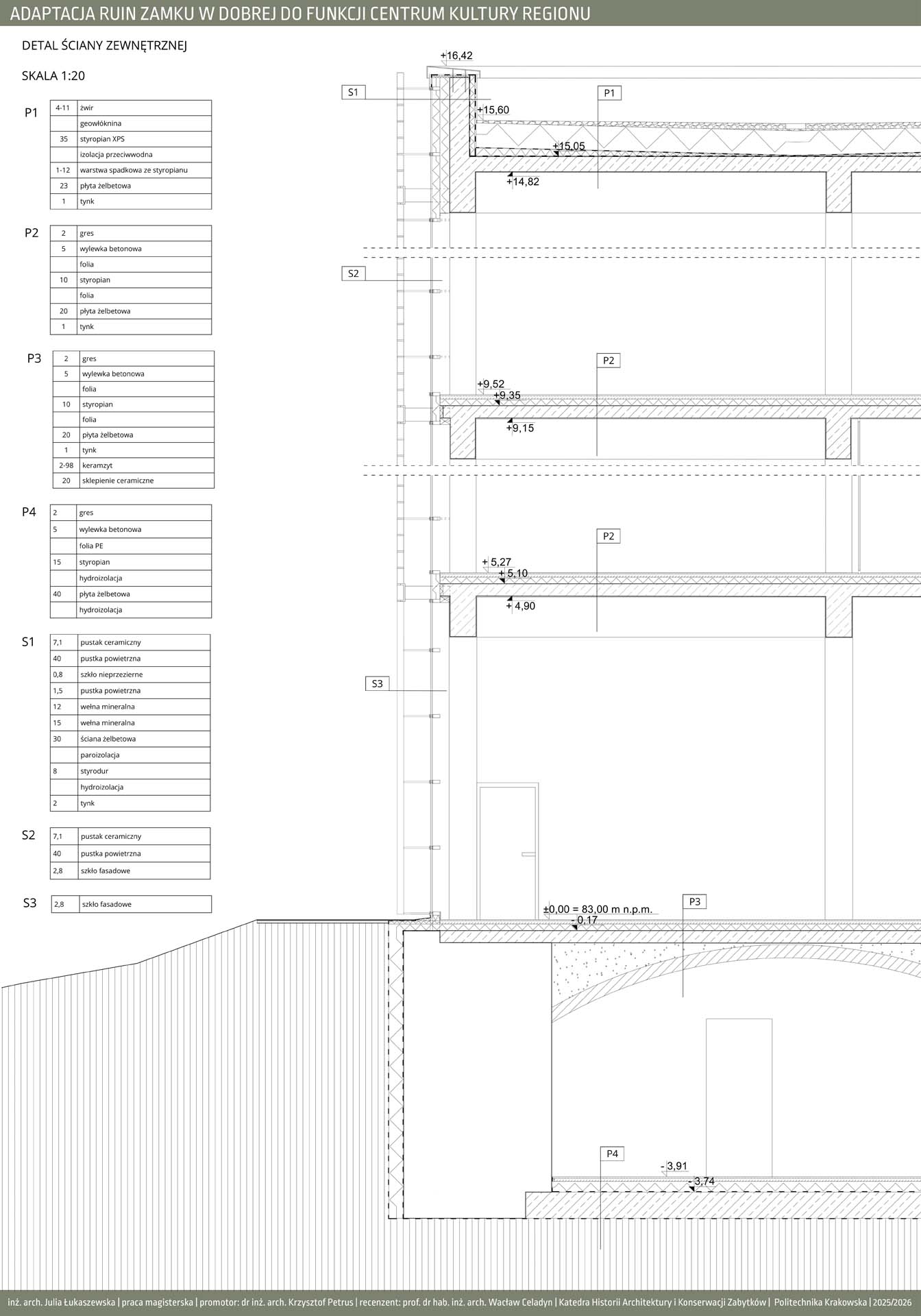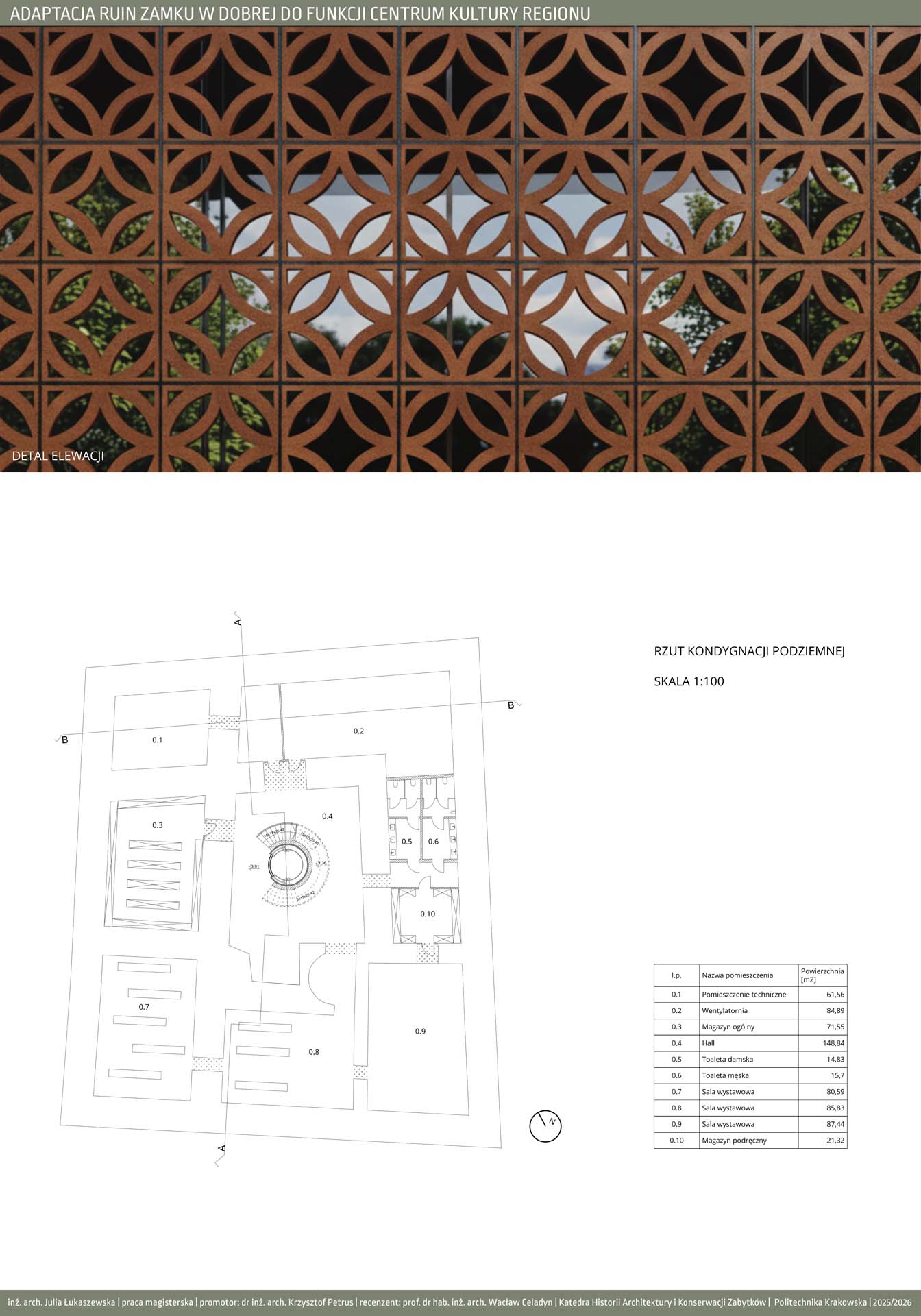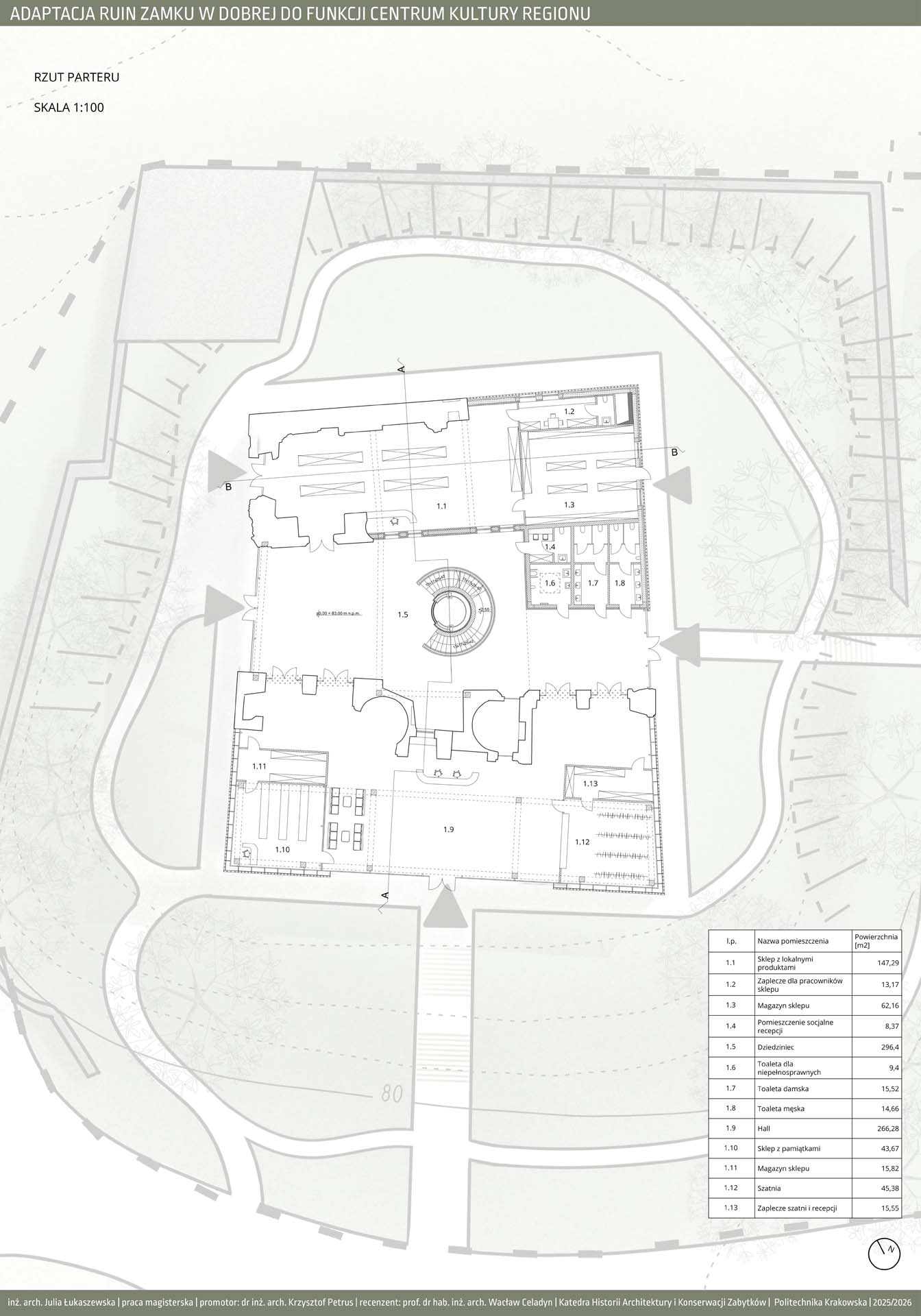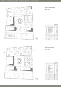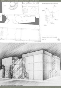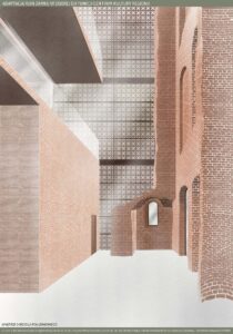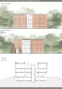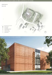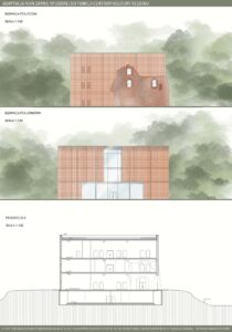 Program funkcjonalny obejmuje przestrzenie edukacyjne w postaci sal warsztatowych i wystawienniczych, umożliwiających prowadzenie zajęć, ekspozycji oraz działań popularyzujących historię i kulturę regionu. Uzupełnieniem są strefy wypoczynku, takie jak restauracja oraz bawialnia, sprzyjające codziennemu użytkowaniu obiektu. Ważnym elementem projektu jest także promocja lokalnej kultury poprzez salę konferencyjną oraz sklepy z lokalnymi produktami i pamiątkami, wspierające regionalnych twórców i rzemieślników. Forma architektoniczna opiera się na idei dialogu między dawną a współczesną architekturą. Zachowane mury zamku zostały wkomponowane w nowoczesną bryłę, której forma i detale nawiązują do historycznych tradycji architektonicznych Pomorza Zachodniego. Układ przestrzenny bazuje na historycznym rzucie budynku, z czytelnym dziedzińcem i zabudową w kształcie litery U. Zastosowane rozwiązania, takie jak otwory w stropach oraz wachlarzowa klatka schodowa, umożliwiają ekspozycję ruin na całej ich wysokości i podkreślają ciągłość historii miejsca. Projekt łączy ochronę dziedzictwa z nową funkcją społeczną, nadając ruinom trwałe i współczesne znaczenie. oraz część turystyczną, które koegzystują bezkolizyjnie. Projekt jest próbą stworzenia modelowej przestrzeni, która stymuluje rozwój dzieci poprzez bezpośredni kontakt z przyrodą, jednocześnie wspierając turystyczny potencjał regionu.