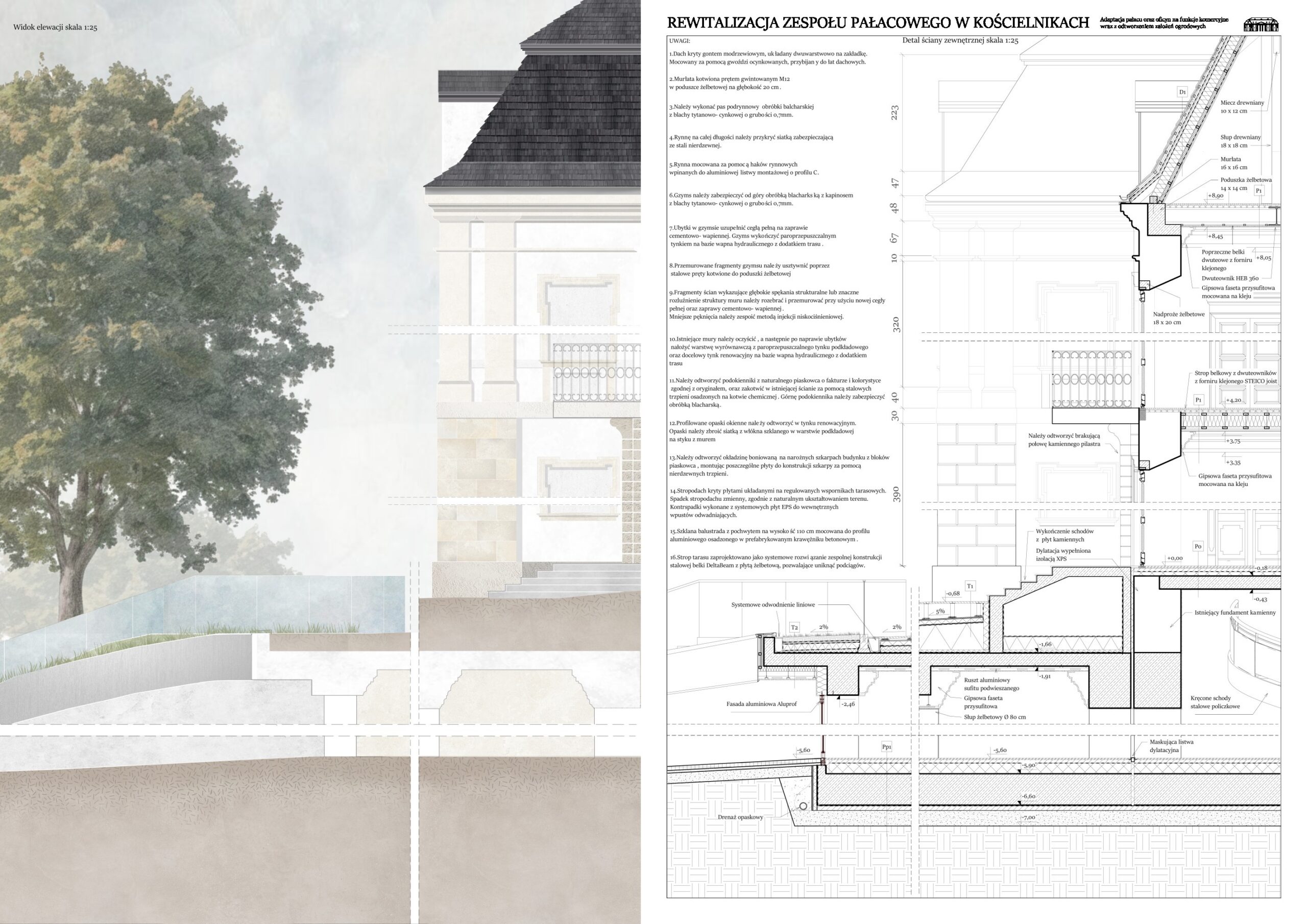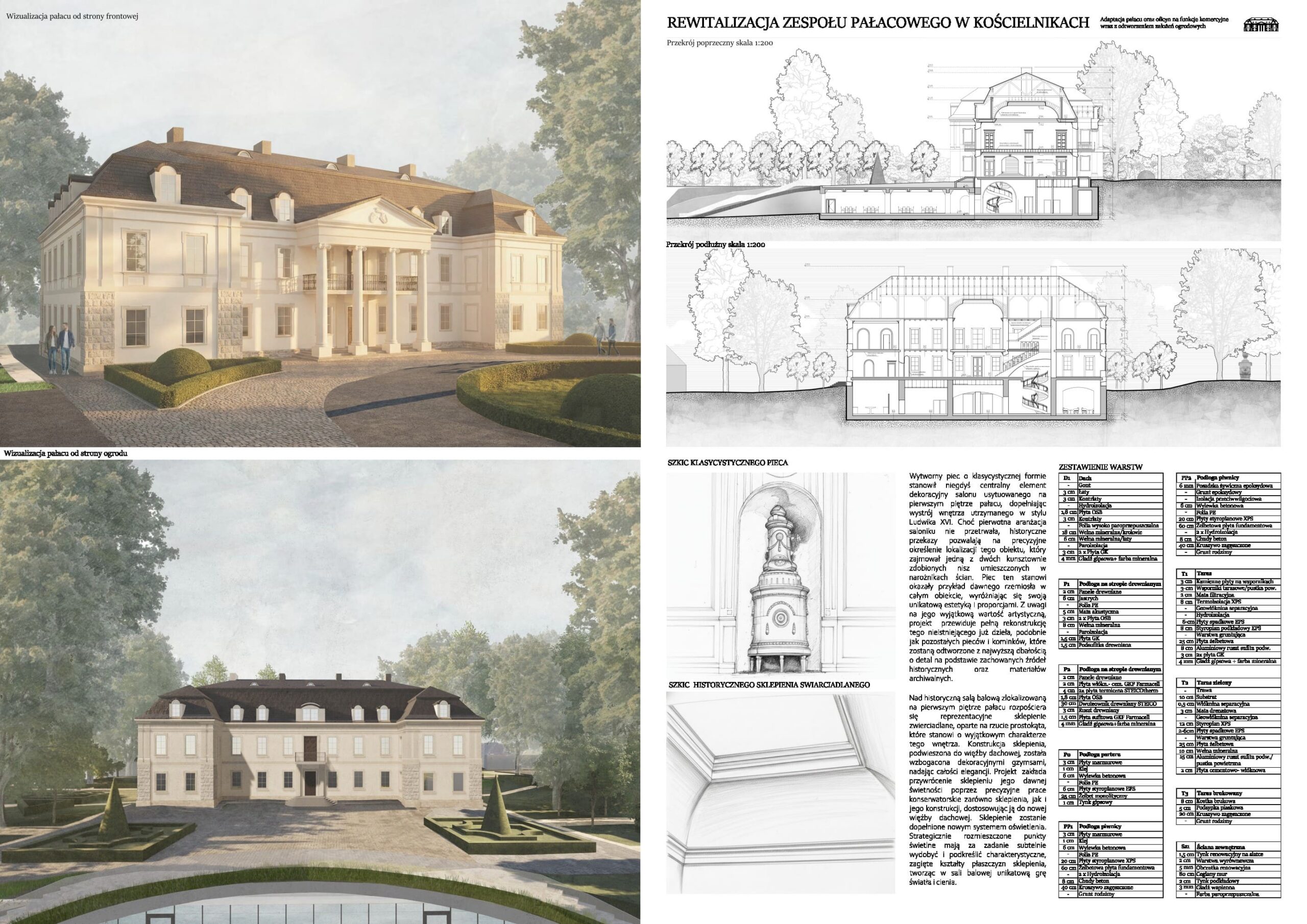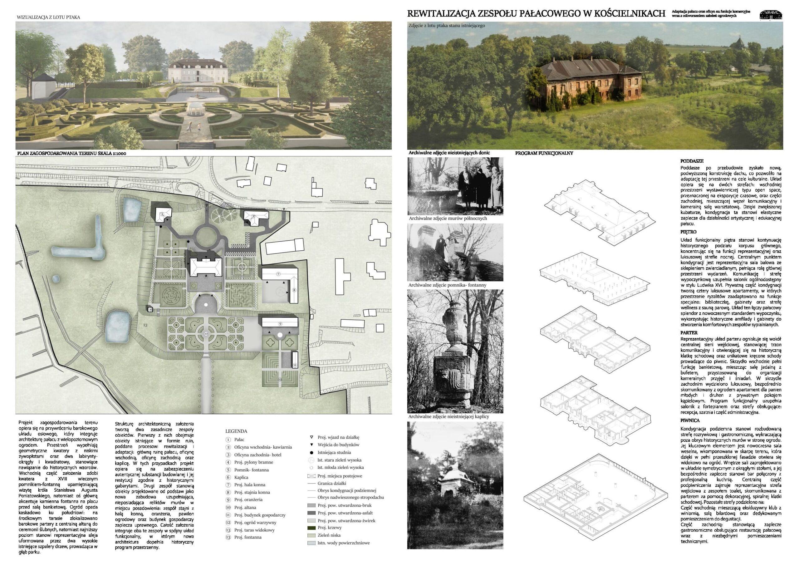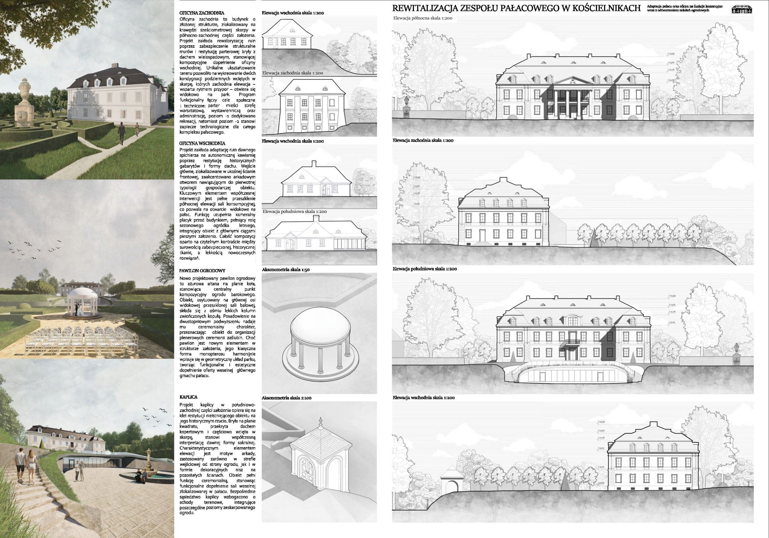 Niniejsza praca magisterska podejmuje problematykę rewitalizacji zabytkowych założeń rezydencjonalnych na przykładzie projektu adaptacji pałacu w Kościelnikach na funkcje komercyjne wraz z rewaloryzacją ogrodu. Integralną częścią pracy jest esej badawczy analizujący procesy adaptacji pałaców w Nakomiadach i Kurozwękach, który dowodzi, że kluczem do sukcesu inwestycji jest balans między ochroną autentyzmu a trwałością ekonomiczną. Równolegle, w oparciu o szczegółową dokumentację źródłową, opracowano studium historyczno-konserwatorskie pałacu w Kościelnikach, stanowiące merytoryczną podstawę działań projektowych. Zwieńczeniem pracy jest opis techniczny projektu, który łączy wytyczne konserwatorskie z wnioskami z analizy porównawczej, proponując wprowadzenie nowych funkcji użytkowych przy jednoczesnym odtworzeniu założeń ogrodowych. Całość opracowania wskazuje drogę do przywrócenia historycznej tożsamości zdegradowanego pałacu oraz obiektów znajdujących się na terenie zespołu pałacowego i