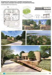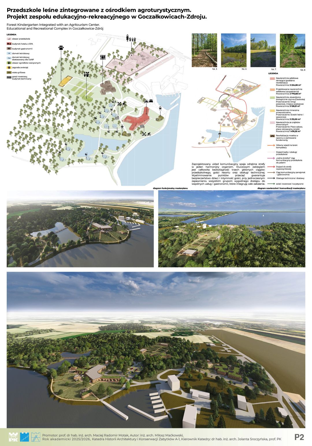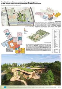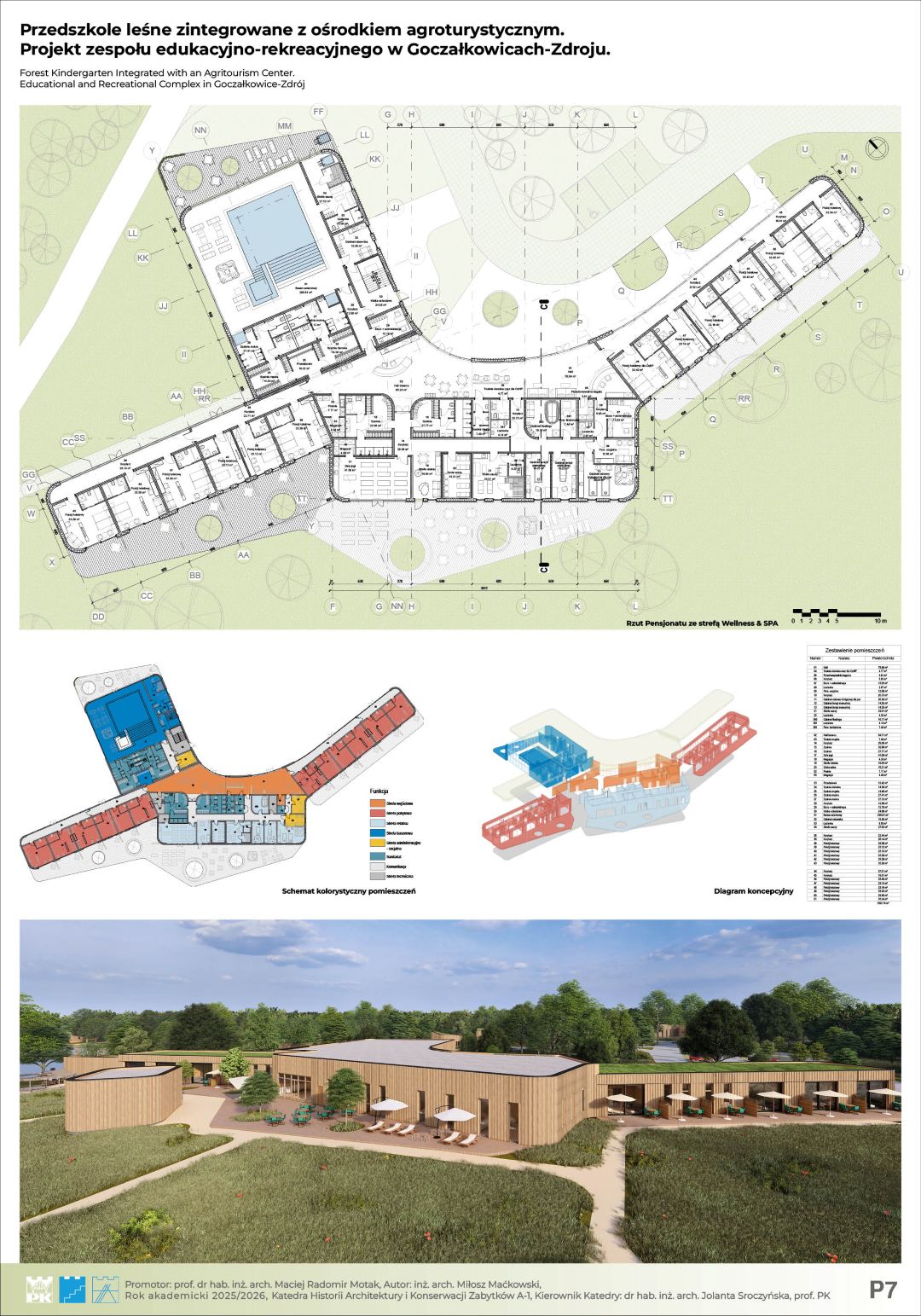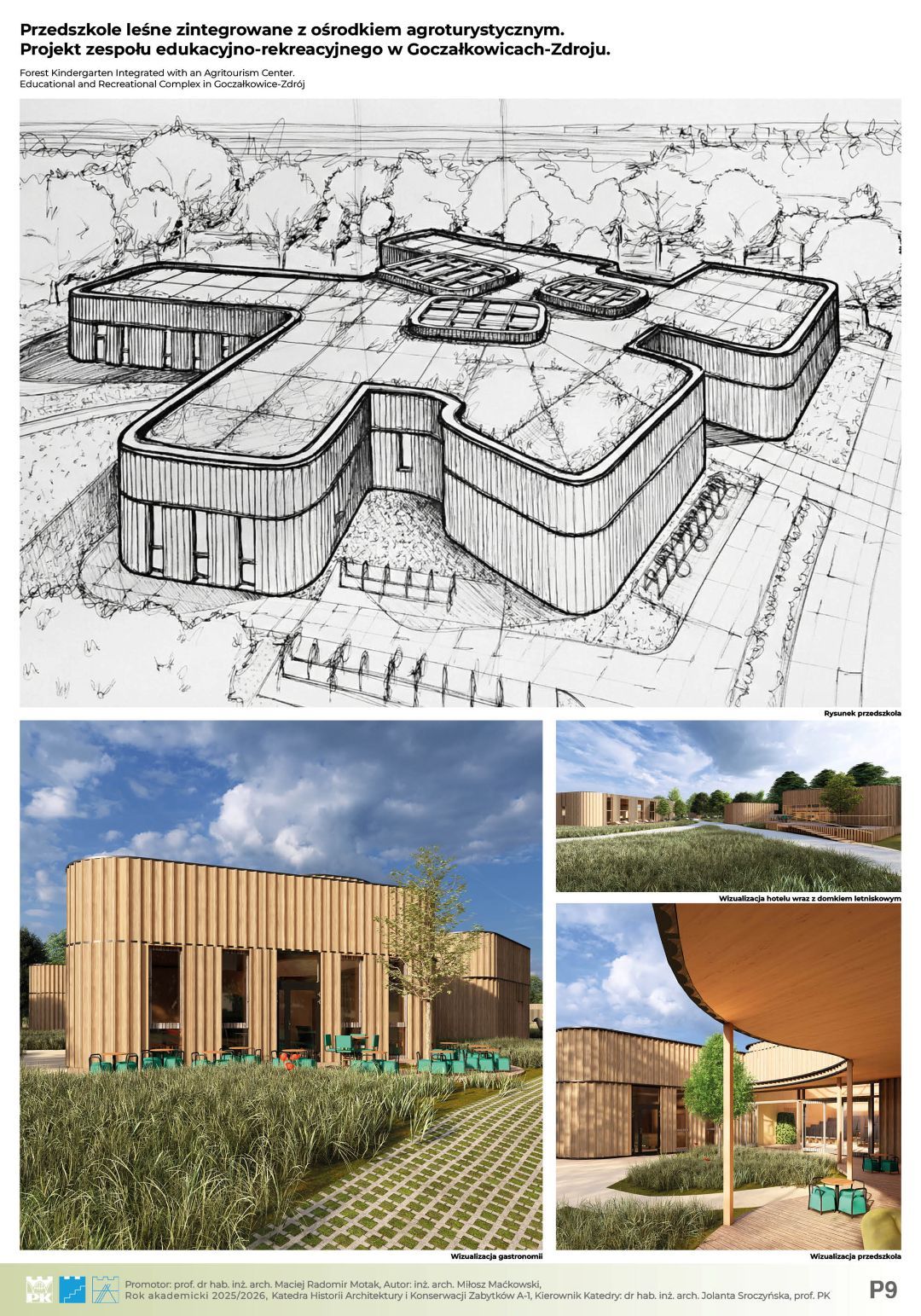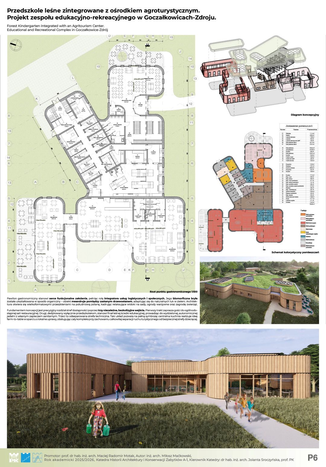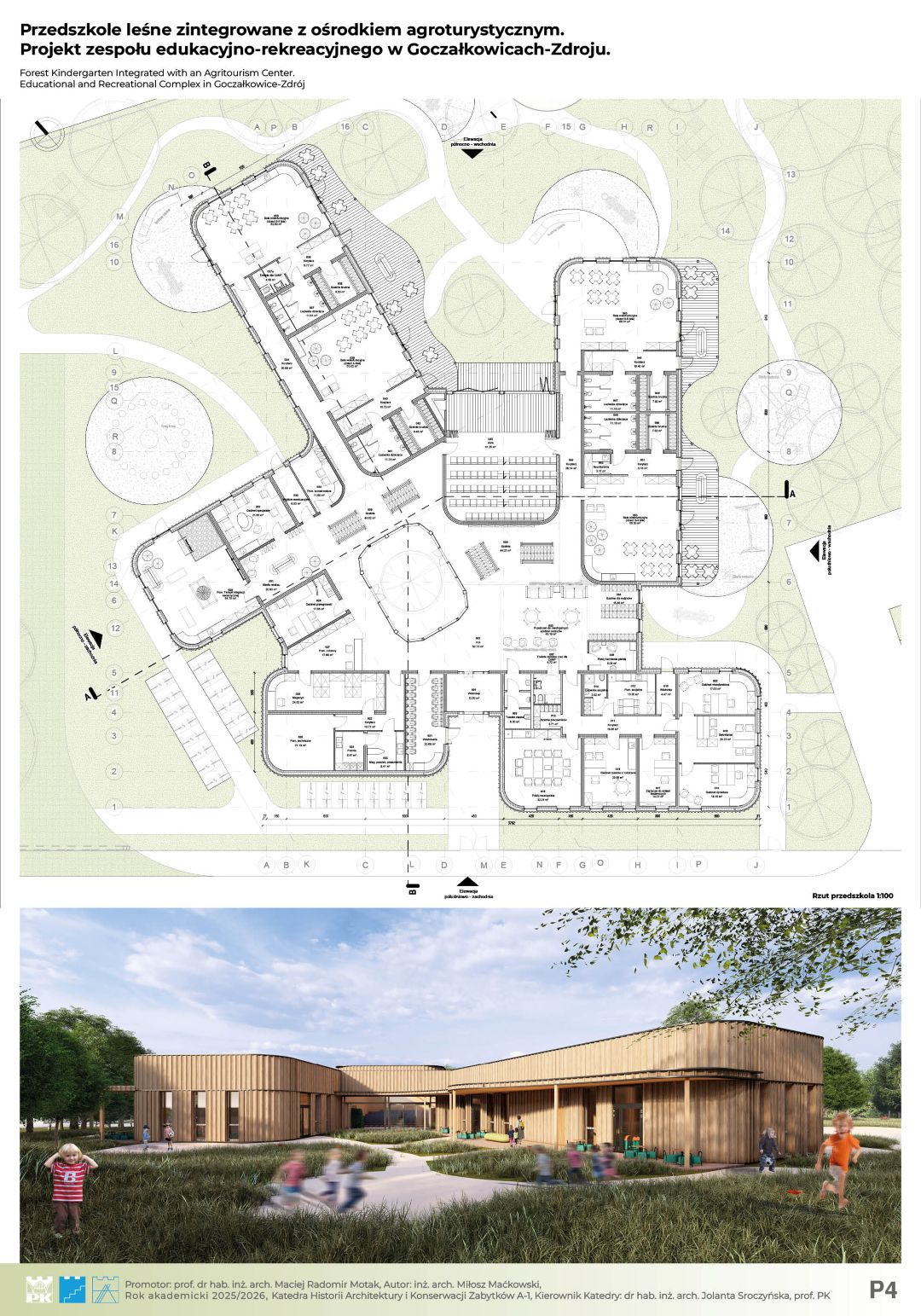 Głównym założeniem projektu jest architektoniczna odpowiedź na zjawisko „zespołu deficytu natury” (Richard Louv) oraz próba przywrócenia więzi człowieka ze środowiskiem naturalnym poprzez nowoczesną edukację. Projekt, zlokalizowany w uzdrowiskowej gminie Goczałkowice-Zdrój, stanowi innowacyjną hybrydę funkcjonalną, łączącą przedszkole leśne z ośrodkiem agroturystycznym oraz strefą Wellness & SPA. Koncepcja całego ośrodka to hołd dla zastanego krajobrazu. Organiczna, miękka forma budynku dosłownie meandruje pomiędzy istniejącym drzewostanem, precyzyjnie wypełniając luki w zieleni. Dzięki temu zabiegowi udało się zachować cenny starodrzew, a architektura staje się integralną częścią leśnego ekosystemu, zamiast go dominować. Całość dopełnia proekologiczna konstrukcja z drewna CLT oraz elewacje z naturalnych lameli, które wizualnie spajają obiekt z otoczeniem. Kompozycja funkcjonalna opiera się na trzech filarach: budynku przedszkola, części noclegowej (pensjonat) oraz spajającym całość centralnym pawilonie gastronomicznym, który stanowi serce całego założenia i miejsce integracji. Kluczowym aspektem projektu jest unikalna symbioza edukacji i rekreacji. Wychowankowie przedszkola czerpią pełnymi garściami z dobrodziejstw agroturystyki – mają bezpośredni, edukacyjny kontakt z zagrodą dla zwierząt, szklarniami i ogrodami warzywnymi. Jednocześnie, dzięki przemyślanemu strefowaniu, przedszkole pozostaje bezpieczną, niezależną enklawą. Zastosowane rozwiązania przestrzenne zapewniają dzieciom prywatność i swobodę, całkowicie eliminując kolizje z ruchem turystycznym. Projekt udowadnia, że możliwe jest stworzenie przestrzeni, która stymuluje rozwój najmłodszych, wspierając jednocześnie turystyczny potencjał regionu.