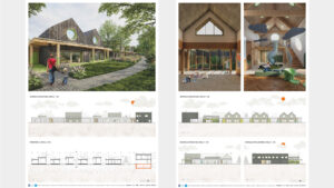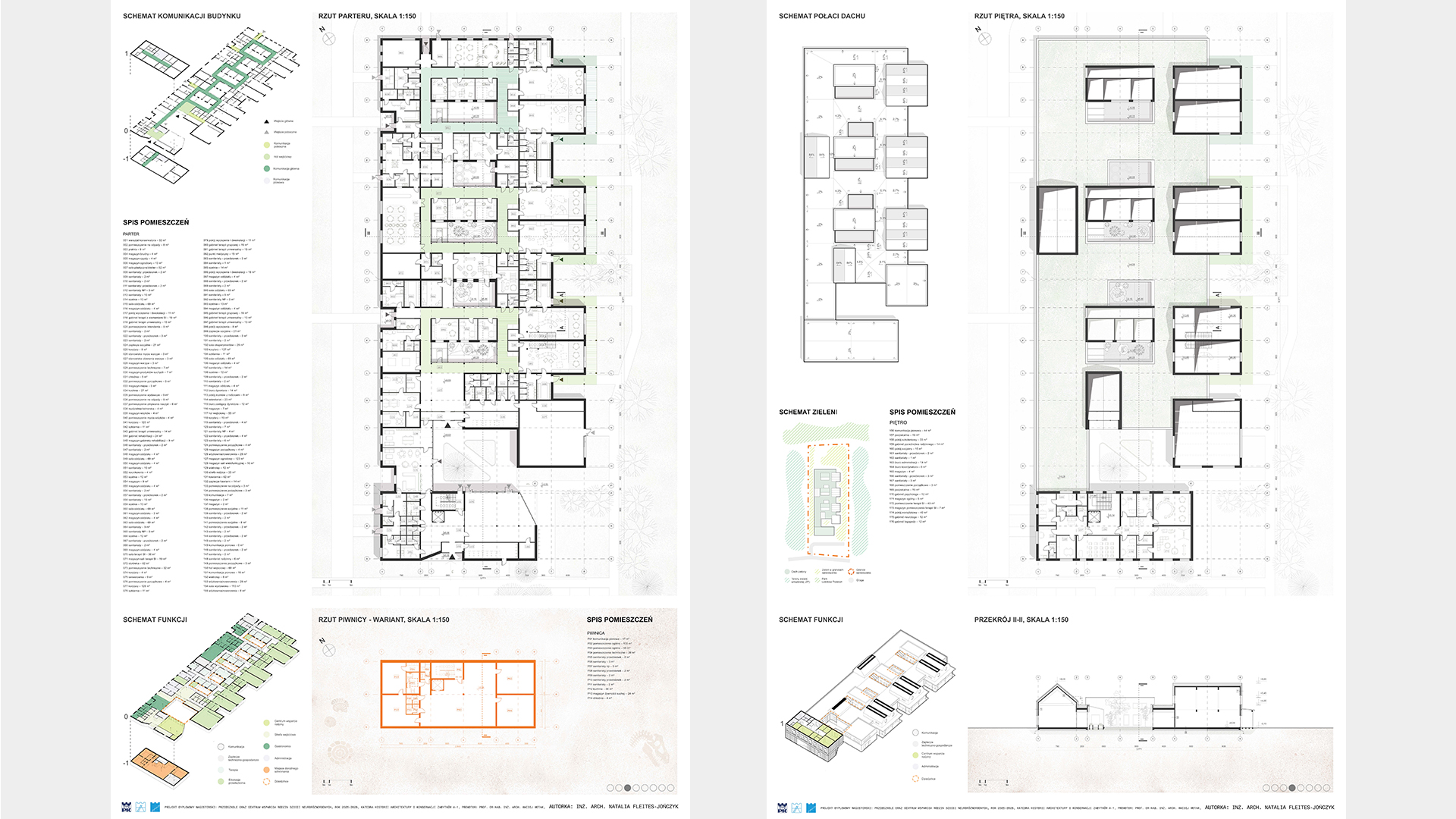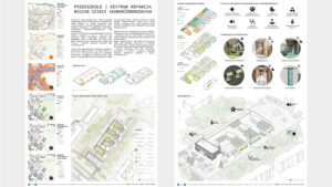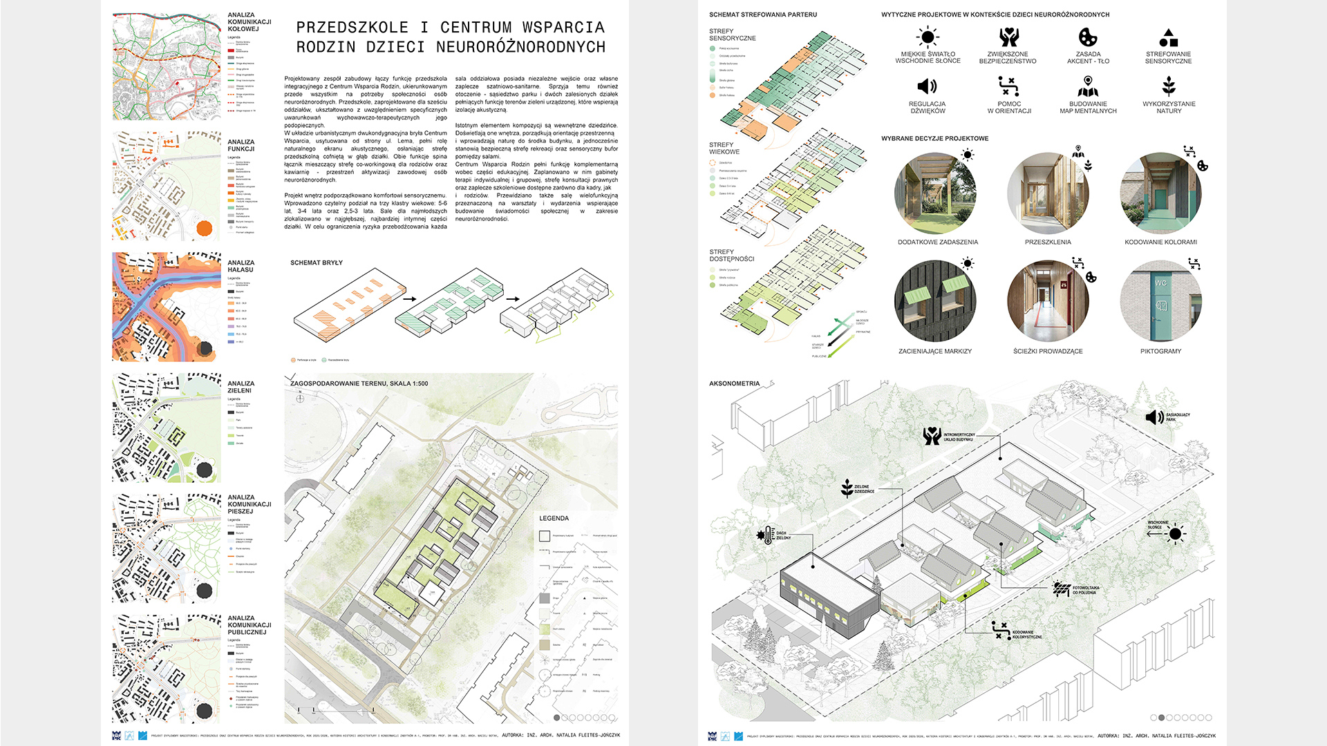 Ustalenia przełożono na projekt przedszkola integracyjno-specjalistycznego z Centrum Wsparcia Rodzin Dzieci Neuroróżnorodnych, zlokalizowanego w Krakowie przy Parku Lotników Polskich. Koncepcja zakłada wprowadzenie czytelnego gradientu bodźców: od stref głośnych i aktywnych po miejsca wyciszenia, oddzielone buforami ograniczającymi przenikanie wrażeń. Zastosowano rozwiązania ułatwiające orientację (wayfinding), wzmocniono kontakt z zielenią oraz przewidziano konstrukcję CLT i materiały naturalne, aby uzyskać środowisko odbierane jako ciepłe i bezpieczne. Rozrzeźbienie bryły i nawiązanie do archetypu domu służy oswojeniu skali obiektu oraz podkreśleniu jego funkcji edukacyjnej i terapeutycznej, w tym wsparcia budowania kompetencji społecznych całych rodzin.