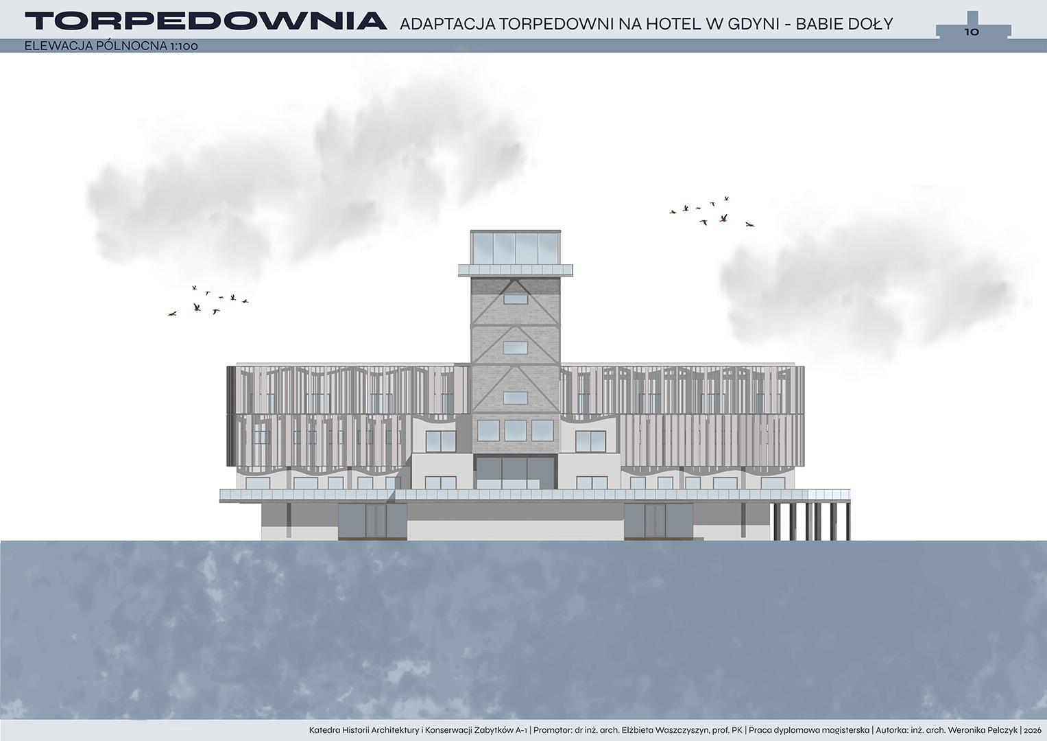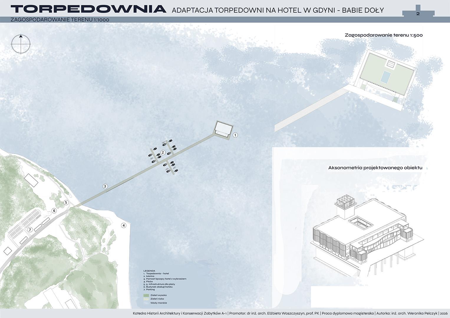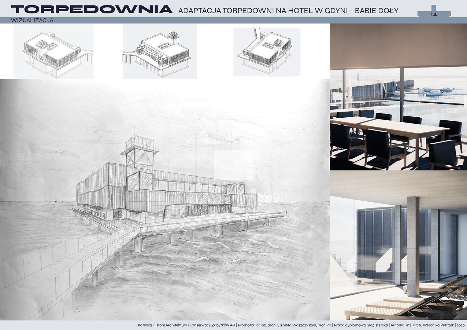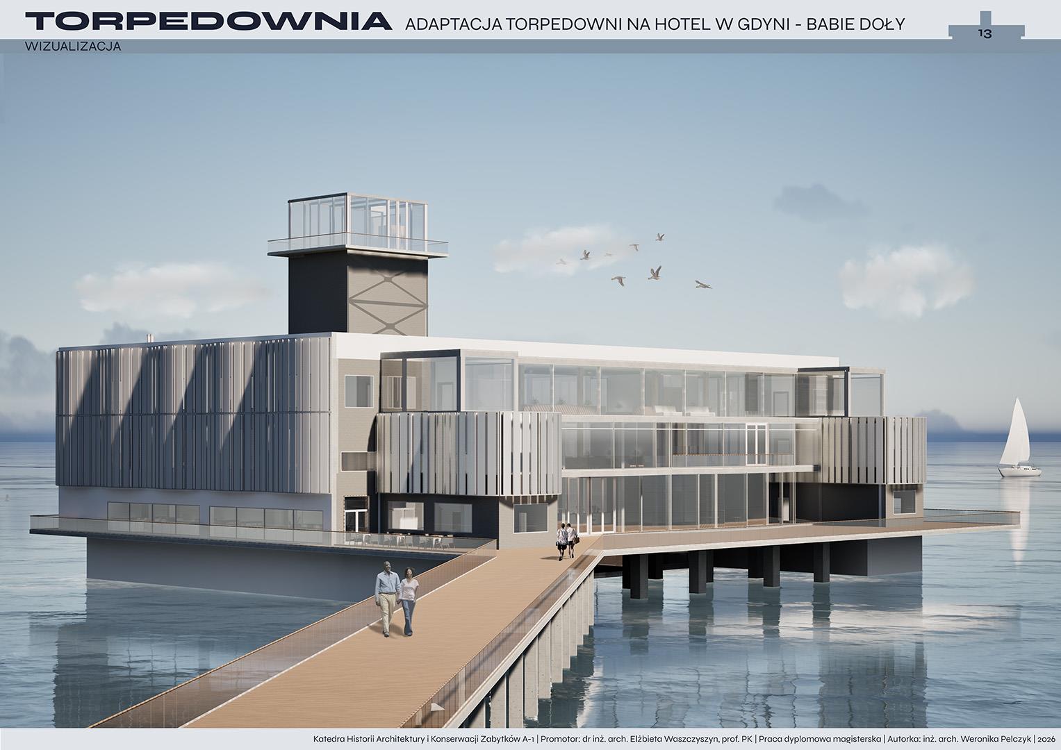 Tematem pracy dyplomowej jest adaptacja torpedowni na funkcję hotelową. Projekt zakłada przywrócenie życia obiektowi, który od lat pozostaje w stanie ruiny, a jednocześnie niezmiennie fascynuje i intryguje mieszkańców oraz turystów. Nowa funkcja ma na celu ponowne włączenie torpedowni w strukturę miasta i uczynienie jej dostępną dla użytkowników.