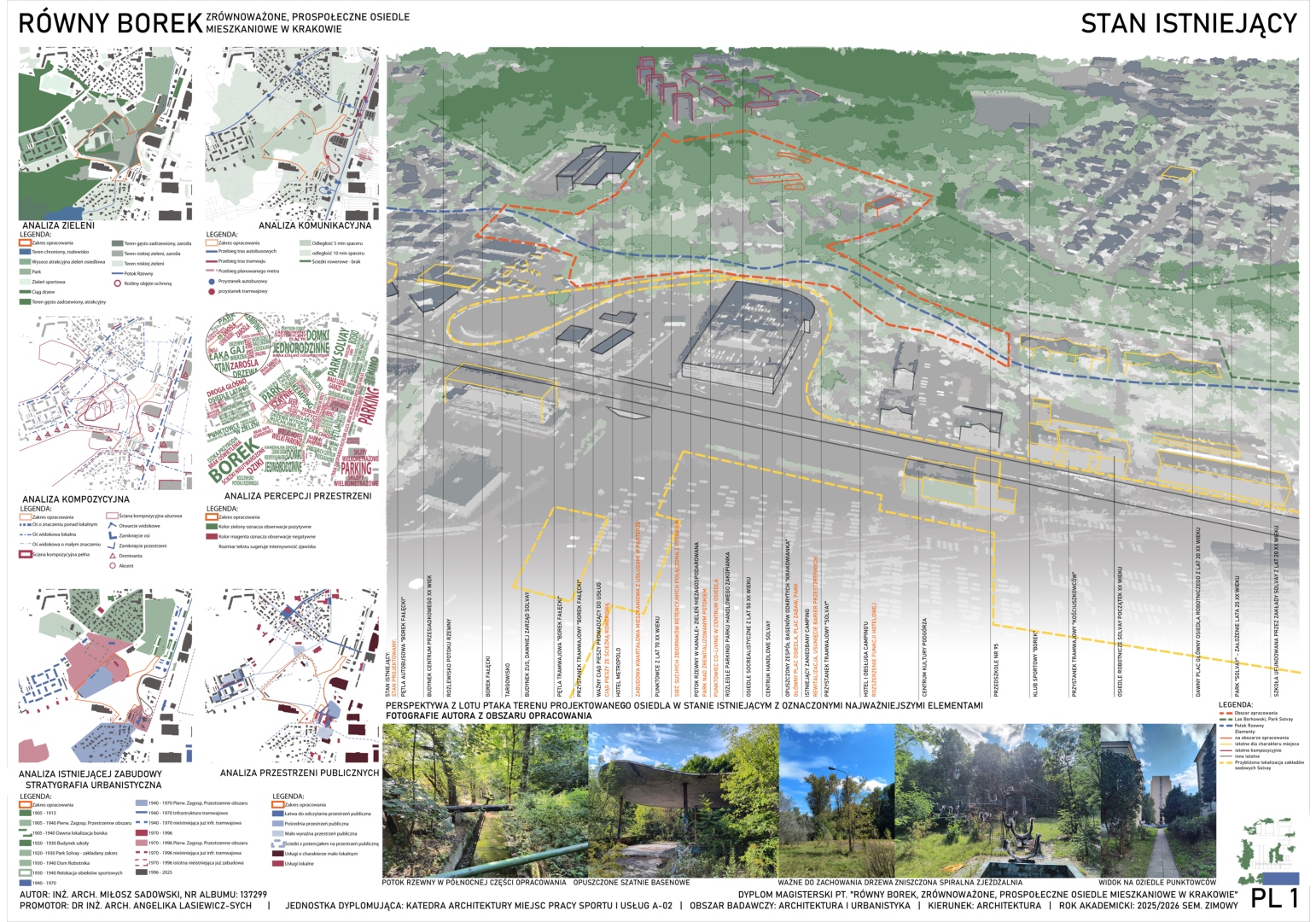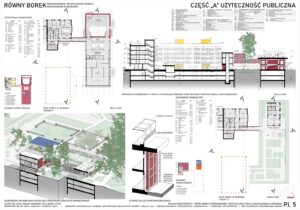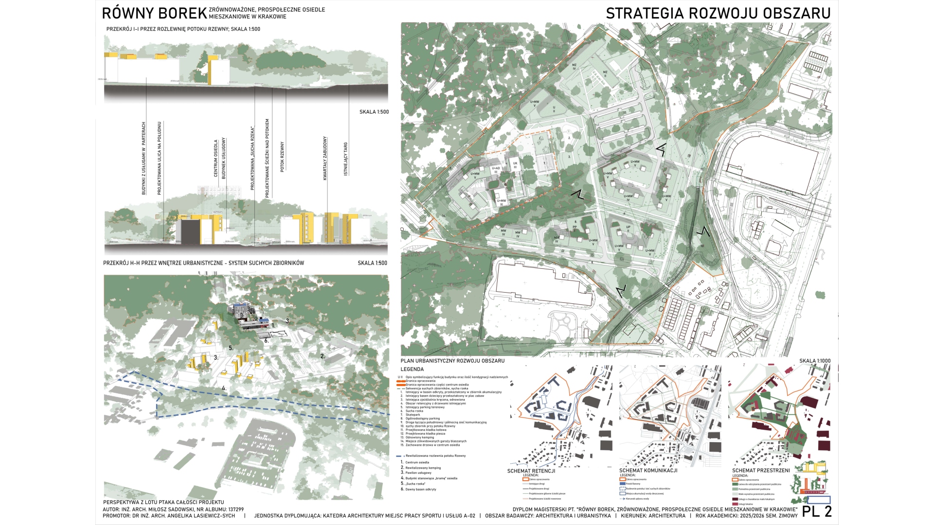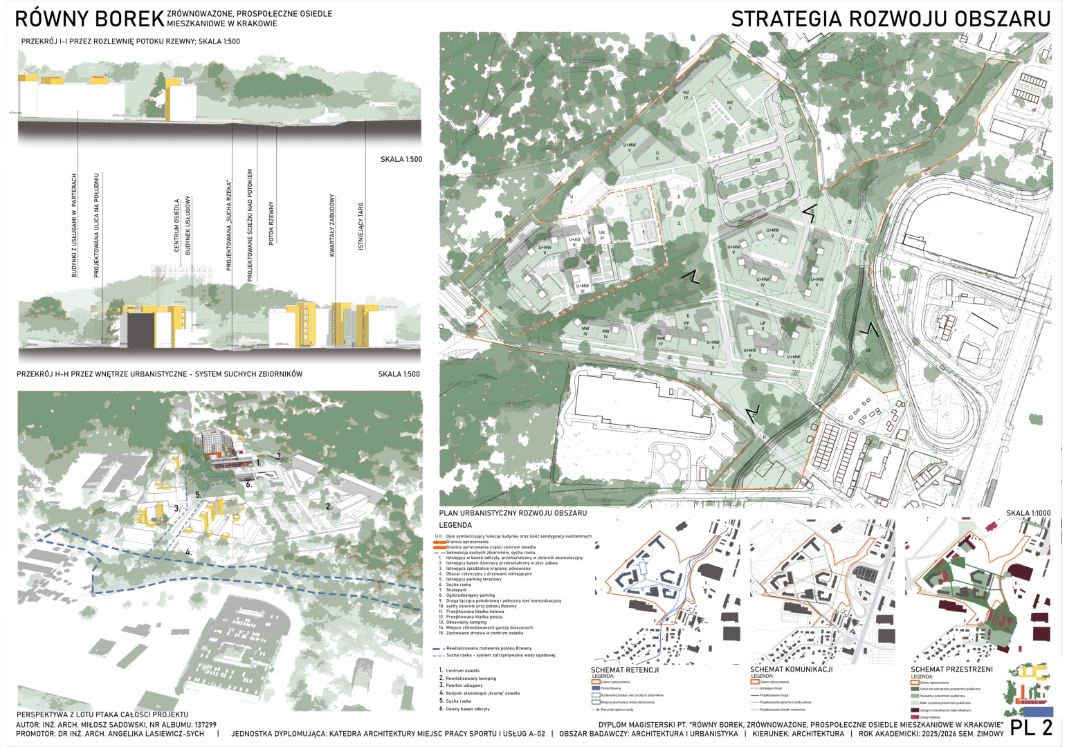 Projekt obejmuje zagospodarowanie terenu blisko Borku Fałęckiego w Krakowie w celu powstania zrównoważonego, pro-społecznego osiedla mieszkaniowego z funkcjami kulturowymi i usługami oraz towarzyszącymi obiektami budowlanymi. Zaprojektowano zabudowę w układzie przeważająco kwartałowym. Cześć z lokali projektowanych na osiedlu stanowi strukturę mieszkaniową co-living. W centrum założenia znajduje się zrewitalizowany obszar opuszczonego basenu otwartego, przekształconego w obszerny zbiornik akumulacyjny wody deszczowej wraz z parkiem, skateparkiem, placem zabaw oraz pawilonem handlowym. Osiedle przecina sucha rzeka, która ma pozwolić na akumulację wody opadowej. Projekt zakłada również powstanie budynku hybrydowego w centralnej części osiedla łączącego funkcję publiczną ogólnodostępną ze współdzielonymi przestrzeniami dla mieszkańców oraz strefami mieszkalnymi.