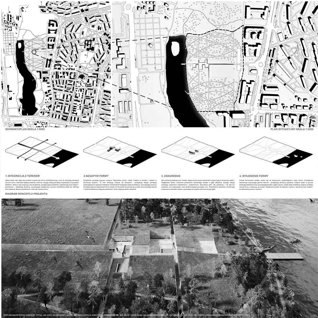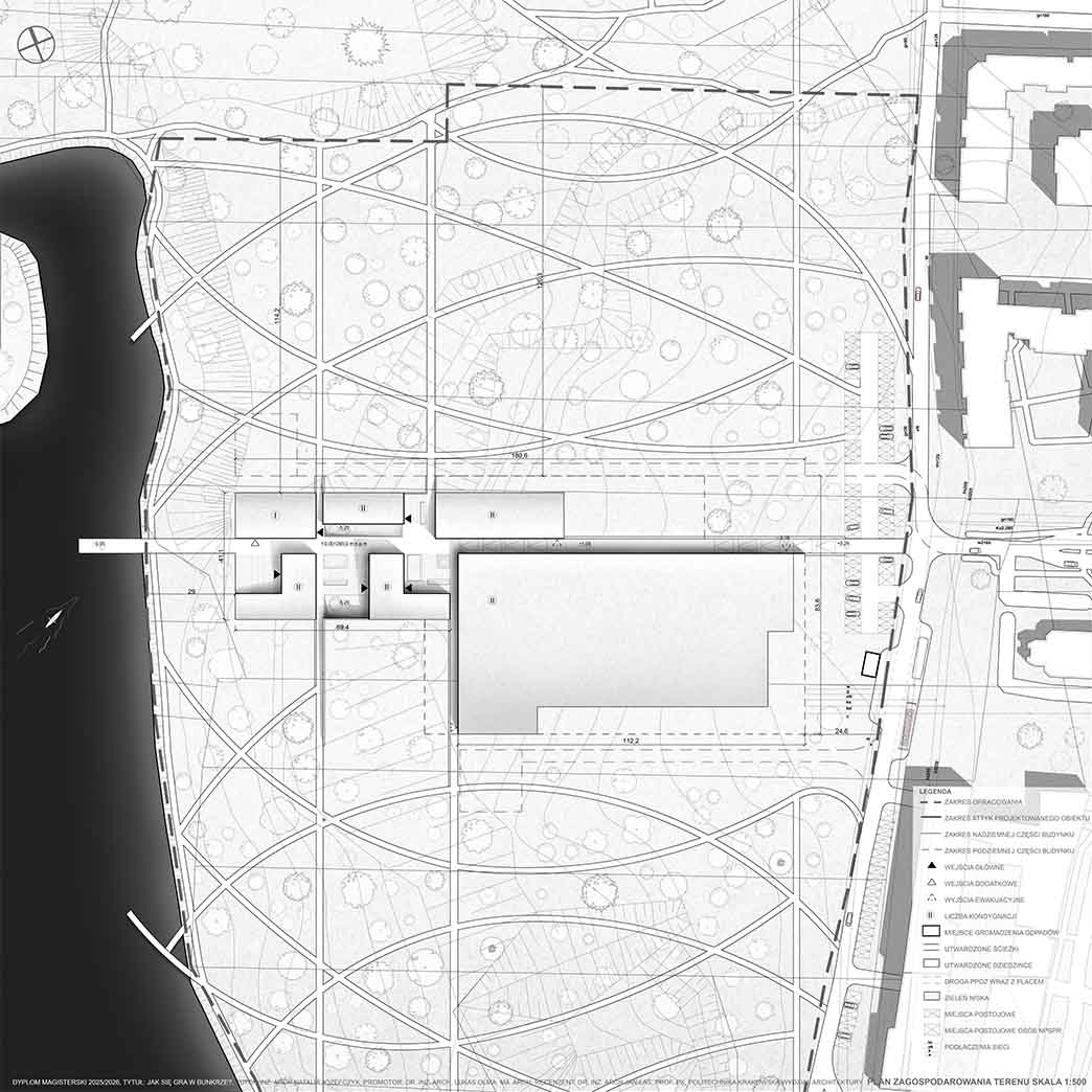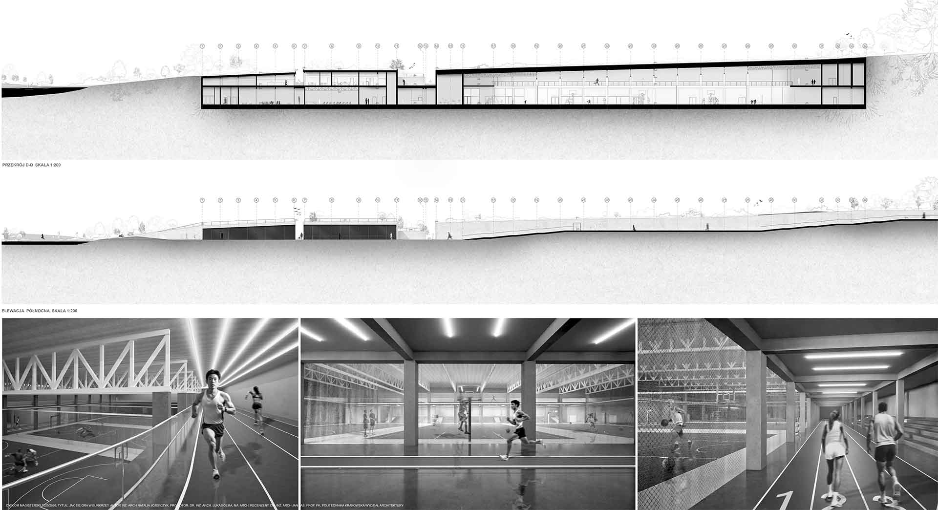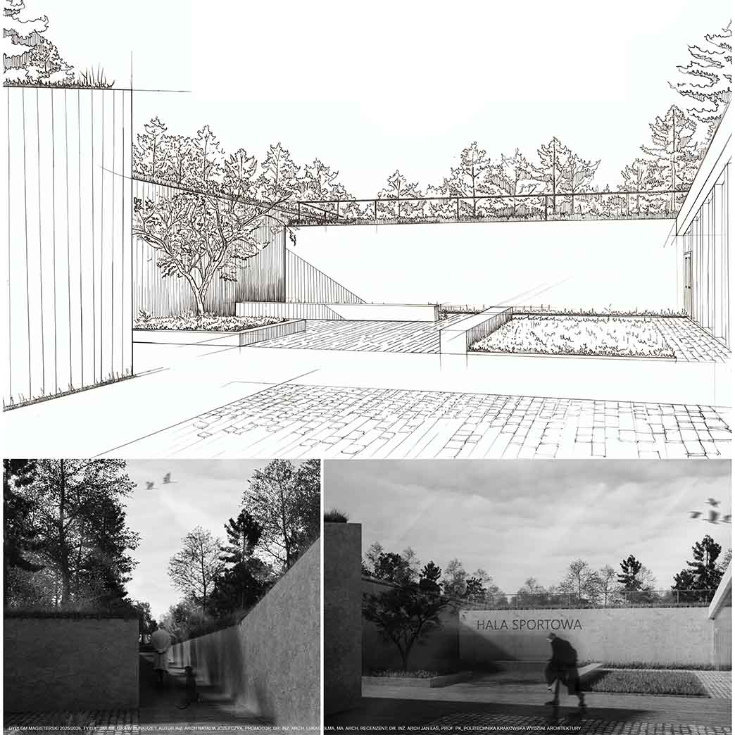 Projekt stanowi odpowiedź na współczesne wyzwania związane ze zmianami klimatycznymi, rosnącymi napięciami społeczno-politycznymi oraz koniecznością ponownego włączenia tematyki ochrony ludności w strukturę miasta. W oparciu o aktualne przepisy oraz lokalne potrzeby zaprojektowano obiekt sportowy o funkcji hybrydowej, łączący codzienną architekturę publiczną z funkcją schronu zbiorowego. Ideą projektu jest odejście od modelu odizolowanego, ukrytego schronu na rzecz obiektu powszechnie znanego, dostępnego i oswojonego przez użytkowników w codziennym życiu. Projektowany obiekt zlokalizowany został w Kielcach, w bezpośrednim sąsiedztwie Zalewu Kieleckiego oraz intensywnej zabudowy mieszkaniowej. Lokalizacja charakteryzuje się dużą gęstością zaludnienia oraz brakiem ogólnodostępnej hali sportowej o stałej kubaturze i jednoczesnym niedoborem miejsc schronienia w sytuacjach nadzwyczajnych. Obiekt stanowi uzupełnienie struktury miejskiej, wzmacniając lokalną odporność społeczną. Forma architektoniczna obiektu została wpisana w istniejącą rzeźbę terenu i krajobraz naturalny, bez tworzenia dominanty przestrzennej. Czytelna oś piesza prowadzi użytkownika do głównego dziedzińca, integrującego budynek z otaczającym terenem. Projektowana sieć tras pieszo-rowerowych wyprowadza funkcję sportową poza bryłę obiektu, podkreślając jego otwarty i społeczny charakter. Projekt jest próbą syntezy architektury codziennej z architekturą ochronną oraz odpowiedzią na pytanie o możliwość trwałego połączenia tych funkcji w jednym, elastycznym obiekcie. W czasie codziennego użytkowania obiekt pełni funkcję ogólnodostępnej przestrzeni sportowo-rekreacyjnej, wspierającej zdrowie i integrację społeczną. W sytuacjach kryzysowych przekształca się w schron zbiorowy. Elastyczna przestrzeń hali sportowej umożliwia szybkie wdrożenie modularnego układu schronienia, zapewniającego odpowiednie warunki bytowe, sanitarne oraz medyczne. Projekt proponuje kierunek rozwoju architektury przyszłości, w której wielofunkcyjność i adaptacyjność stają się podstawowymi narzędziami budowania bezpieczeństwa i odporności miasta.