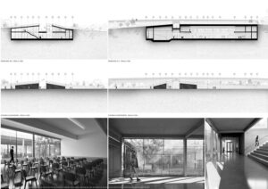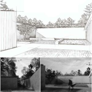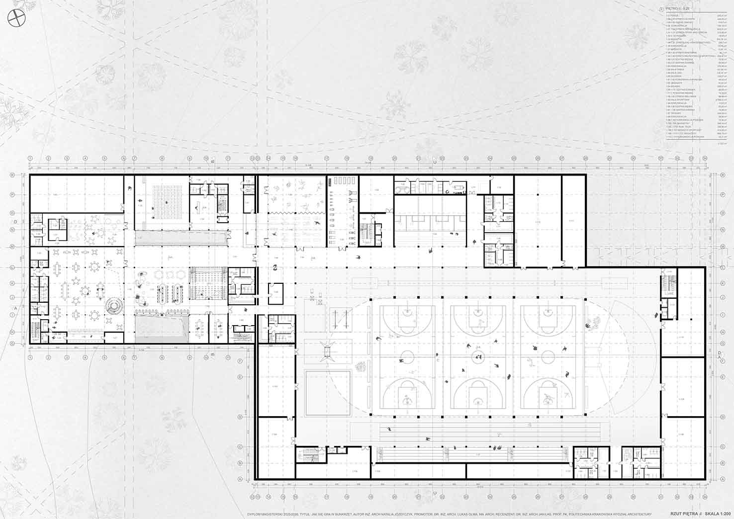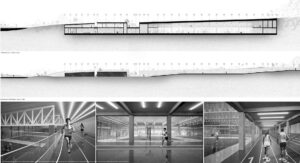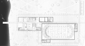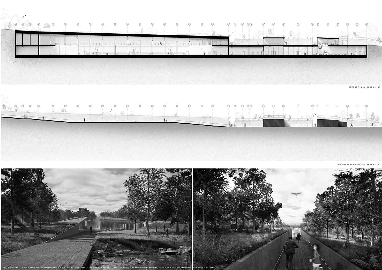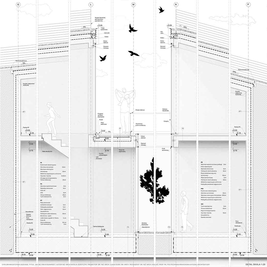Projekt stanowi odpowiedź na współczesne wyzwania związane ze zmianami klimatycznymi, rosnącymi napięciami społeczno-politycznymi oraz koniecznością ponownego włączenia tematyki ochrony ludności w strukturę miasta. W oparciu o aktualne przepisy oraz lokalne potrzeby zaprojektowano obiekt sportowy o funkcji hybrydowej, łączący codzienną architekturę publiczną z funkcją schronu zbiorowego. Ideą projektu jest odejście od modelu odizolowanego, ukrytego schronu na rzecz obiektu powszechnie znanego, dostępnego i oswojonego przez użytkowników w codziennym życiu. Projektowany obiekt zlokalizowany został w Kielcach, w bezpośrednim sąsiedztwie Zalewu Kieleckiego oraz intensywnej zabudowy mieszkaniowej. Lokalizacja charakteryzuje się dużą gęstością zaludnienia oraz brakiem ogólnodostępnej hali sportowej o stałej kubaturze i jednoczesnym niedoborem miejsc schronienia w sytuacjach nadzwyczajnych. Obiekt stanowi uzupełnienie struktury miejskiej, wzmacniając lokalną odporność społeczną. Forma architektoniczna obiektu została wpisana w istniejącą rzeźbę terenu i krajobraz naturalny, bez tworzenia dominanty przestrzennej. Czytelna oś piesza prowadzi użytkownika do głównego dziedzińca, integrującego budynek z otaczającym terenem. Projektowana sieć tras pieszo-rowerowych wyprowadza funkcję sportową poza bryłę obiektu, podkreślając jego otwarty i społeczny charakter. Projekt jest próbą syntezy architektury codziennej z architekturą ochronną oraz odpowiedzią na pytanie o możliwość trwałego połączenia tych funkcji w jednym, elastycznym obiekcie. W czasie codziennego użytkowania obiekt pełni funkcję ogólnodostępnej przestrzeni sportowo-rekreacyjnej, wspierającej zdrowie i integrację społeczną. W sytuacjach kryzysowych przekształca się w schron zbiorowy. Elastyczna przestrzeń hali sportowej umożliwia szybkie wdrożenie modularnego układu schronienia, zapewniającego odpowiednie warunki bytowe, sanitarne oraz medyczne. Projekt proponuje kierunek rozwoju architektury przyszłości, w której wielofunkcyjność i adaptacyjność stają się podstawowymi narzędziami budowania bezpieczeństwa i odporności miasta.