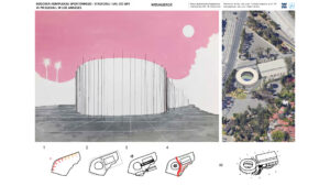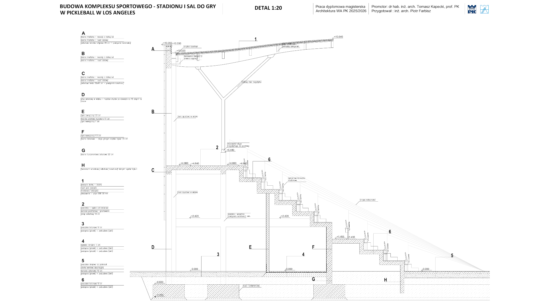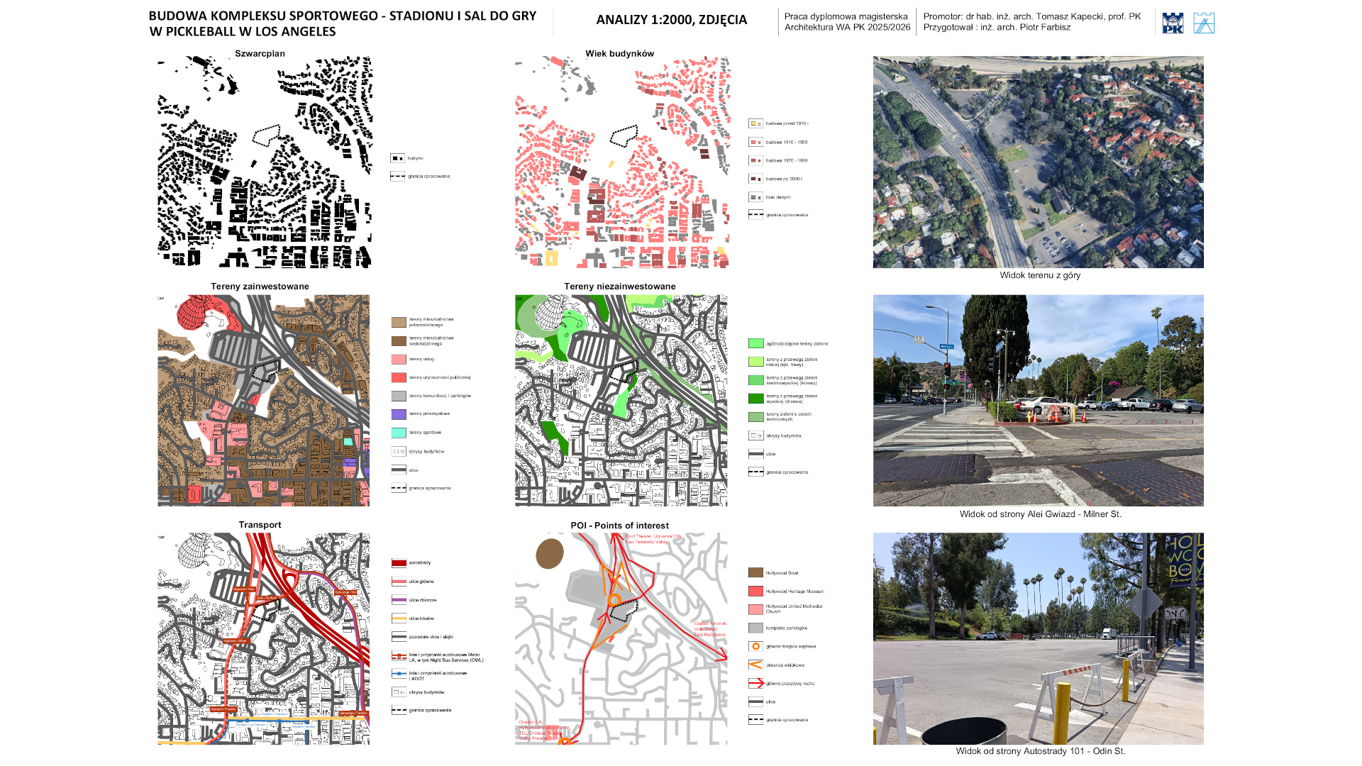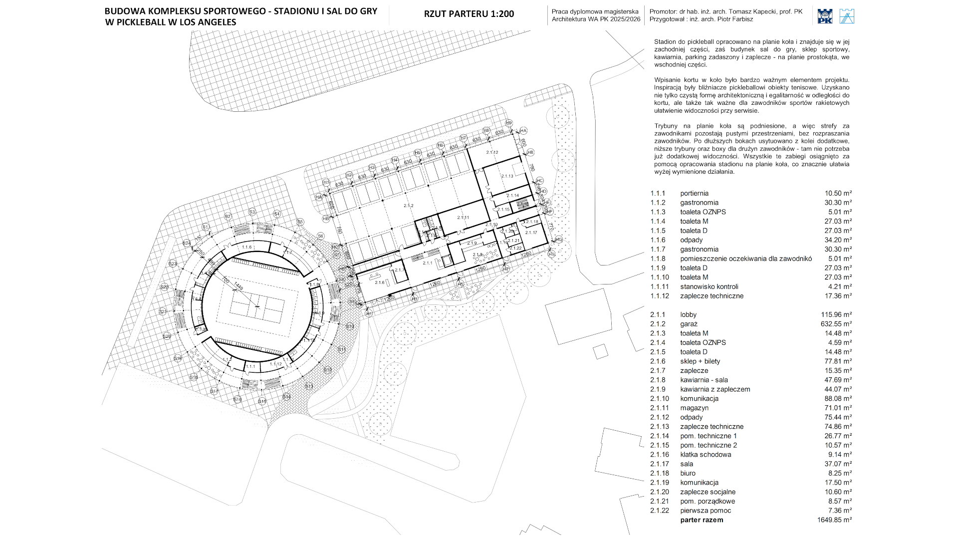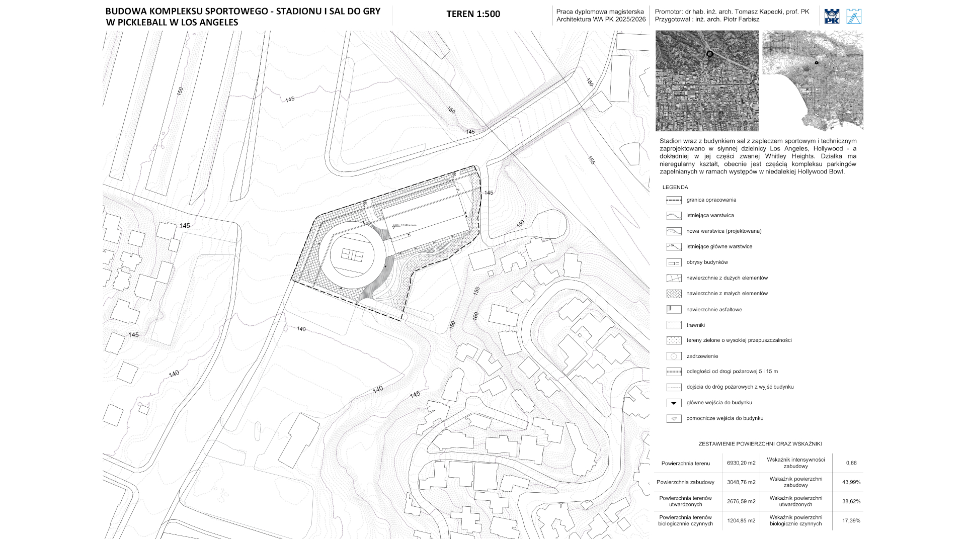 Zaprojektowano stadion oraz budynek z salami do pickleball i zapleczem sportowym i technicznym, w dzielnicy Los Angeles, Hollywood, w Kaliforni w Stanach Zjednoczonych. Kompleks zaplanowano w miejscu jednego z parkingów przynależących do pobliskiego amfiteatru Hollywood Bowl. Budynki połączono przewiązką w postaci przedłużenia dachu niższej części budynku z salami. Stadion zaprojektowano na planie koła, by zapewnić takie same odległości od kortu dla każdego z dwunastu sektorów. Podwyższając trybuny, osiągnięto pożądany efekt lepszej widoczności dla zawodników serwujących. Budynek z salami zaprojektowano na bazie prostokąta, by uzyskać łatwość w użytkowaniu. Obiekt dwukondygnacyjny – na parterze sklep z biletami, lobby, kawiarnia, zaplecze techniczne i parking dla użytkowników budynku; na piętrze korty pickleball, szatnie i salka treningowa z siłownią. Obiekty usytuowano z myślą o jak najlepszym i najbardziej efektywnym wpisaniu się w kształt działki. Tym działaniem zminimalizowano potrzebę rozległych prac ziemnych. Całość dopełniono szerokim traktem pieszym przez środek kompleksu wraz z przestrzeniami zielonymi od strony skarpy, którą zachowano w naturalnym stanie. Pracę poparto analizami i esejem. Analizy dotyczyły obszaru sąsiedniego, zbadano gęstość zabudowy, wiek budynków, tereny zagospodarowane i niezagospodarowane, obsługę transportową i ważne punkty w pobliżu. Esej posłużył przybliżeniu historii i zasad dyscypliny wraz z przeglądem obiektów tenisowych i tych dedykowanych grze w pickleball. Przygotowano opis techniczny, by pokazać zgodność z Polskimi przepisami i regulacjami.