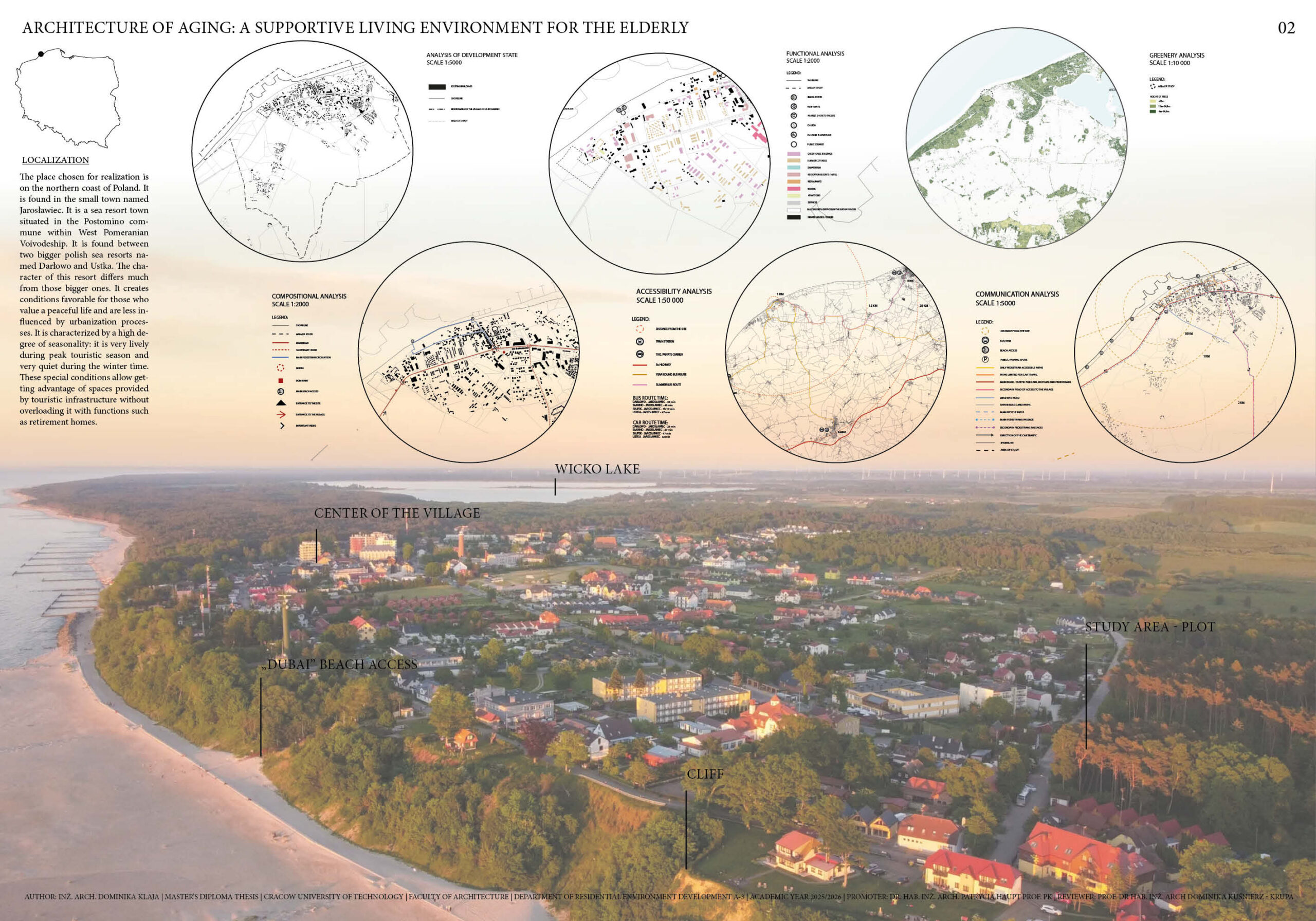 relations. The design part of this thesis presents an architectural design for a nursing home in the Polish seaside resort town of Jarosławiec. The location was selected because of the value of its landscapes and climatic conditions, as well as the coastal environment’s therapeutic potential. The design is based on the specifics of the site and topography, along with the relationship that the facility should maintain with the surrounding greenery, in order to provide