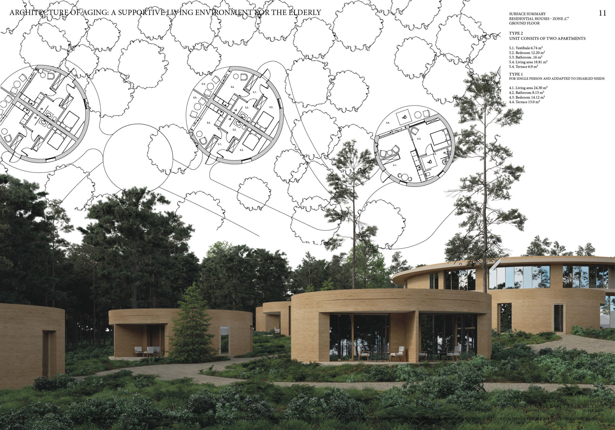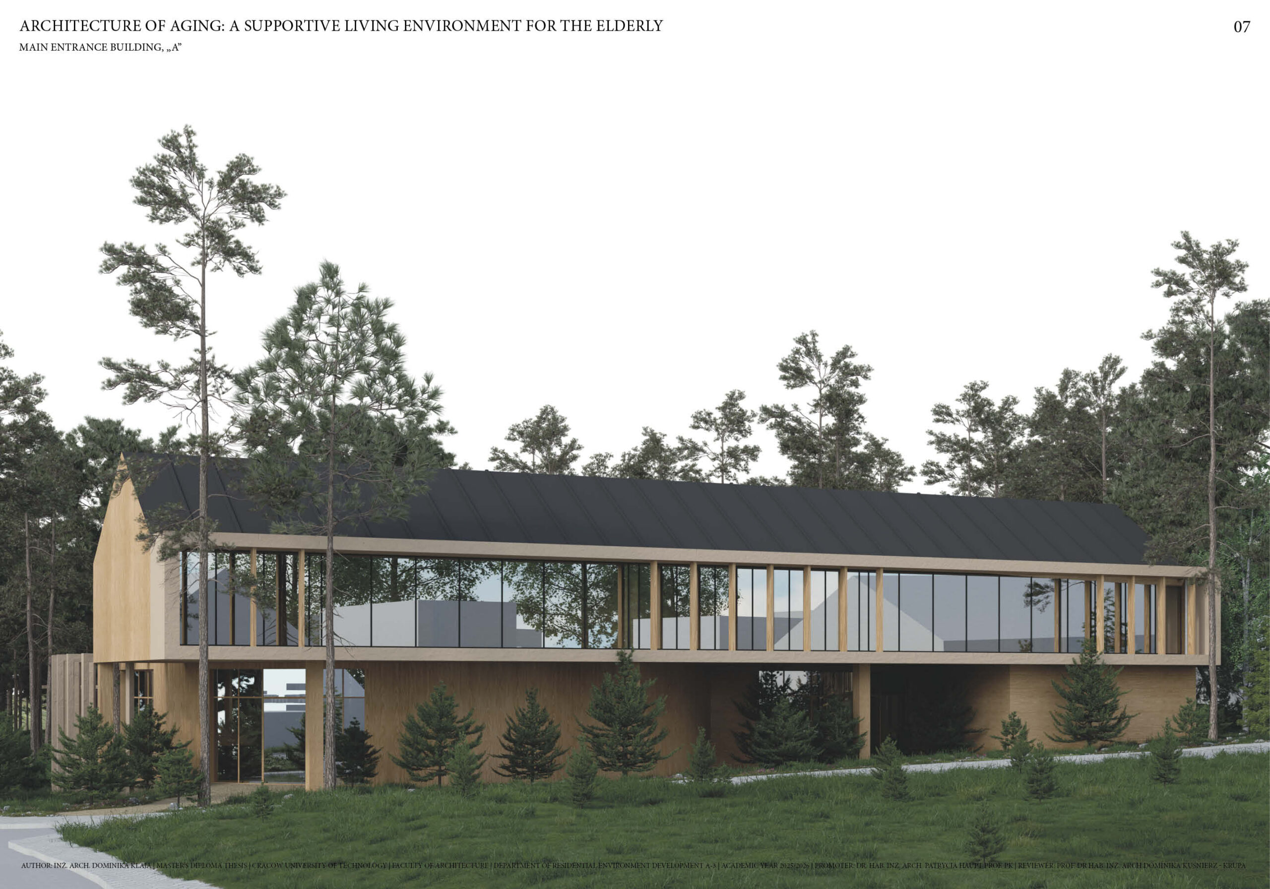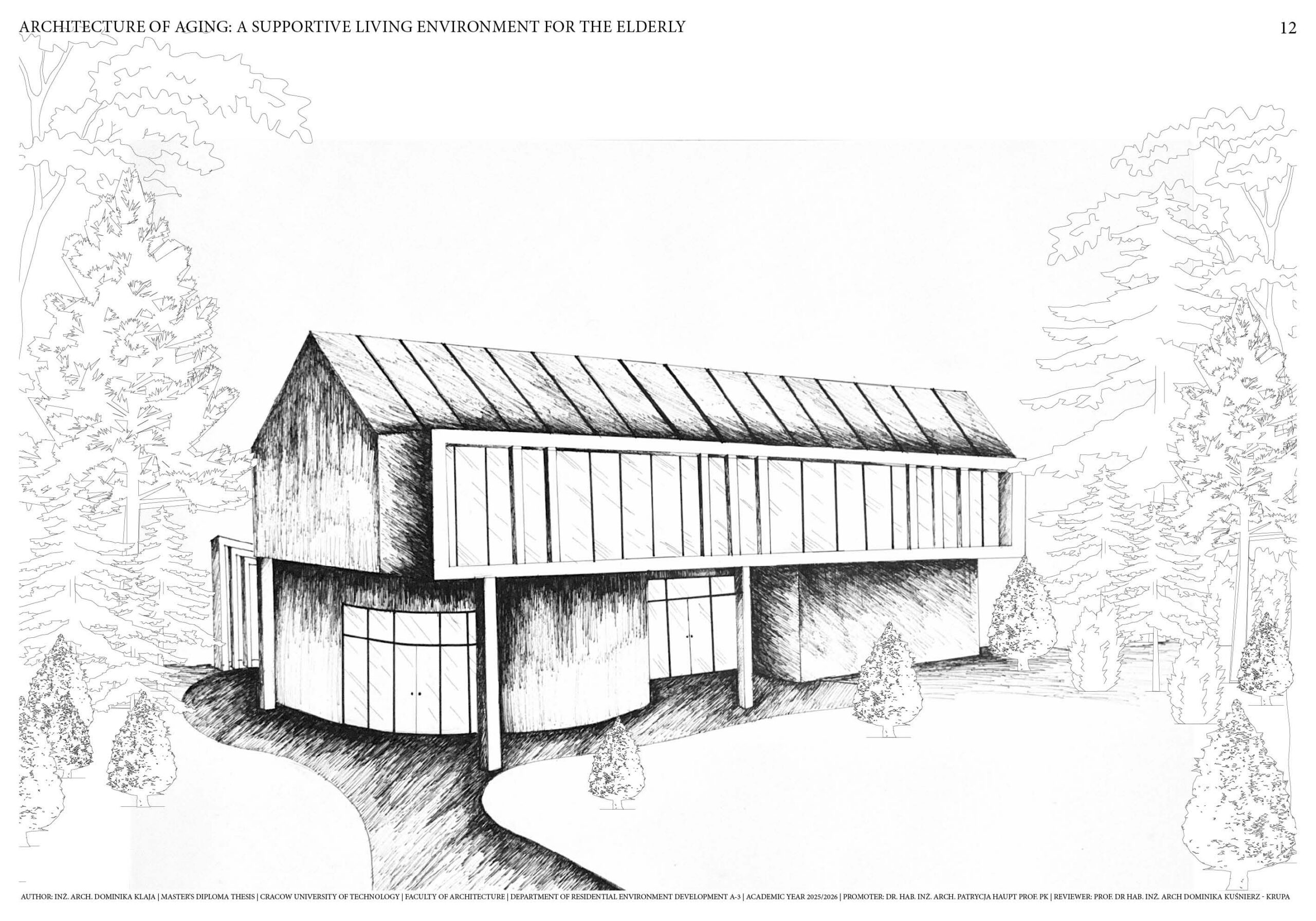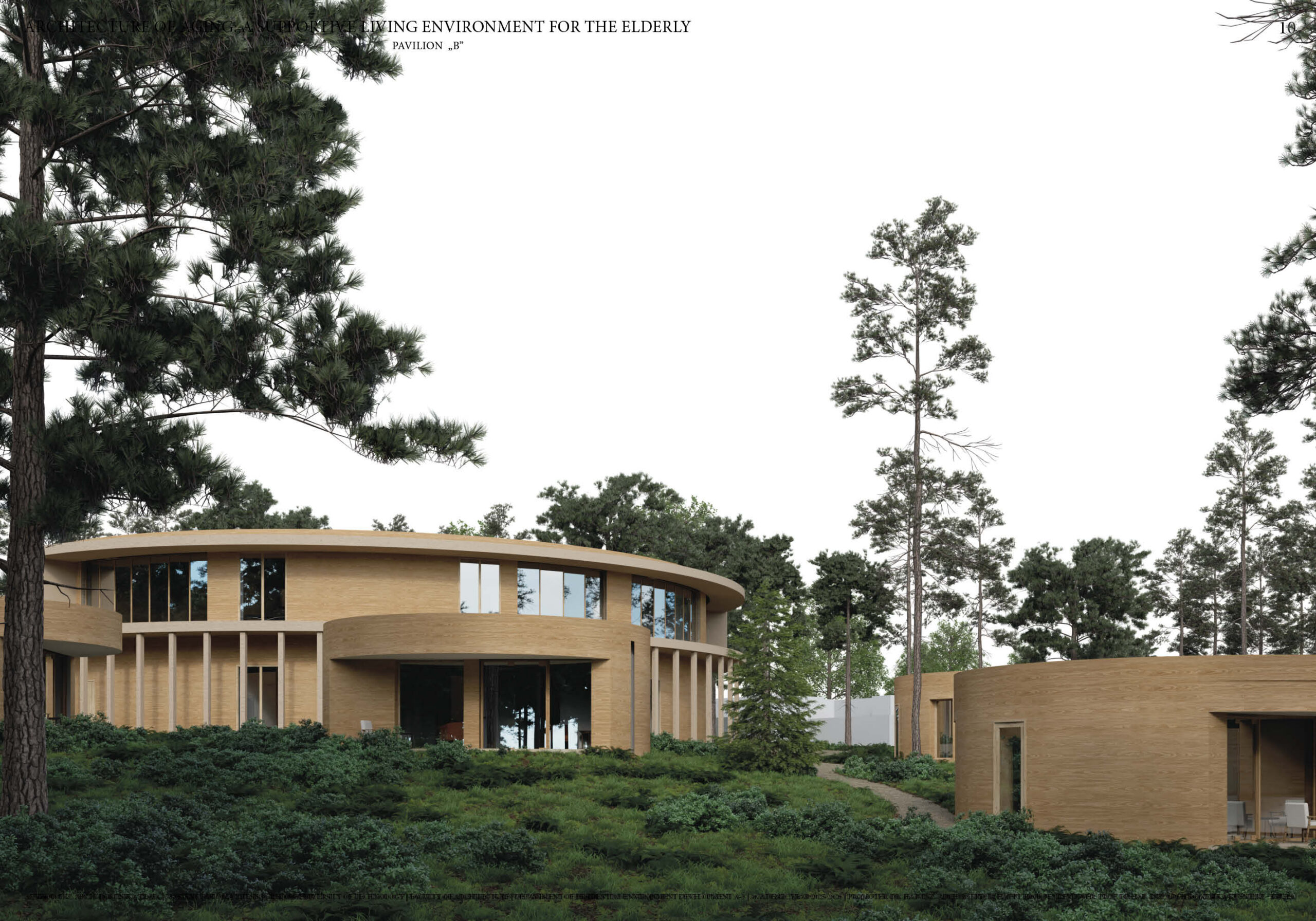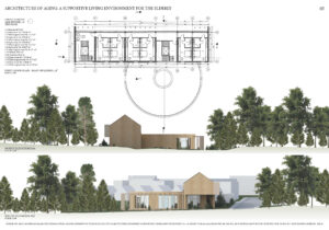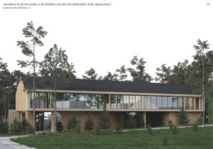 This master’s thesis addresses the issue of architecture dedicated to older people in the context of the ongoing aging process in society. There is a visible increase in demand for alternative long-term care. The project is based on the analysis and development of an architectural concept for a retirement facility with 24-hour medical care, understood as an environment supporting comfort, safety, and the quality of life of seniors. The aim of the master’s work is to respond to the task of designing architecture for the elderly in the context of an aging population and the necessity to introduce an alternative type of housing that would not be a traditional-institutional type of care facility. Specific attention has been paid to the requirements for seniors concerning privacy, clarity of space, nature contact, and social