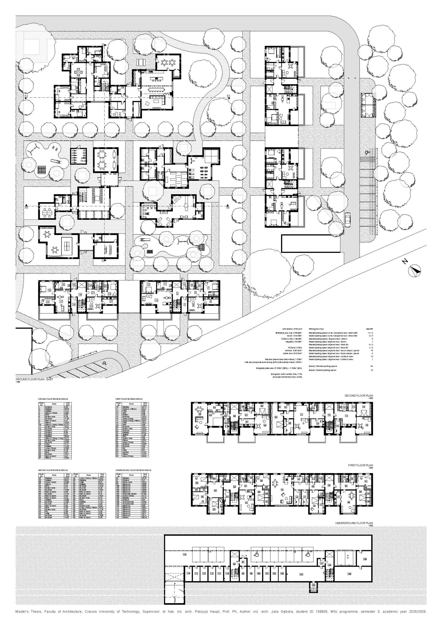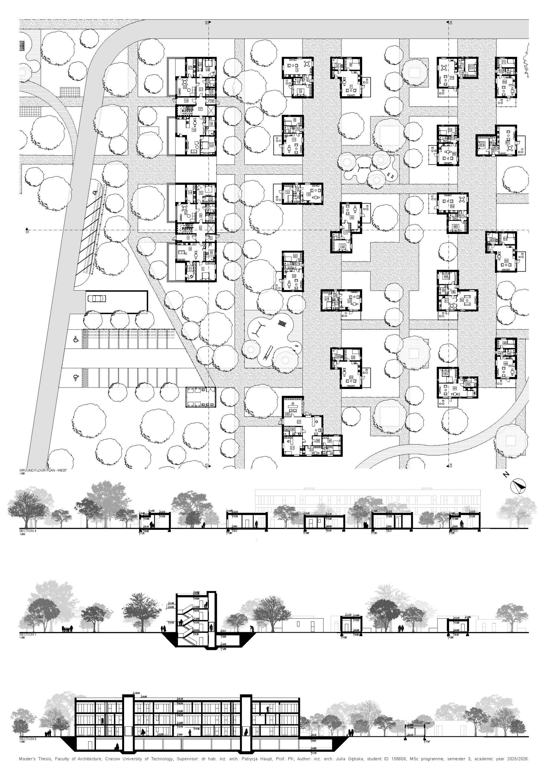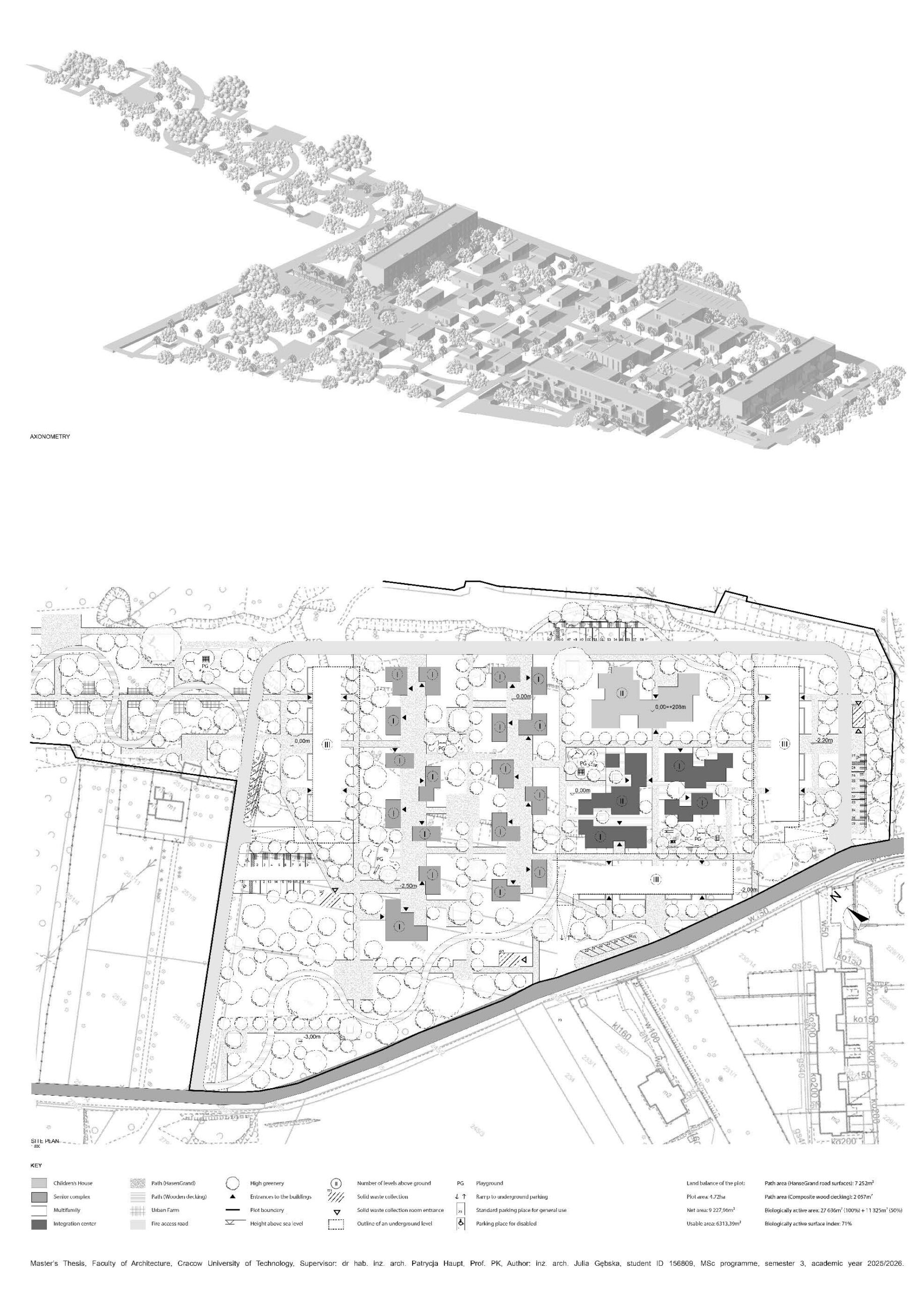 Green spaces play a key role in the structure of the complex and are treated as an integral architectural element. They serve recreational, social, and organizational functions, strengthening the relationship between the built environment and nature. An urban farm complements the functional programme, introducing shared activities as a tool for building intergenerational bonds.