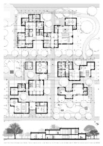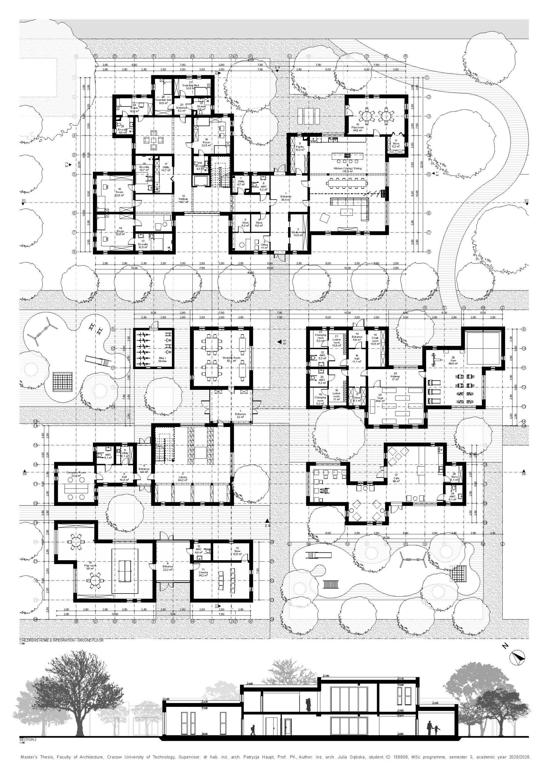 The main design idea is to create an environment that naturally supports everyday contact, integration, and the formation of neighborhood relationships through spatial organization. Instead of isolating individual functions, the project is based on the principle of overlapping and interpenetrating spaces, forming a sequence of zones with varying degrees of privacy. This approach encourages spontaneous social interaction while maintaining the autonomy and comfort of different user groups.