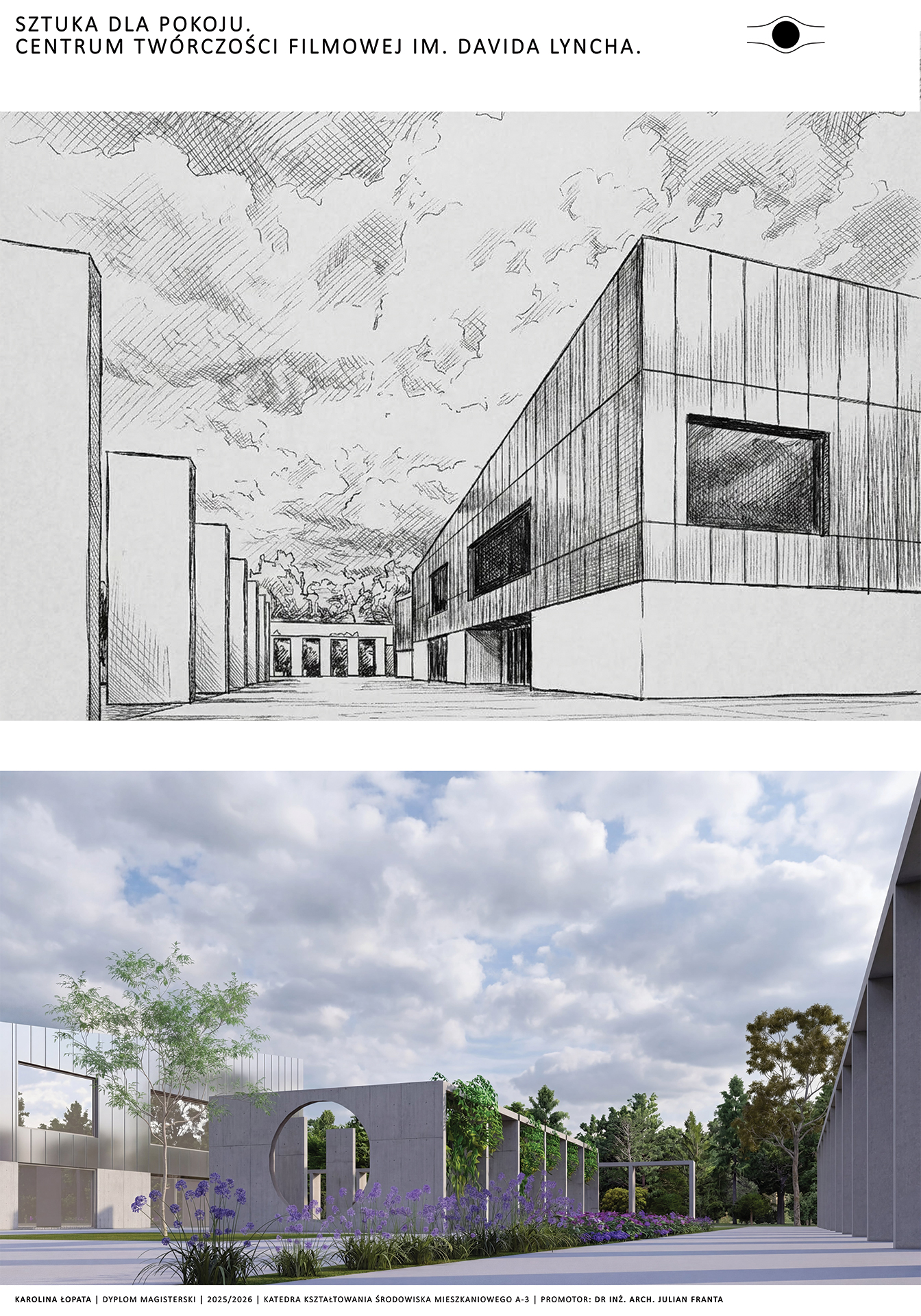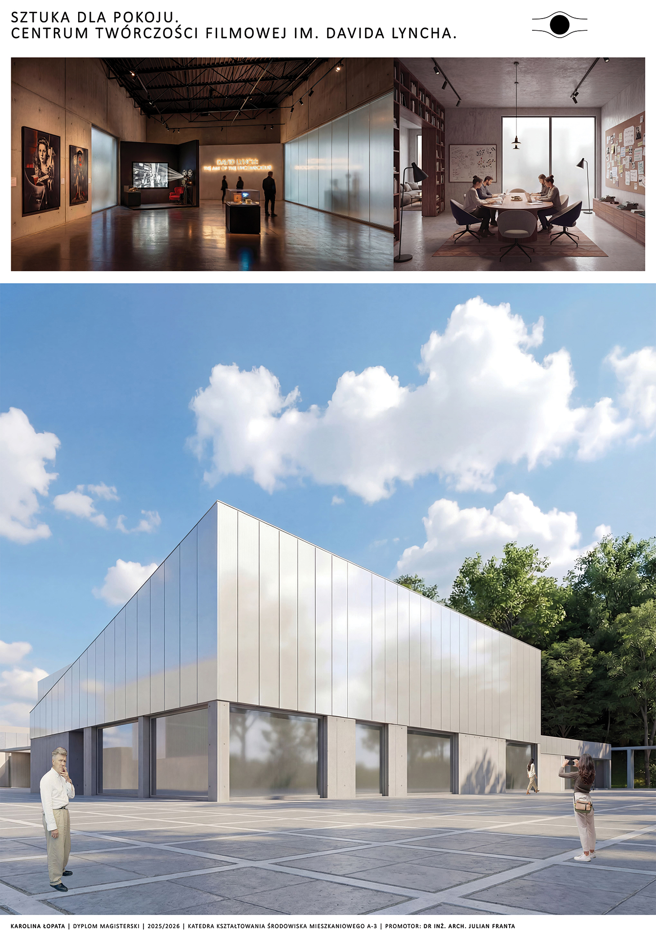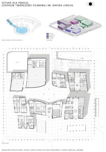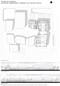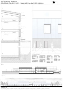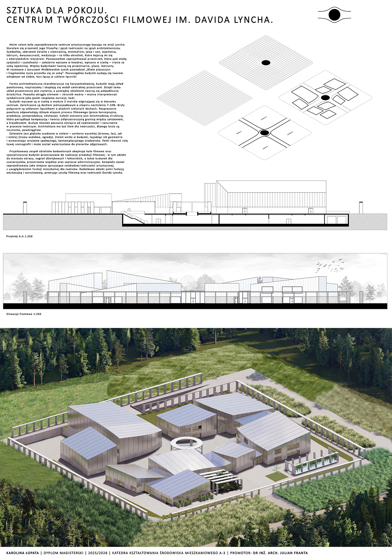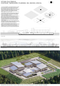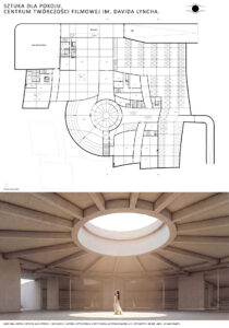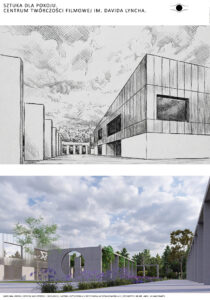 Moim celem było zaprojektowanie centrum artystycznego bazując na wizji Lyncha. Starałam się przenieść jego filozofię i język jego twórczości na język architektoniczny. Symbolika, zderzenie światła z ciemnością, minimalizm, jawa i sen, tajemnica, labirynt, dwuznaczność, medytacja – to kilka określeń, które kojarzą mi się z amerykańskim reżyserem. Postanowiłam zaprojektować przestrzeń, która pod otoką spójności i czytelności – założenie wpisane w kwadrat, wpisane w siatkę – niesie ze sobą tajemnicę. Między budynkami tworzą się przestrzenie, place, labirynty. Poszczególne budynki wydają się tworem odrębnym od siebie, lecz łączą je szklane łączniki.