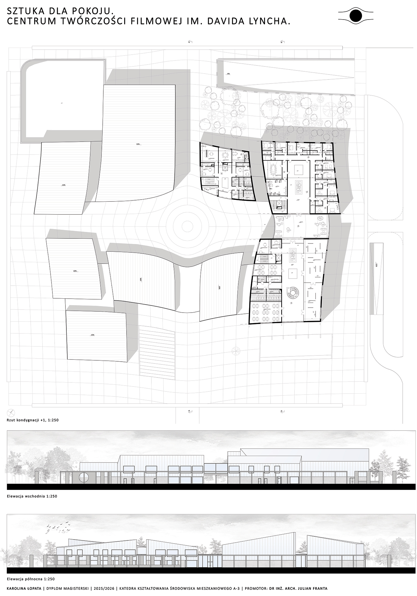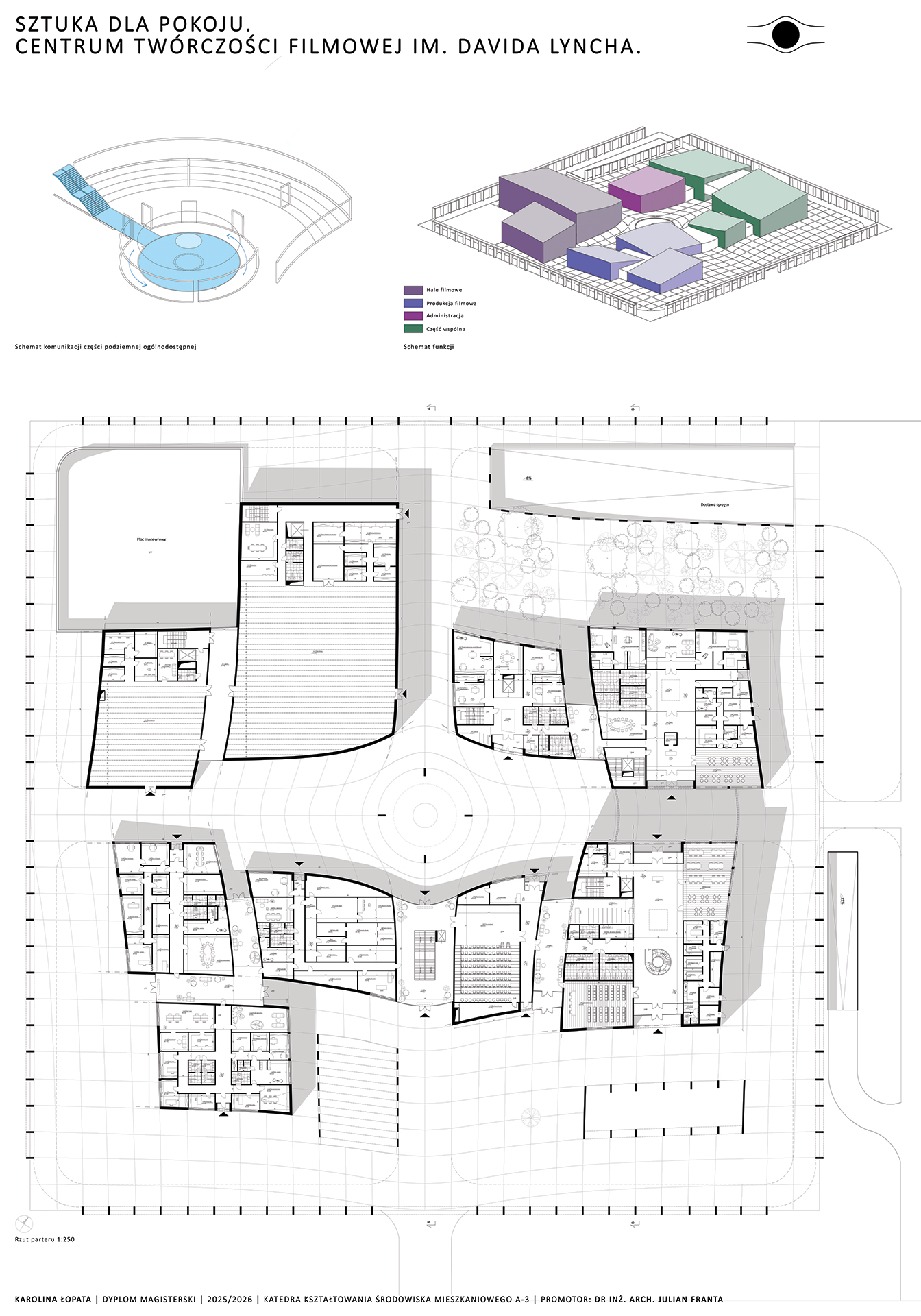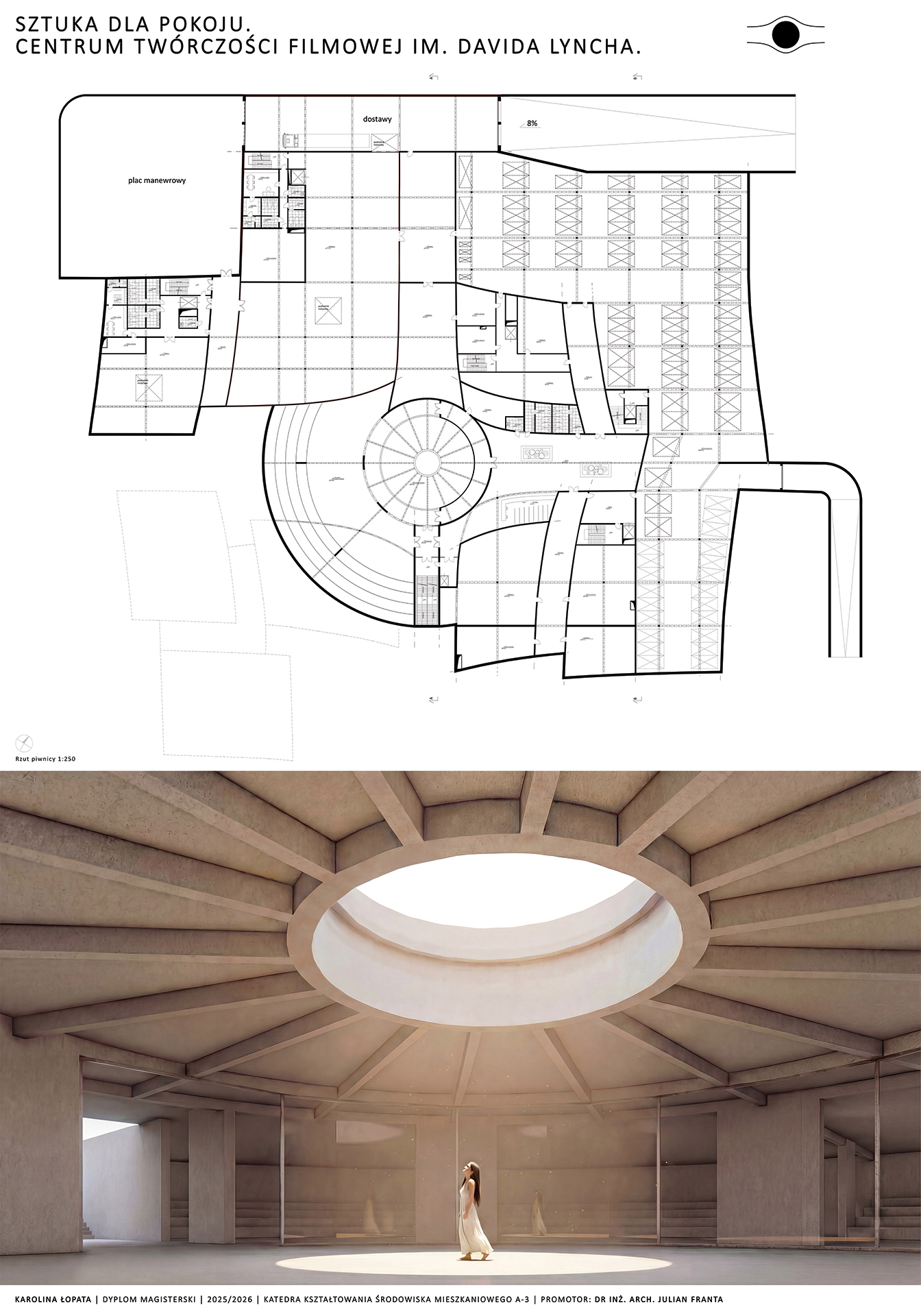 Całe założenie projektowe zostało oparte na siatce modularnej o rozstawie 5 metrów. W miarę zbliżania się do centrum układ ten ulega deformacji, odginając się wokół koła, które w projekcie pełni funkcję zbiornika wodnego. Forma koła, jako figura idealna porządkuje kompozycję całego założenia. Jednocześnie, w nawiązaniu do twórczości DavidaLyncha, staje się ono symbolem mroku i tajemnicy. Chciałam osiągnąć wieloznaczność, i nieoczywistość, i pod okrągłym zbiornikiem na poziomie -1 znajduje się centrum medytacji.