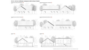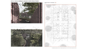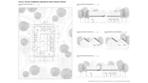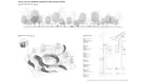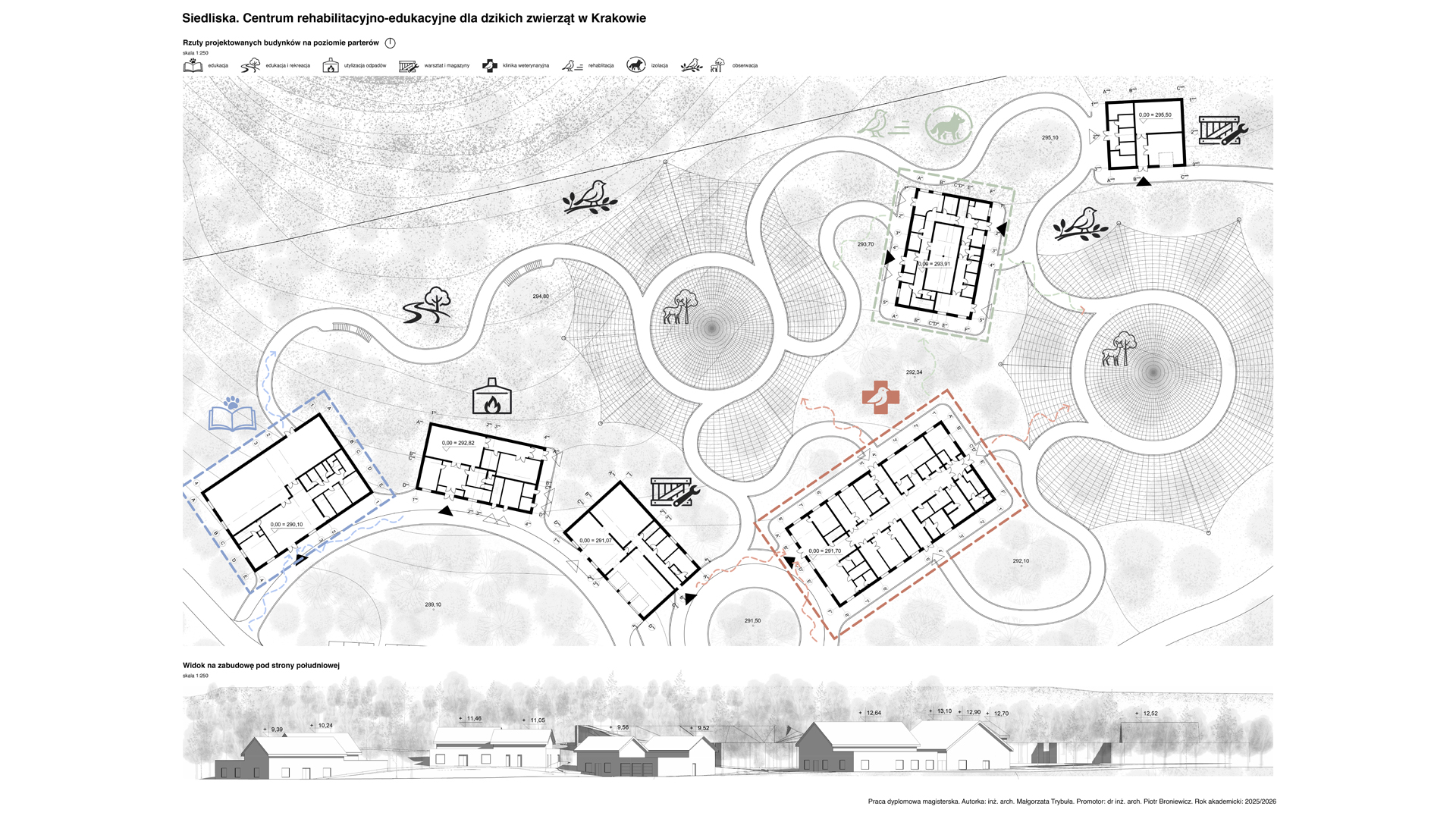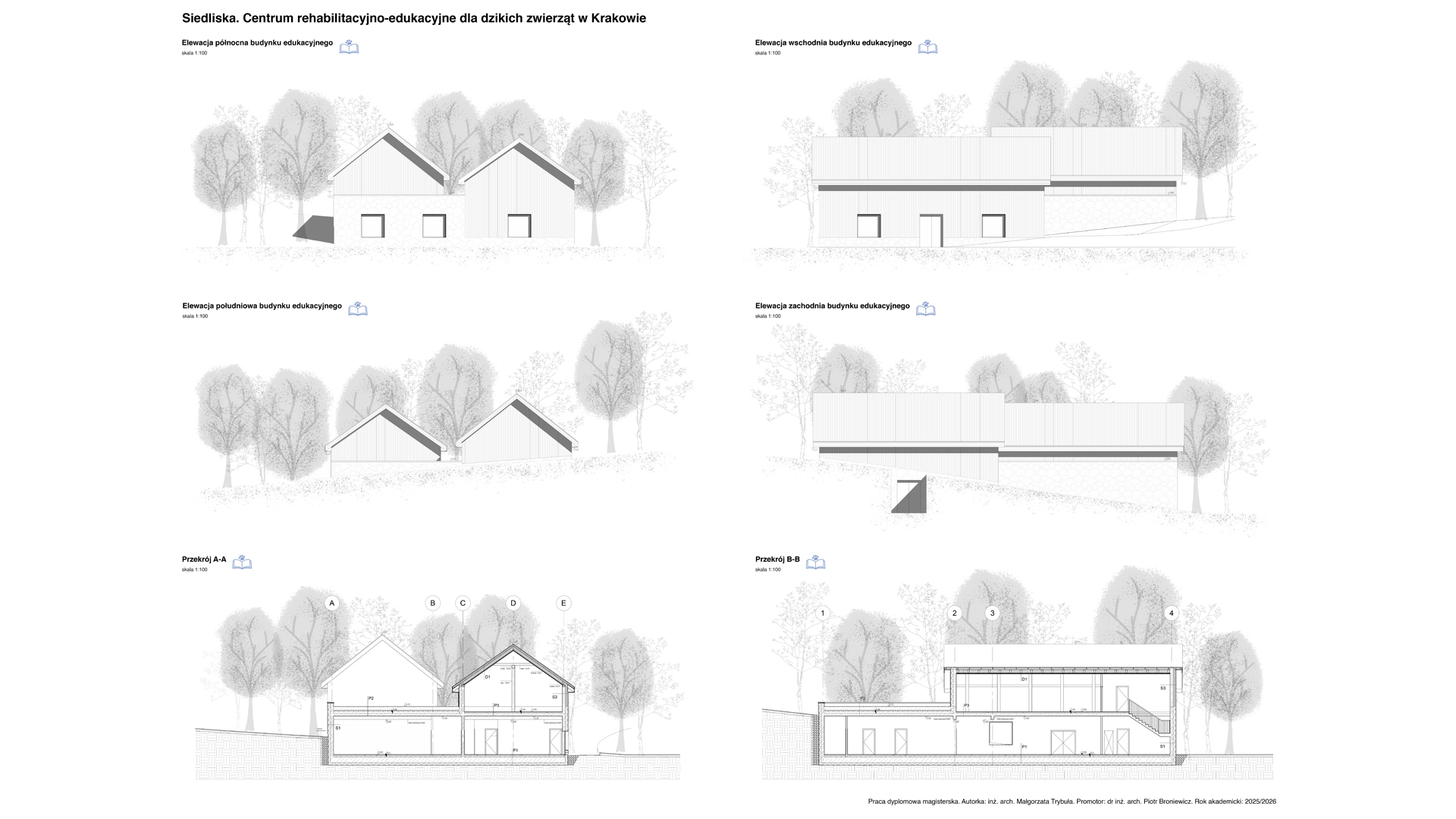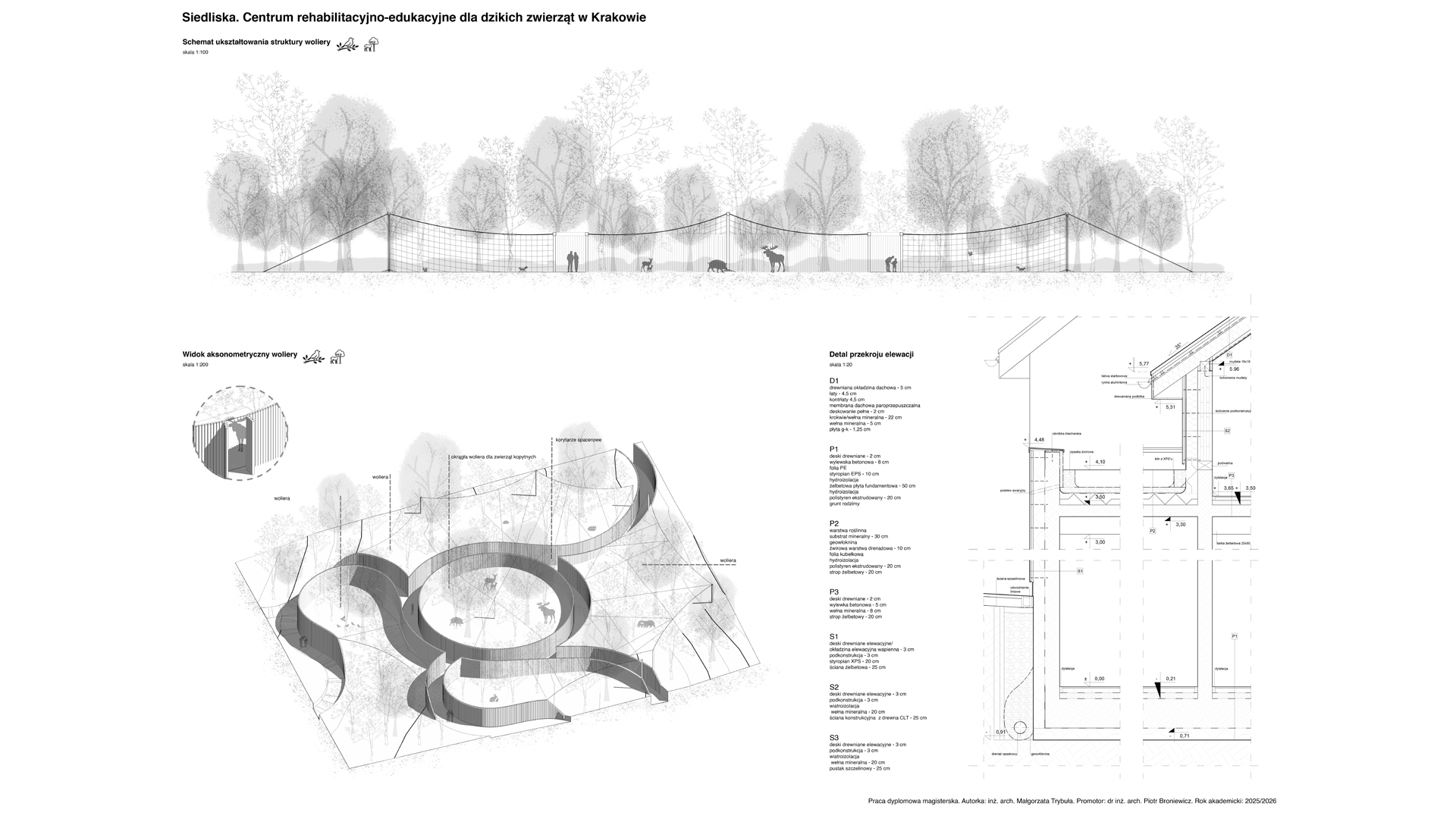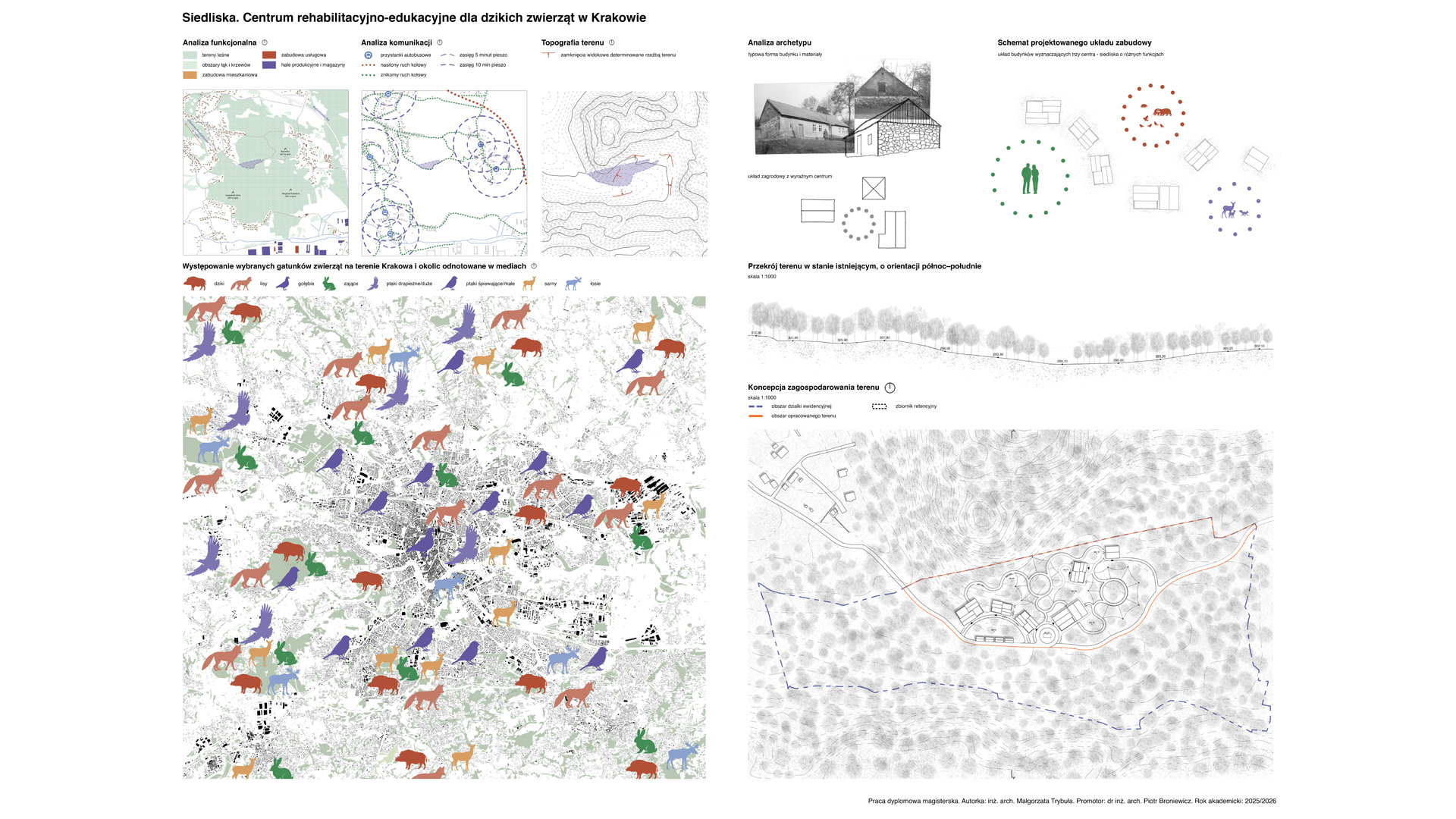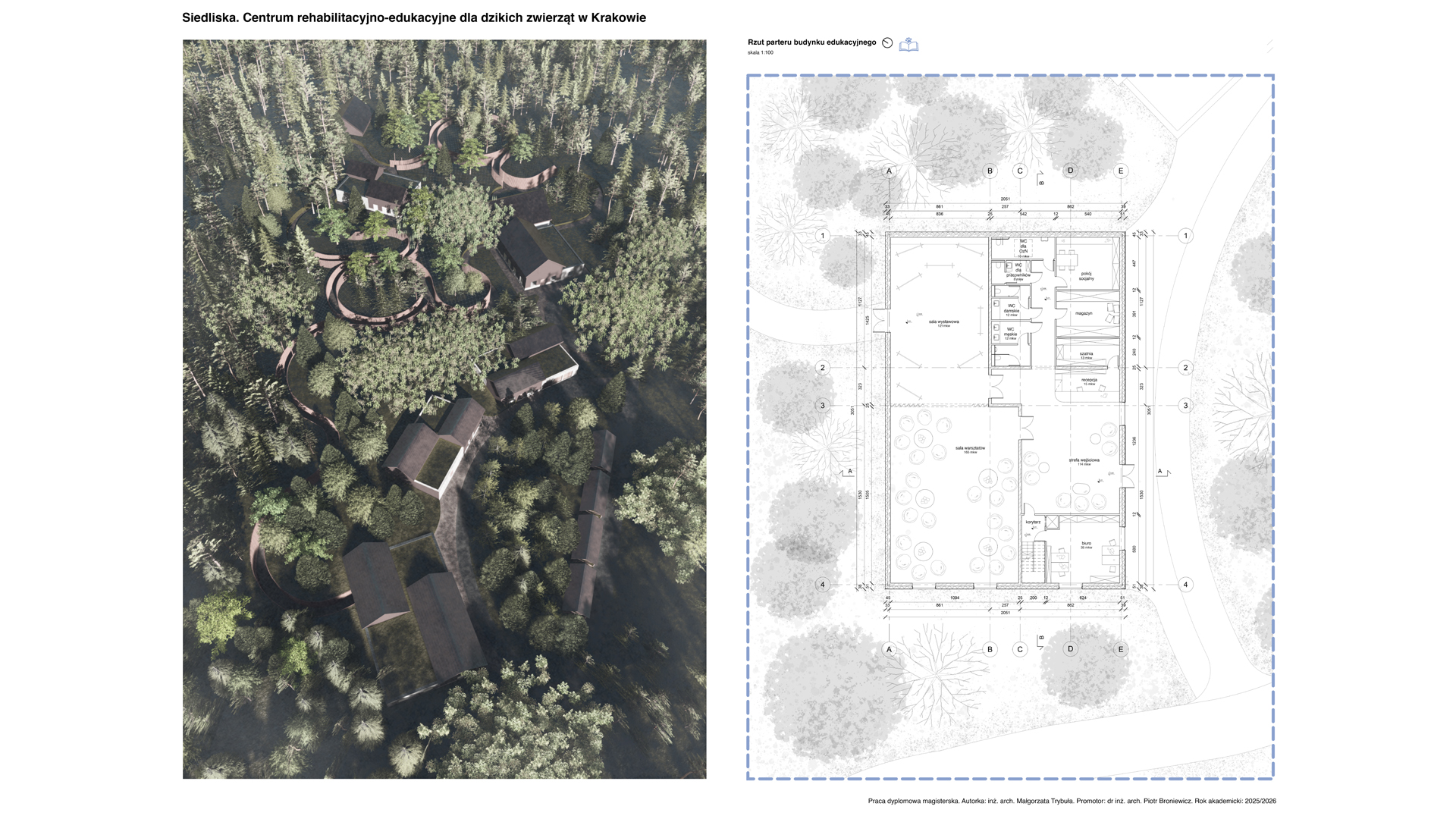 Lokalizacja w Lasach Tynieckich oraz rozproszenie programu pozwalają na funkcjonowanie ośrodka w bezpośrednim sąsiedztwie naturalnych siedlisk przy jednoczesnej minimalizacji ingerencji w tkankę leśną. Układ założenia, inspirowany lokalną tradycją zabudowy zagrodowej, zarówno w zakresie formy, jak i użytych materiałów, wprowadza czytelny podział na trzy centra funkcjonalne. Jedno dostępne dla użytkowników zewnętrznych oraz dwa kolejne podporządkowane są potrzebom rehabilitowanych osobników. W ich obrębie wkomponowano woliery przeplatane korytarzami spacerowymi niewidocznymi dla zwierzęcych pacjentów. Całość kreuje spójną przestrzeń dialogu między człowiekiem a przyrodą.