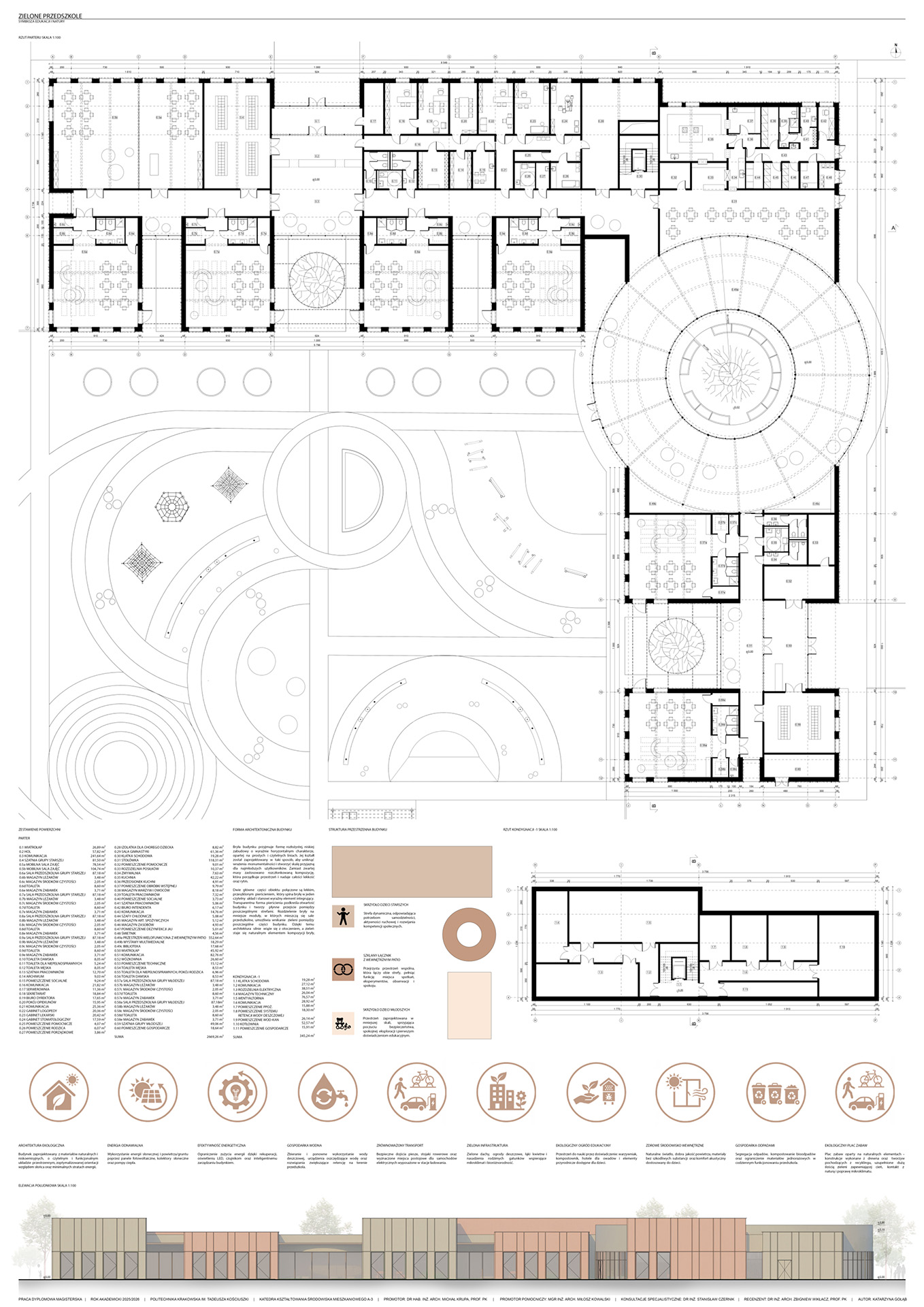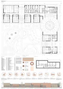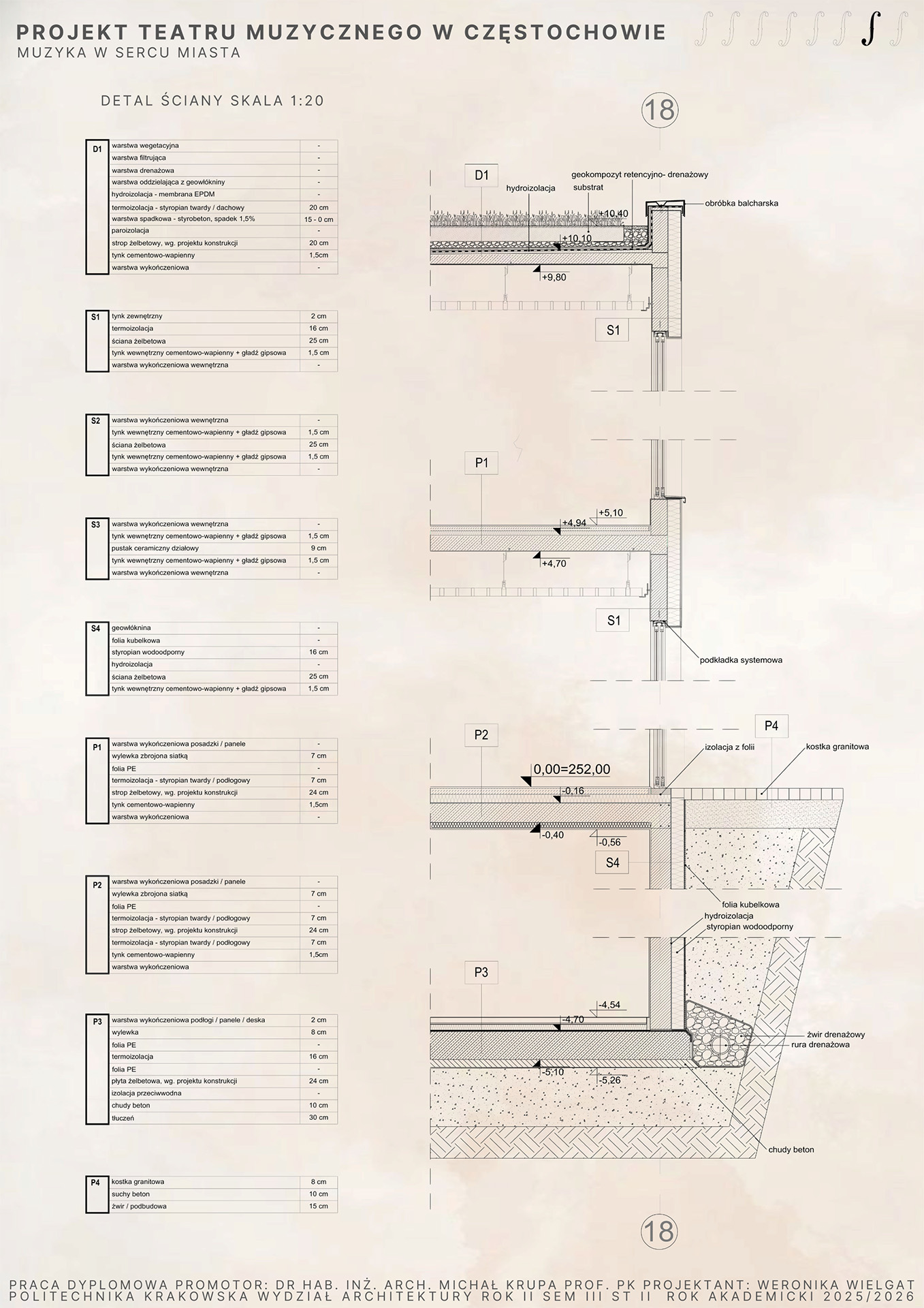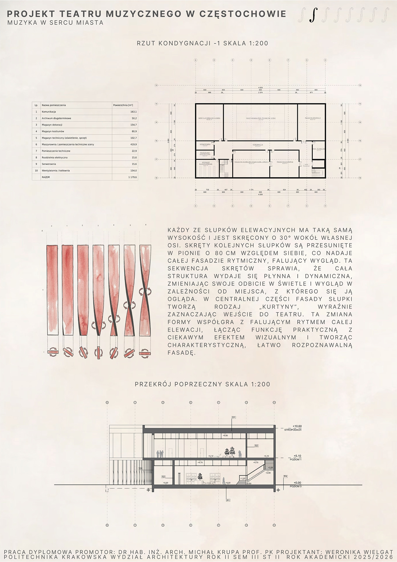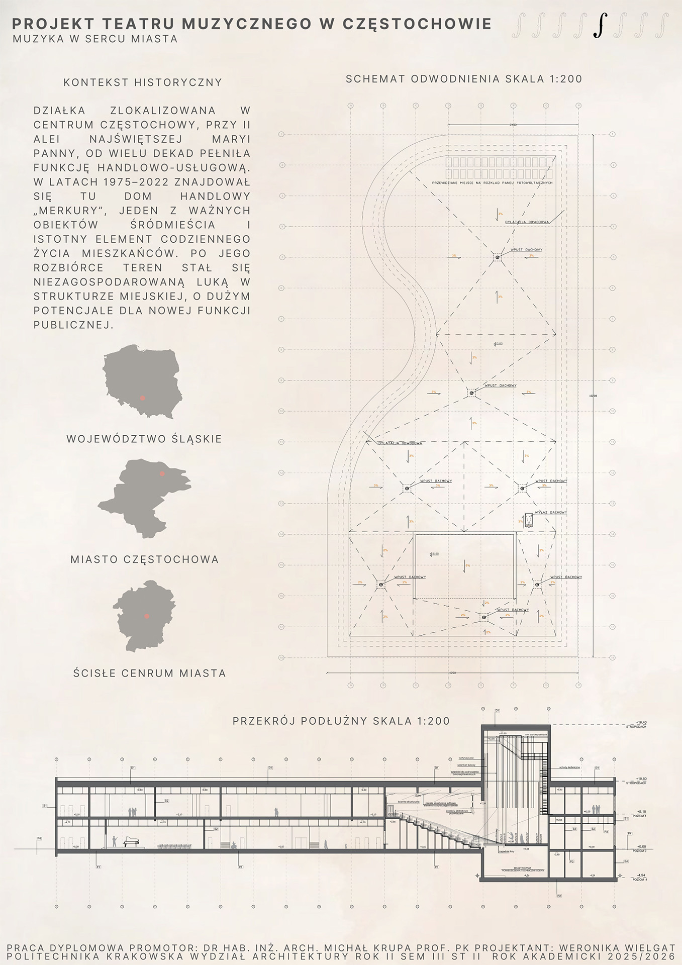 Teatr jest miejscem, w którym architektura spotyka sztukę, a przestrzeń staje się sceną dla emocji i dźwięków. Praca magisterska poświęcona jest projektowi teatru muzycznego, który powstał w wyniku analizy teoretycznej i praktycznych rozważań architektonicznych. Na początku pracy przedstawiono esej dotyczący roli teatru w kulturze oraz znaczenia przestrzeni teatralnej zarówno dla odbiorcy, jak i artysty. Omówiono historyczne i współczesne formy teatru, a także podstawowe zasady podziału przestrzeni scenicznej, w tym scenę, widownię, foyer, zaplecze techniczne oraz ich wzajemne powiązania. Kolejna część pracy dotyczy akustyki i technologii teatralnych, które mają kluczowe znaczenie dla jakości odbioru dźwięku i komfortu widza. Analizowane są różne materiały budowlane, systemy sceniczne oraz innowacyjne rozwiązania projektowe, które pozwalają zoptymalizować widoczność, słyszalność oraz funkcjonalność przestrzeni. W pracy podkreślono, że projektowanie teatru wymaga harmonijnego połączenia aspektów technicznych, estetycznych i użytkowych. Ostatnia część pracy prezentuje autorski projekt teatru muzycznego, który łączy tradycyjne elementy architektury teatralnej z nowoczesnymi technologiami. Projekt uwzględnia zarówno wymagania funkcjonalne, jak i estetyczne, tworząc przestrzeń przyjazną artystom, widzom oraz społeczności lokalnej. Praca demonstruje, że architektura teatralna może być nie tylko miejscem występów scenicznych, ale również przestrzenią integrującą kulturę i życie miejskie. Praca łączy analizę teoretyczną z praktycznym projektowaniem, ukazując rolę architektury w kształtowaniu doświadczeń artystycznych i społecznych oraz znaczenie innowacyjnych rozwiązań w nowoczesnym projektowaniu obiektów teatralnych.