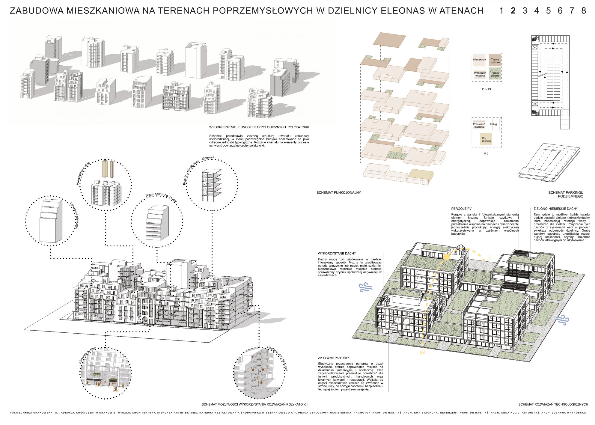 Praca podejmuje problem możliwości wykorzystania reinterpretacji polykatoikii jako modelu zabudowy mieszkaniowej uzupełniającej w procesie rewitalizacji terenów poprzemysłowych Eleonas w Atenach. W części