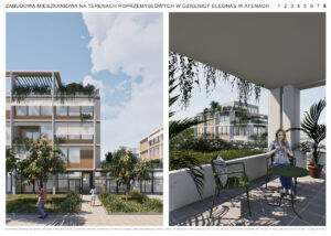 Na tej podstawie opracowano koncepcję urbanistyczno-architektoniczną, w której polykatoikia została potraktowana jako narzędzie porządkowania przestrzeni, a nie wzorzec do kopiowania. Projekt zakłada wprowadzenie kwartałowej struktury zabudowy, aktywnych parterów, hierarchii przestrzeni publicznych i półpublicznych oraz tarasowego kształtowania wnętrz kwartałów. Model zabudowy łączy intensywność miejską z poprawą jakości środowiska mieszkaniowego, wprowadzając elastyczne układy mieszkań, zieleń i rozwiązania sprzyjające zrównoważonej mobilności.
