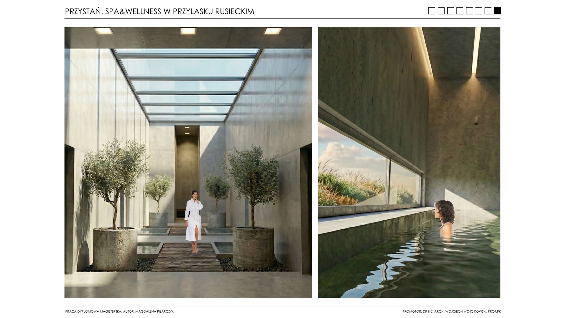W szerszym kontekście idei wellness, „przystań” może być rozumiana jako postulat spowolnienia i przerwania codziennego pośpiechu. Projektowany obiekt ma pełnić funkcję „bezpiecznego portu”, do którego ucieka się od zgiełku miasta, aby znaleźć wyciszenie, równowagę i bezpieczeństwo. Architektura obiektu, poprzez strefowanie, grę światłem i ciszę wymusza „przystanięcie” i moment na refleksję.