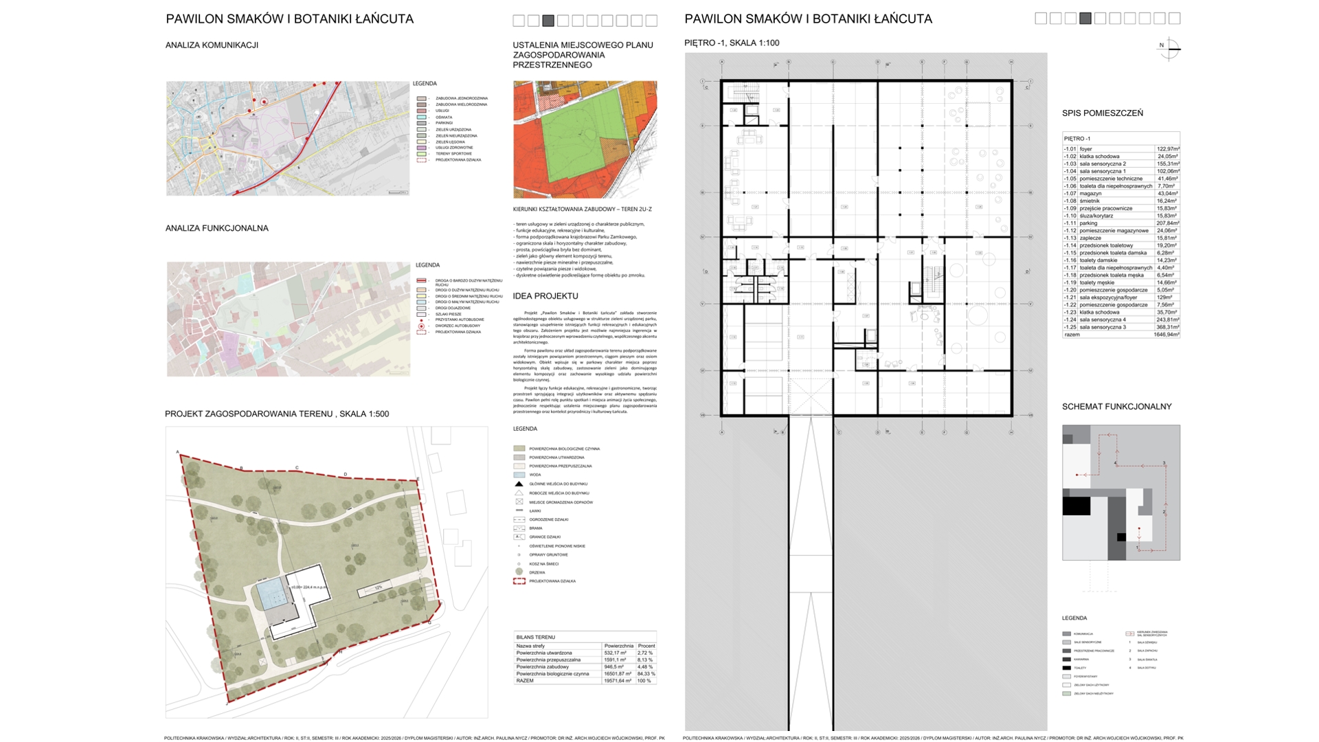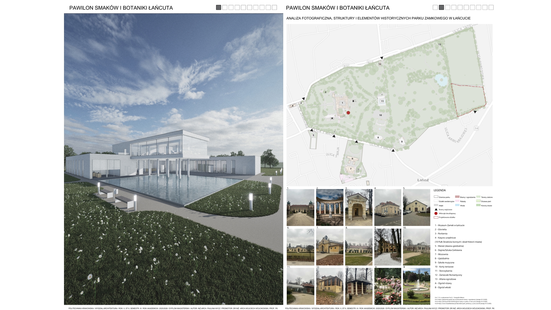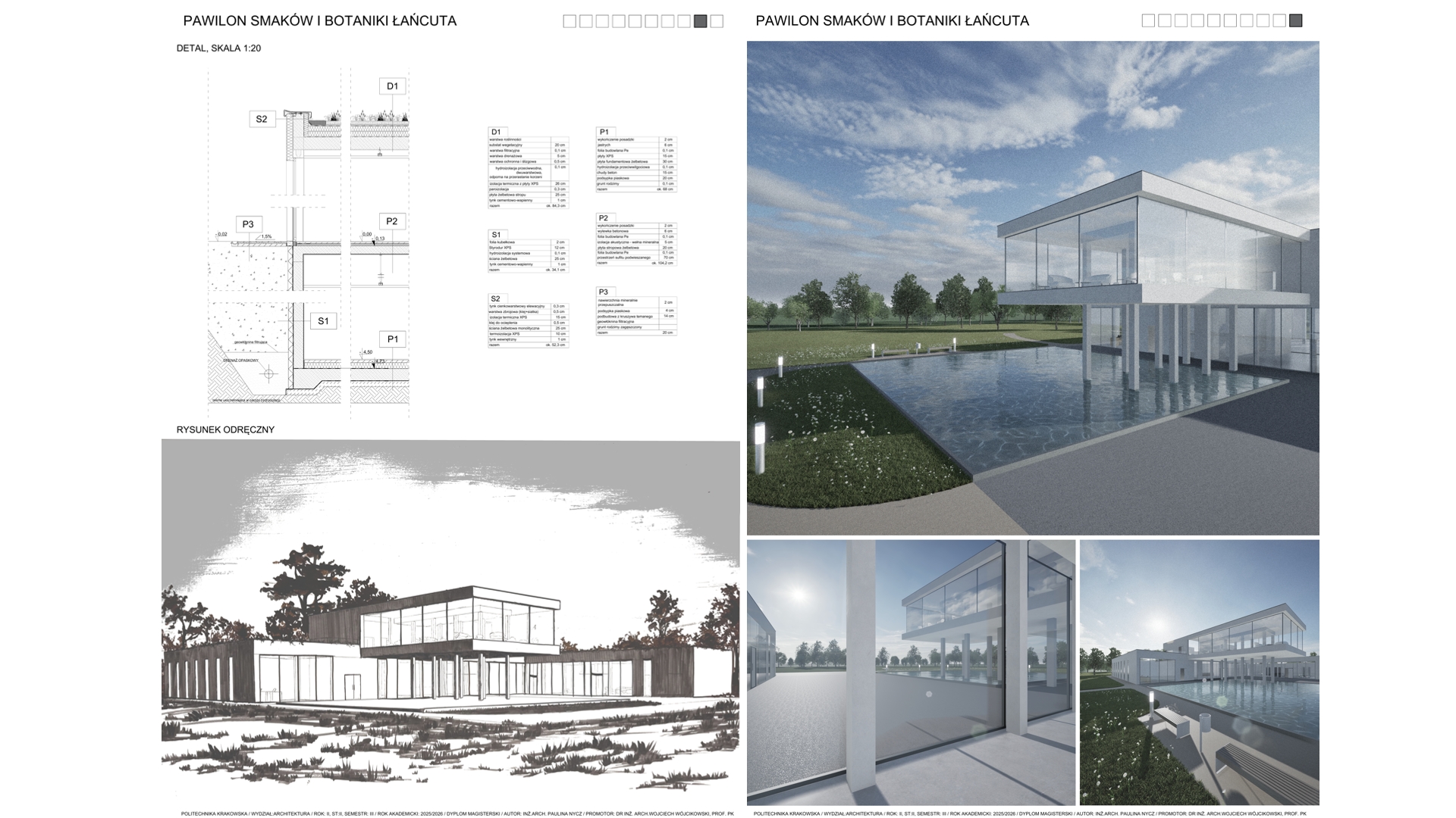 Praca dyplomowa przedstawia projekt architektoniczny Pawilonu Smaków i Botaniki zlokalizowanego na terenie Parku Zamkowego w Łańcucie. Celem projektu było zaprojektowanie współczesnego obiektu publicznego, który harmonijnie wpisuje się w historyczny i przyrodniczy kontekst miejsca, przy jednoczesnym zachowaniu jego wartości krajobrazowych. Program funkcjonalny obejmuje przestrzenie edukacyjne, sensoryczne, rekreacyjne oraz gastronomiczne. Projekt zakłada odejście od tradycyjnej formy ekspozycji na rzecz doświadczania przestrzeni poprzez zmysły. Forma architektoniczna pawilonu została zaprojektowana jako prosta, horyzontalna bryła o ograniczonej skali. Przeszklone wnętrza oraz taras na dachu umożliwiają obserwację otoczenia parku z różnych poziomów i perspektyw. W projekcie wykorzystano zielone dachy oraz rozwiązania sprzyjające racjonalnemu gospodarowaniu wodą i energią. Projekt stanowi próbę połączenia współczesnych rozwiązań architektonicznych z istniejącym krajobrazem parkowym. Przyjęte rozwiązania przestrzenne i funkcjonalne zostały podporządkowane specyfice miejsca oraz jego kontekstowi historycznemu i przyrodniczemu.