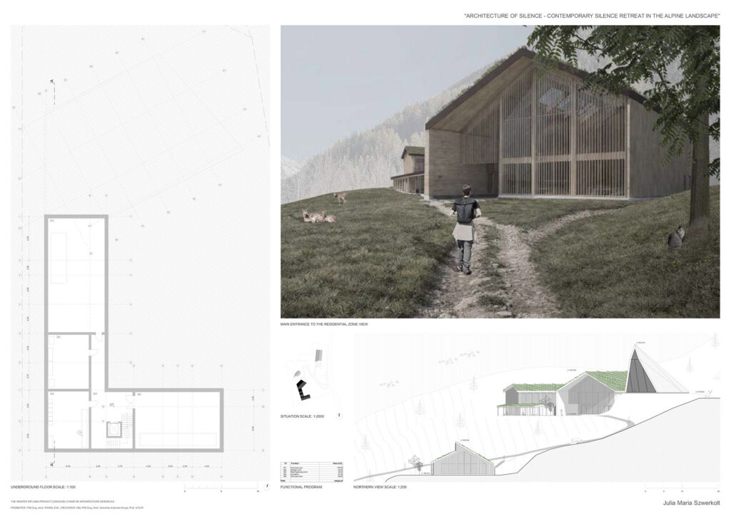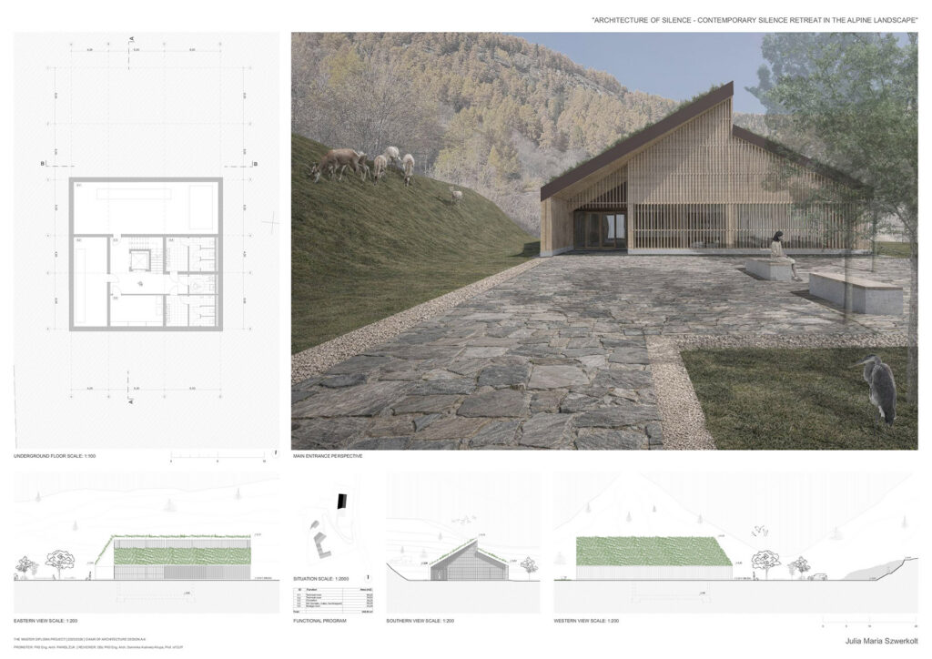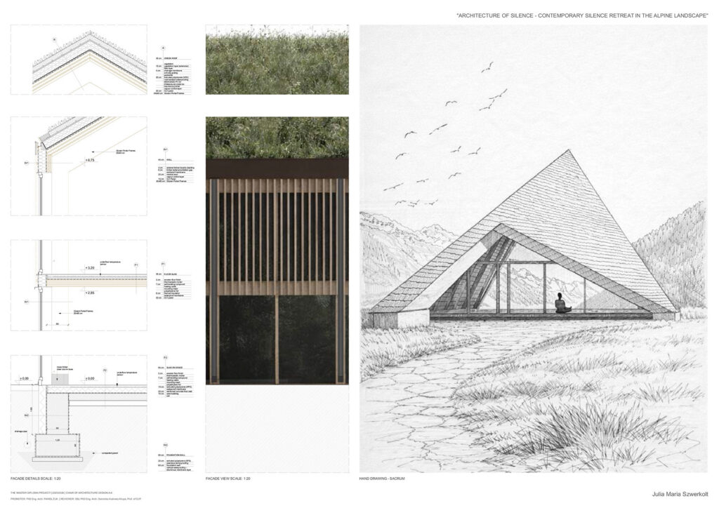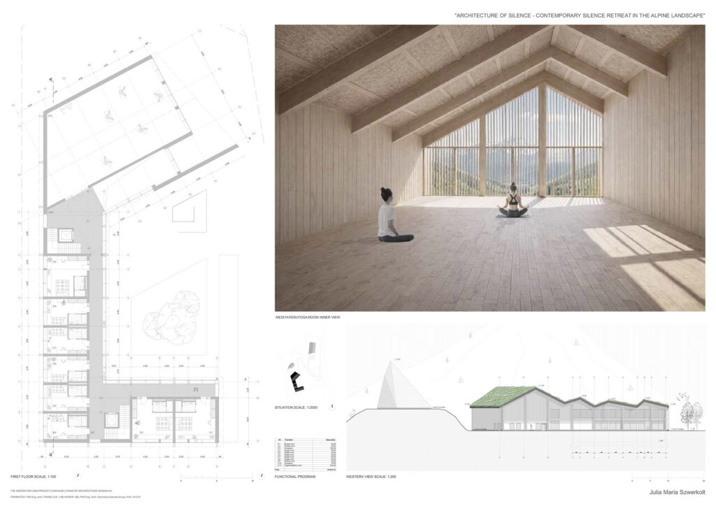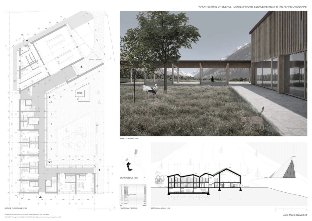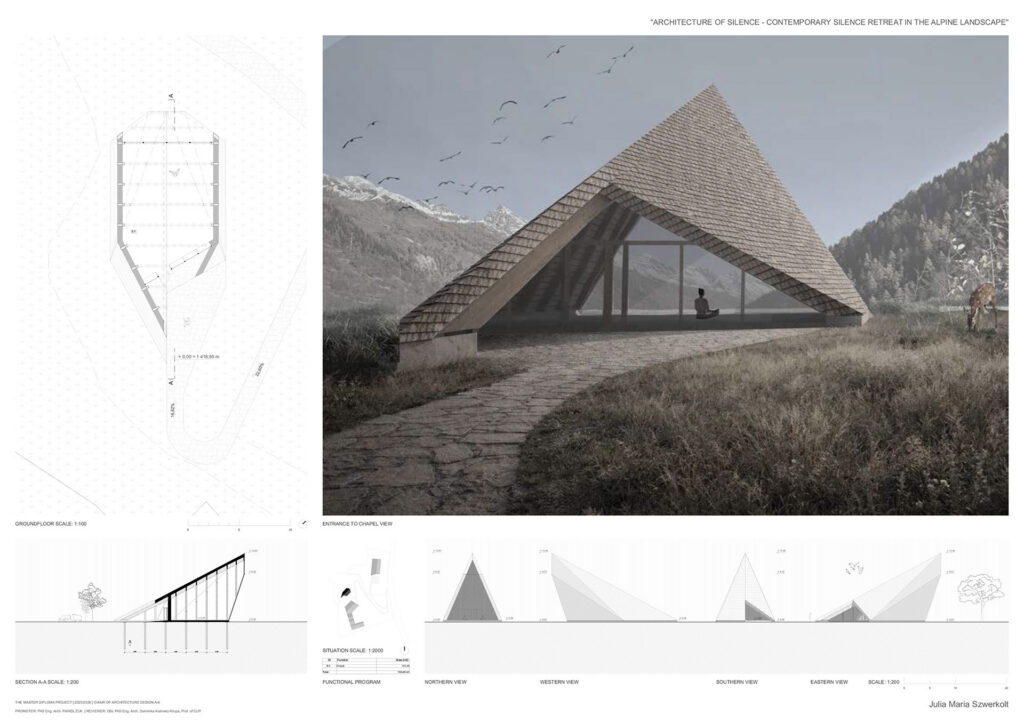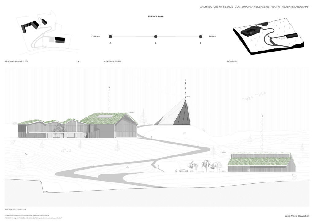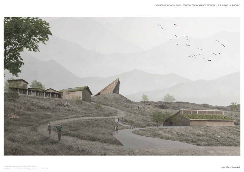 Projekt opiera się na założeniu, że cisza nie jest stanem natychmiastowym, lecz procesem wspieranym przez architekturę, kształtowanym w relacji z alpejską topografią. Sekwencje wejściowe, strefy przejściowe i przestrzenie buforowe stopniowo oddzielają użytkownika od codzienności, a ruch, zmiany poziomu oraz kompresja i ekspansja przestrzeni spowalniają ciało i przygotowują umysł na doświadczenie ciszy. Ośrodek tworzą trzy budynki na różnych poziomach terenu, wyrażające ciszę jako stopniową drogę wycofania, skupienia i kontemplacji.