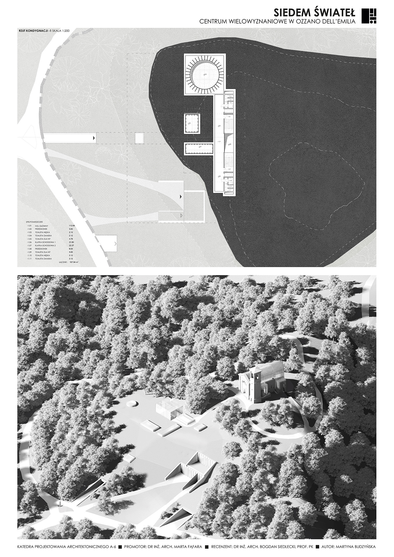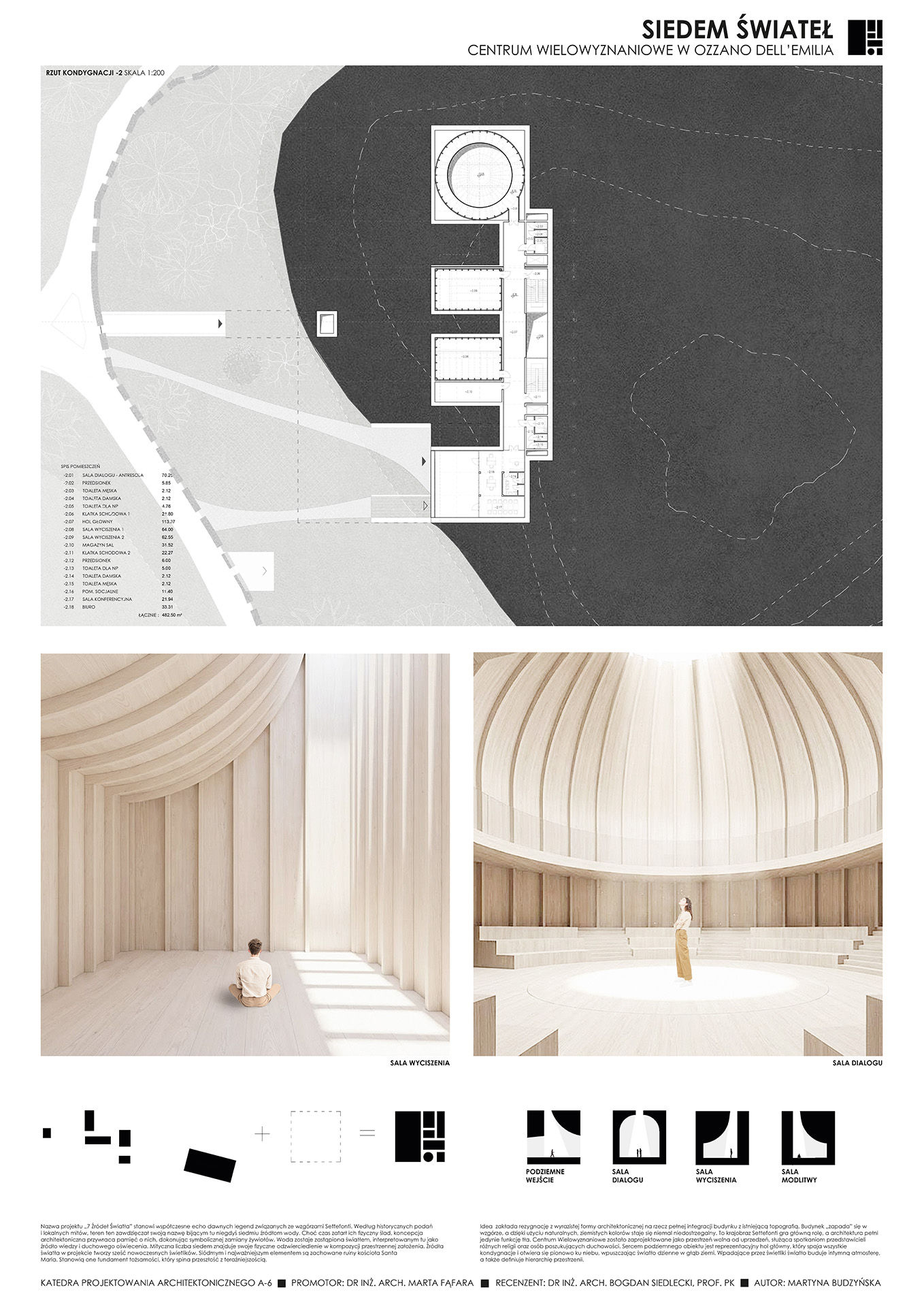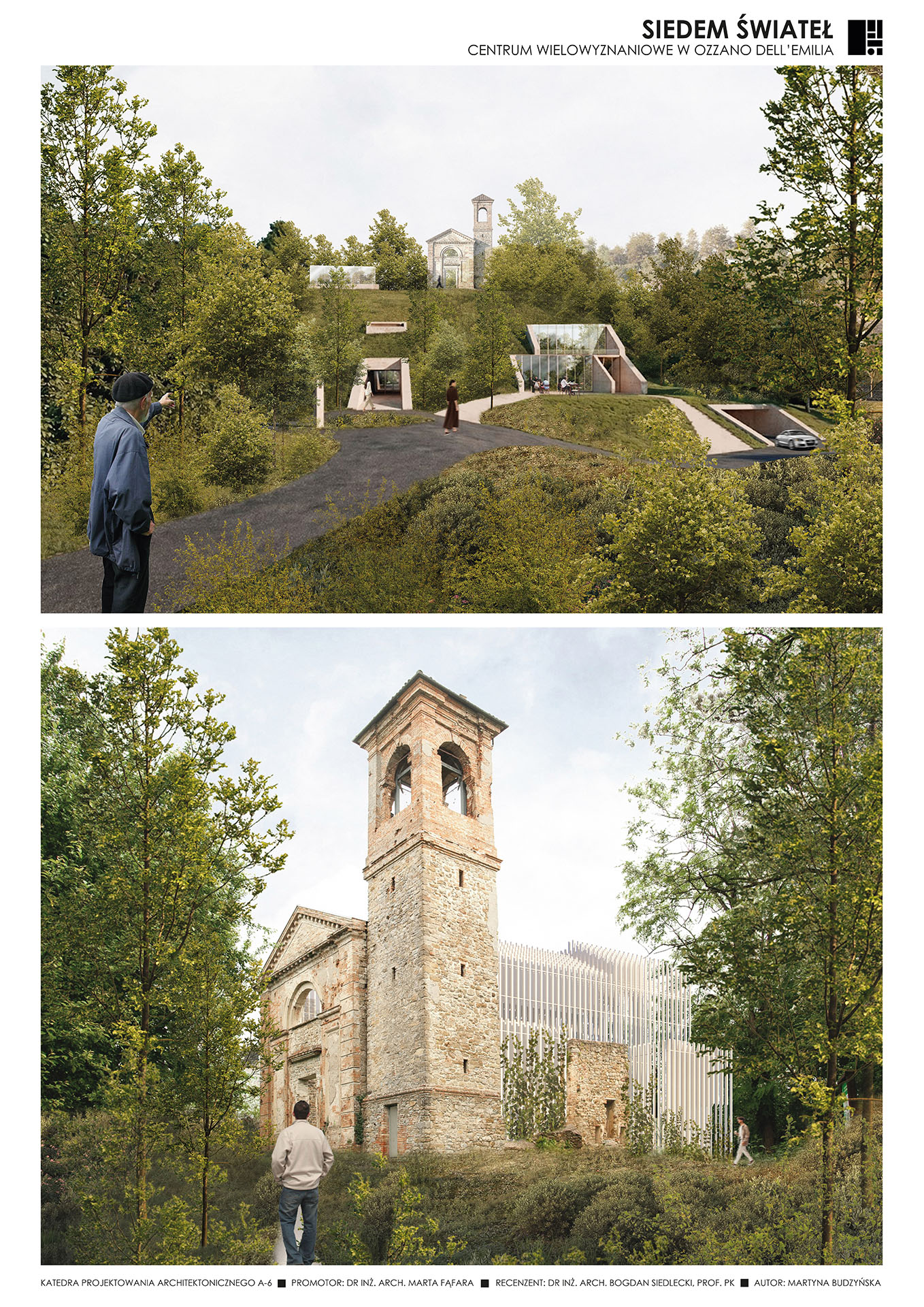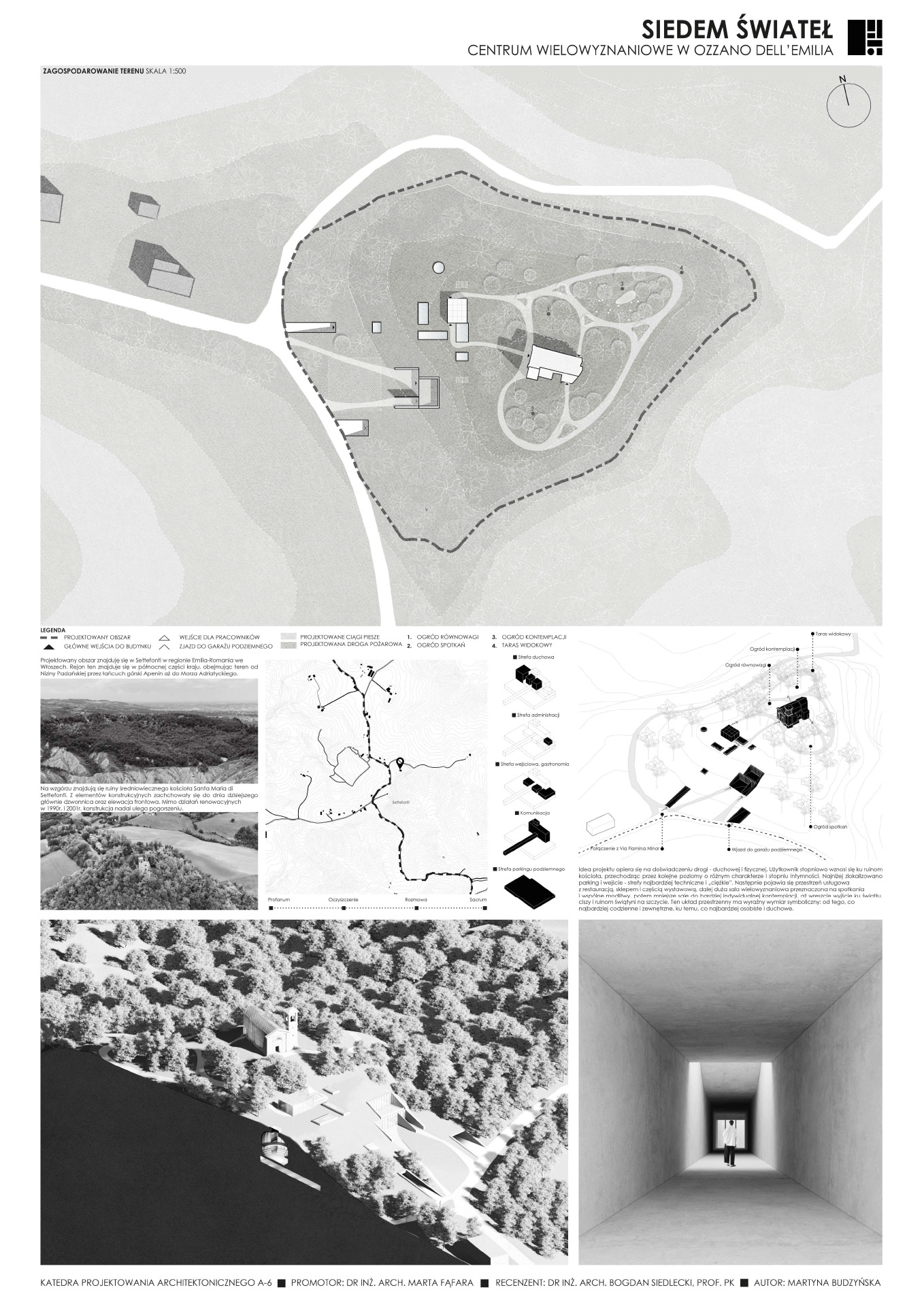 Praca dyplomowa podejmuje problematykę przyszłości architektury sakralnej w obliczu współczesnych przemian społeczno-kulturowych. Część badawcza, zatytułowana „Trwałość Sacrum”, analizuje zjawisko desakralizacji i kryzysu funkcjonalnego świątyń. Poprzez studium porównawcze strategii adaptacji obiektów na świecie, praca weryfikuje wpływ monumentalnej formy na nową funkcję budynku. Przeprowadzone studium prowadzi do wniosku, że najwłaściwszą drogą ratowania obiektów sakralnych jest nadawanie im funkcji publicznych i kulturowych, co stało się punktem wyjścia dla części projektowej – Centrum Wielowyznaniowego „7 Źródeł Światła”, zlokalizowanego na wzgórzu Settefonti we Włoszech.