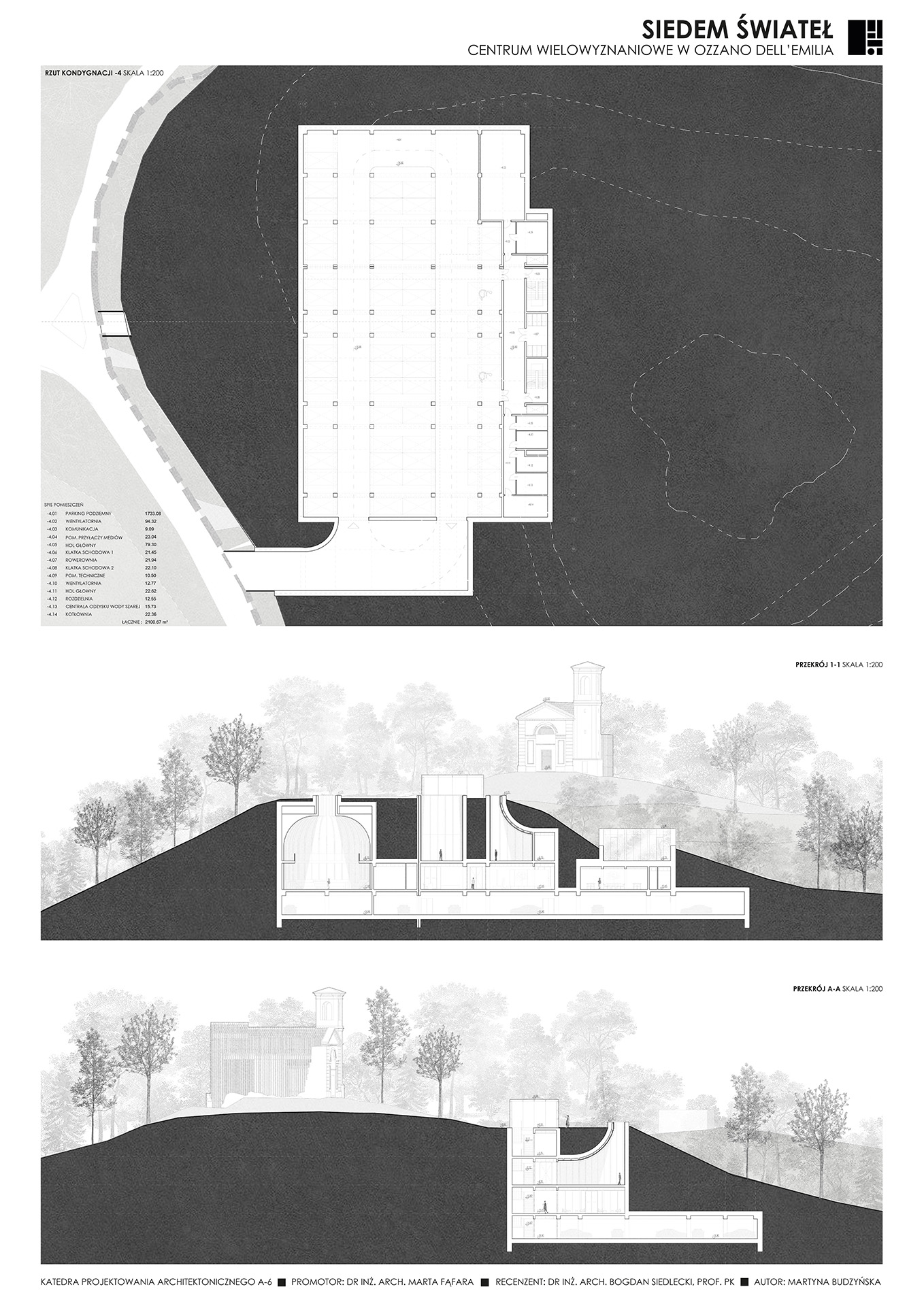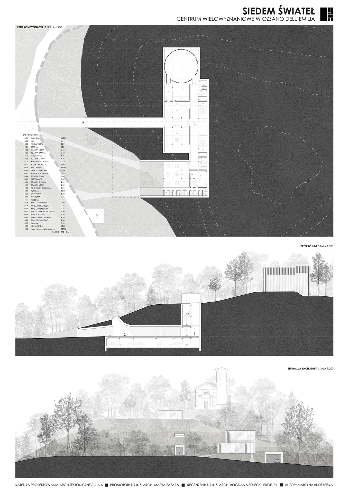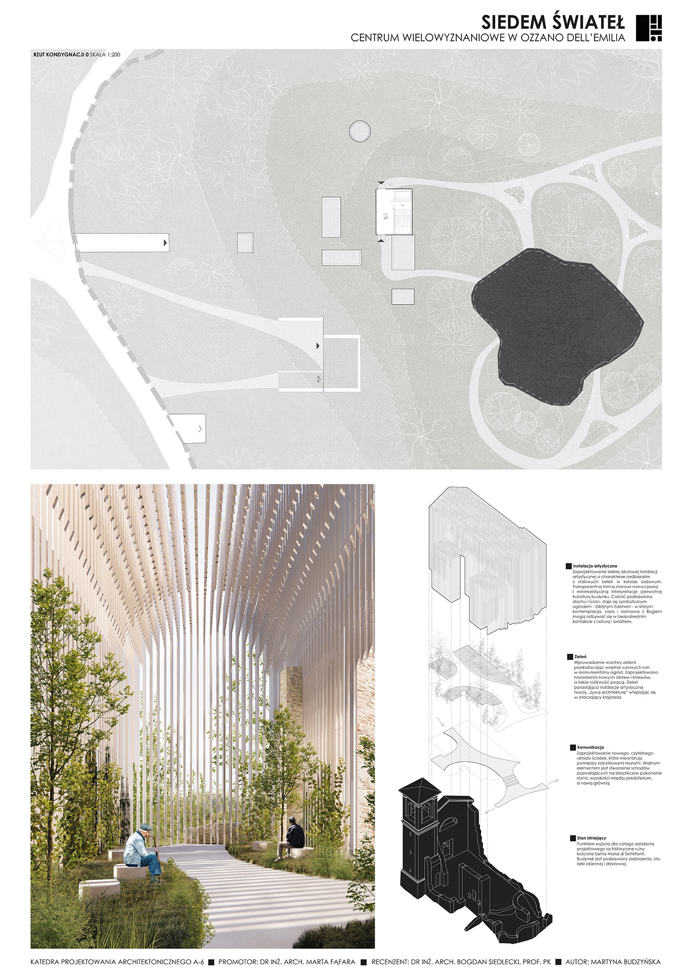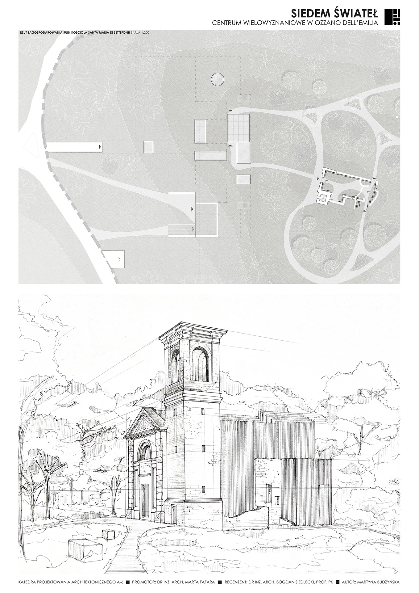 Praca dyplomowa podejmuje problematykę przyszłości architektury sakralnej w obliczu współczesnych przemian społeczno-kulturowych. Część badawcza, zatytułowana „Trwałość Sacrum”, analizuje zjawisko desakralizacji i kryzysu funkcjonalnego świątyń. Poprzez studium porównawcze strategii adaptacji obiektów na świecie, praca weryfikuje wpływ monumentalnej formy na nową funkcję budynku. Przeprowadzone studium prowadzi do wniosku, że najwłaściwszą drogą ratowania obiektów sakralnych jest nadawanie im funkcji publicznych i kulturowych, co stało się punktem wyjścia dla części projektowej – Centrum Wielowyznaniowego „7 Źródeł Światła”, zlokalizowanego na wzgórzu Settefonti we Włoszech.
