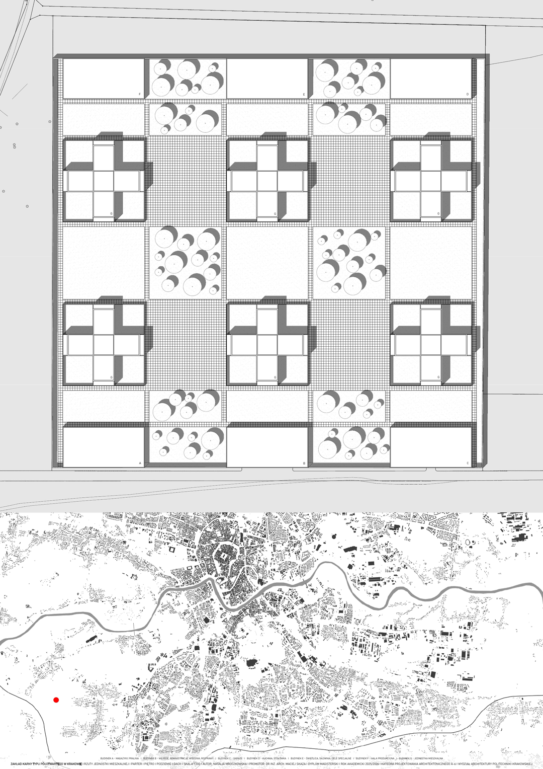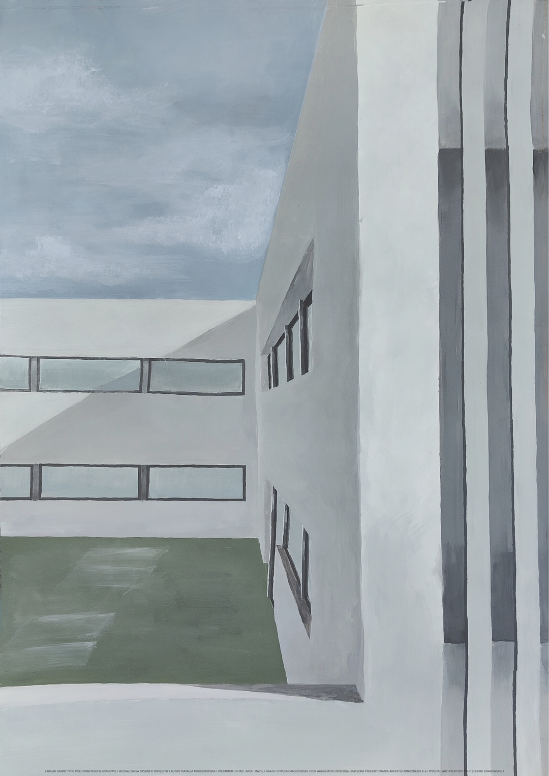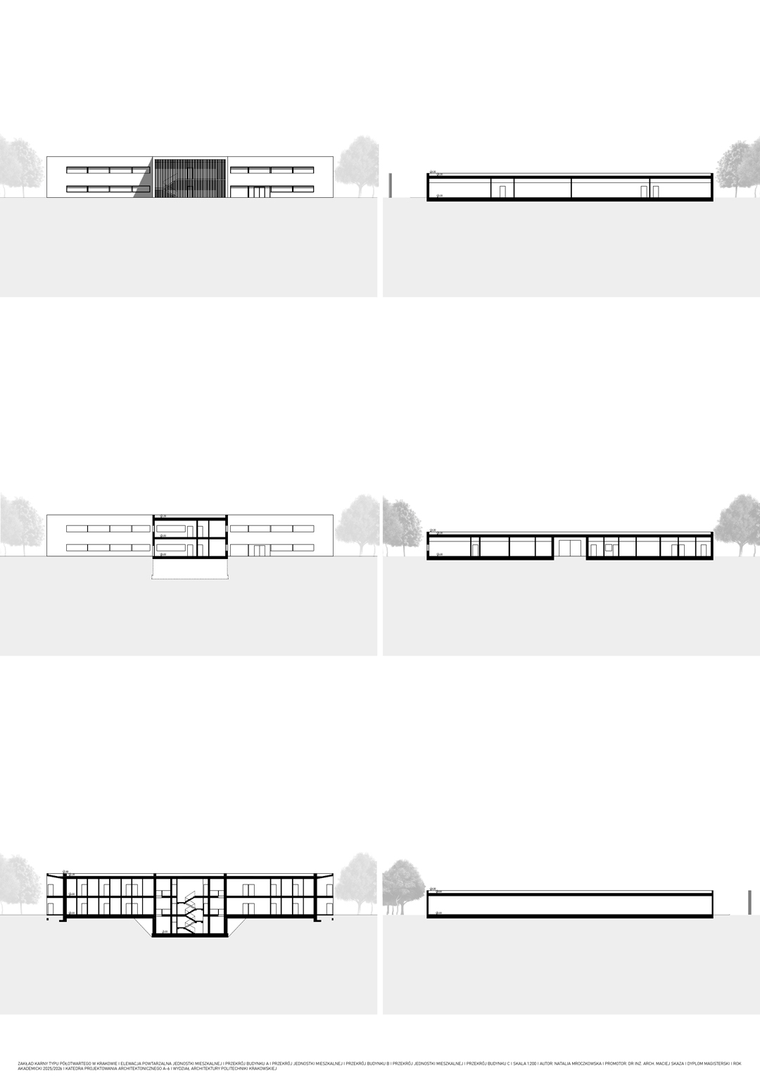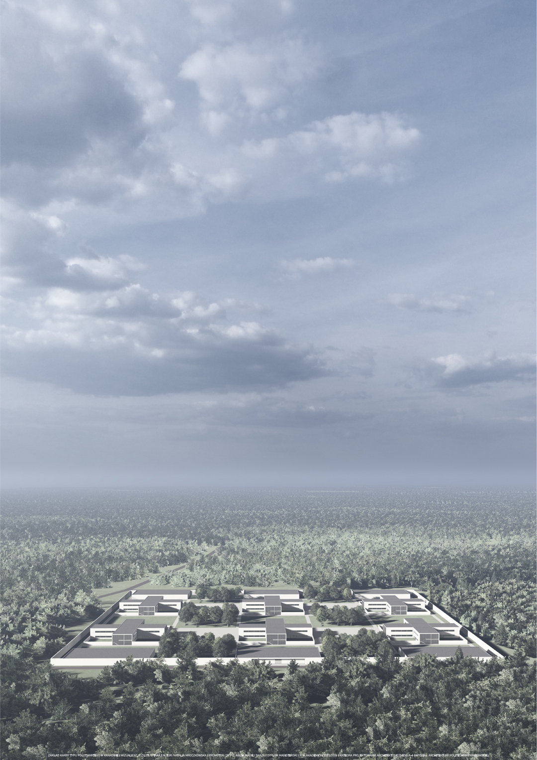 Architektura zakładów karnych często bywa marginalizowana, co wynika z niskiej reprezentacyjności tych obiektów. Ze względu na funkcję jaką pełnią, miasta niechętnie eksponują ich istnienie, traktując je jako niewygodny element infrastruktury. Jakby wstydząc się że istnieje konieczność stawiania więzień, lokalizuje się je zazwyczaj na obrzeżach miast, ukrywając je przed wzrokiem społeczeństwa. Aspekty te przekładają się na niewielkie zainteresowanie projektowe – architektura kary bywa uznawana za monotonną i o schematycznym charakterze, złożoną z murów, krat i betonu. Podejście takie jest jednak uproszczone i krzywdzące dla więzień, które pełnią ważną społeczną rolę. Będąc jedynym środowiskiem życia osób pozbawionych wolności, wywierają na nich istotny wpływ. Rozwiązania przestrzenne mogą wspierać proces resocjalizacji lub utrudniać go. Biorąc pod uwagę, jak duże znaczenie ma dla społeczeństwa skuteczna resocjalizacja, która przekształca osoby wykluczone społecznie w aktywnych obywateli, zadanie jakie ma do wykonania architektura kary okazuje się być ważną misją, która powinna stać się przedmiotem szerokiej dyskusji. W pracy podjęto próbę opracowania zakładu karnego typu półotwartego, który będzie środowiskiem sprzyjającym resocjalizacji. Obiekt złożony z sześciu jednostek mieszkalnych i sześciu budynków pomocniczych mieści się w spokojnej, zielonej okolicy. Rozbudowany układ funkcjonalny oferuje osadzonym możliwość odpoczynku, pracy i terapii, a jednostki mieszkalne podzielone na mniejsze oddziały z przynależnymi ogrodami pomagają tworzyć sąsiedzkie społeczności imitujące życie wolnościowe. Rozbicie założenia na mniejsze budynki daje wrażenie osiedla mieszkalnego, co stoi w opozycji do historycznych więzień–twierdz. Projektowany zakład karny skupiony jest na przygotowaniu skazanych do opuszczenia go, zamiast na karaniu ich poprzez warunki środowiska, którego nie mogą opuścić.