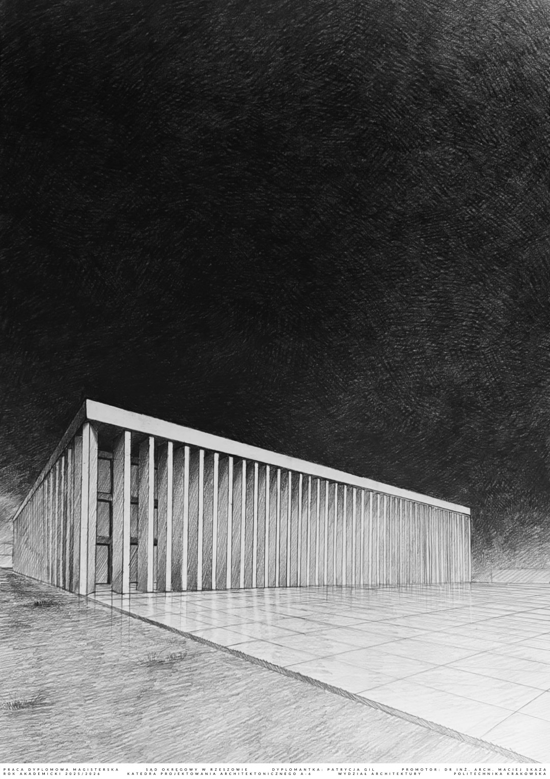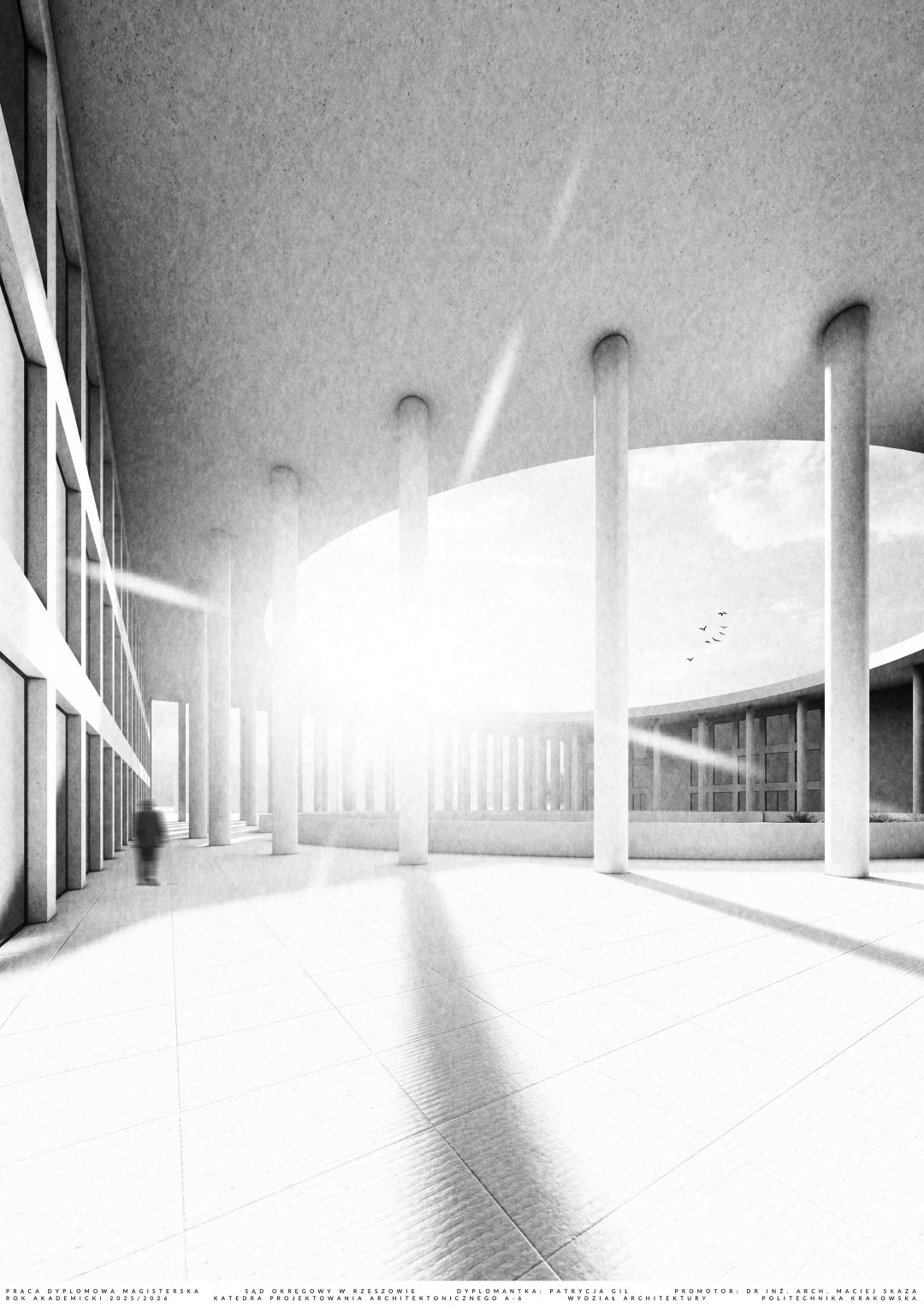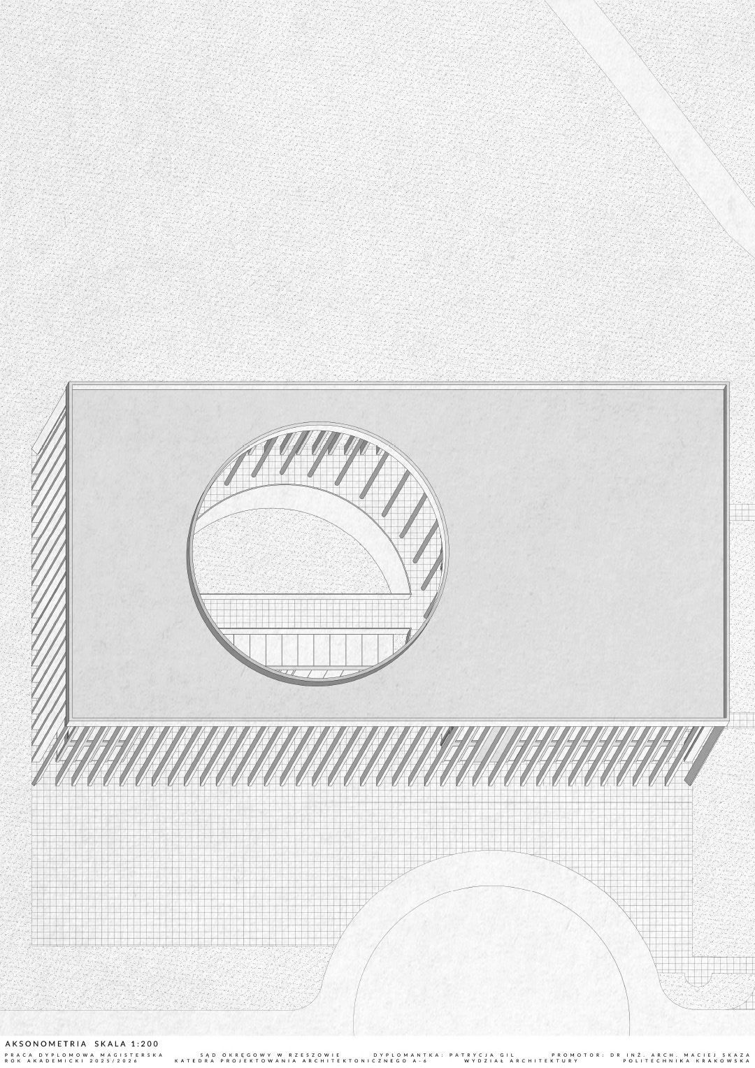 W części teoretycznej skupiono się na zagadnieniu monumentalizmu, ze szczególnym uwzględnieniem jego obecności w architekturze wymiaru sprawiedliwości. Przytoczono definicje pojęcia nakreślające jego cechy charakterystyczne, a także przedstawiono elementy architektury wpływające na monumentalność budynków sądów. W części projektowej praca dotyczy budynku Sądu Okręgowego w Rzeszowie. Jest on odpowiedzią na potrzebę nowej siedziby wymiaru sprawiedliwości w stolicy województwa podkarpackiego. Bryła obiektu składa się z dwóch nadziemnych prostopadłościennych części przykrytych obudową w postaci dachu płaskiego z okrągłym otworem oraz kolumnady otaczającej całe założenie. Otwór w dachu został podkreślony przez zastosowanie okrągłych kolumn. Budynek posiada trzy kondygnacje nadziemne oraz jedną podziemną, gdzie części nadziemne łączą się ze sobą. Na kondygnacji podziemnej zlokalizowano garaż, pomieszczenia techniczne, kawiarnię oraz dwa patia z projektowaną zielenią, widoczną z poziomu parteru wewnętrznego dziedzińca. Na parterze i kolejnych kondygnacjach znajdują się między innymi sale rozpraw, pomieszczenia biurowe oraz obsługi interesantów czy archiwa. Przed wejściem do budynku zaprojektowano plac, a wokół obiektu zieleń niską oraz wysoką. Elewacje sądu charakteryzuje powtarzalny układ kolumn oraz okien tworzących harmonijną strukturę wykończoną jasnoszarymi płytami betonowymi. Zaprojektowany obiekt posiada prostą, monumentalną bryłę.
