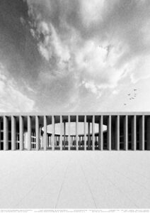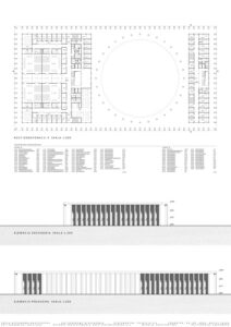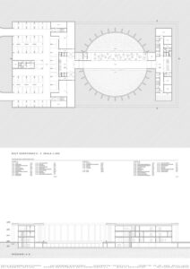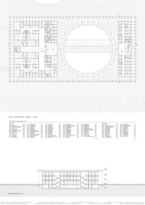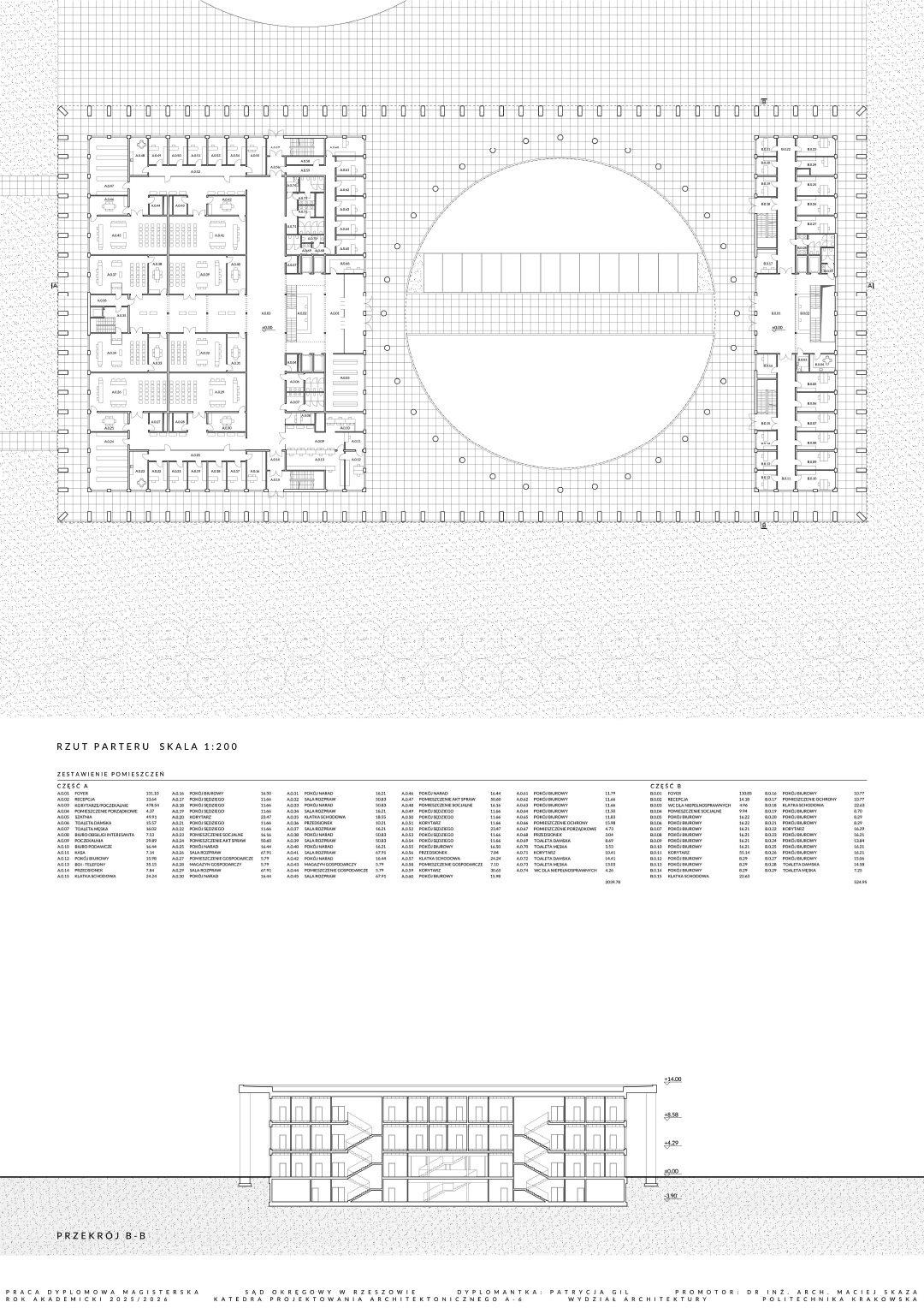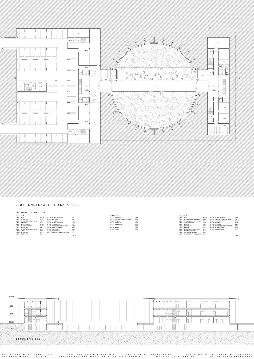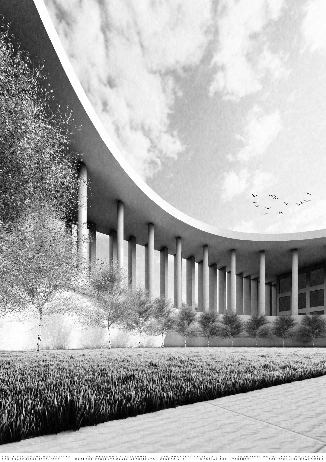 W części teoretycznej skupiono się na zagadnieniu monumentalizmu, ze szczególnym uwzględnieniem jego obecności w architekturze wymiaru sprawiedliwości. Przytoczono definicje pojęcia nakreślające jego cechy charakterystyczne, a także przedstawiono elementy architektury wpływające na monumentalność budynków sądów. W części projektowej praca dotyczy budynku Sądu Okręgowego w Rzeszowie. Jest on odpowiedzią na potrzebę nowej siedziby wymiaru sprawiedliwości w stolicy województwa podkarpackiego. Bryła obiektu składa się z dwóch nadziemnych prostopadłościennych części przykrytych obudową w postaci dachu płaskiego z okrągłym otworem oraz kolumnady otaczającej całe założenie. Otwór w dachu został podkreślony przez zastosowanie okrągłych kolumn. Budynek posiada trzy kondygnacje nadziemne oraz jedną podziemną, gdzie części nadziemne łączą się ze sobą. Na kondygnacji podziemnej zlokalizowano garaż, pomieszczenia techniczne, kawiarnię oraz dwa patia z projektowaną zielenią, widoczną z poziomu parteru wewnętrznego dziedzińca. Na parterze i kolejnych kondygnacjach znajdują się między innymi sale rozpraw, pomieszczenia biurowe oraz obsługi interesantów czy archiwa. Przed wejściem do budynku zaprojektowano plac, a wokół obiektu zieleń niską oraz wysoką. Elewacje sądu charakteryzuje powtarzalny układ kolumn oraz okien tworzących harmonijną strukturę wykończoną jasnoszarymi płytami betonowymi. Zaprojektowany obiekt posiada prostą, monumentalną bryłę.