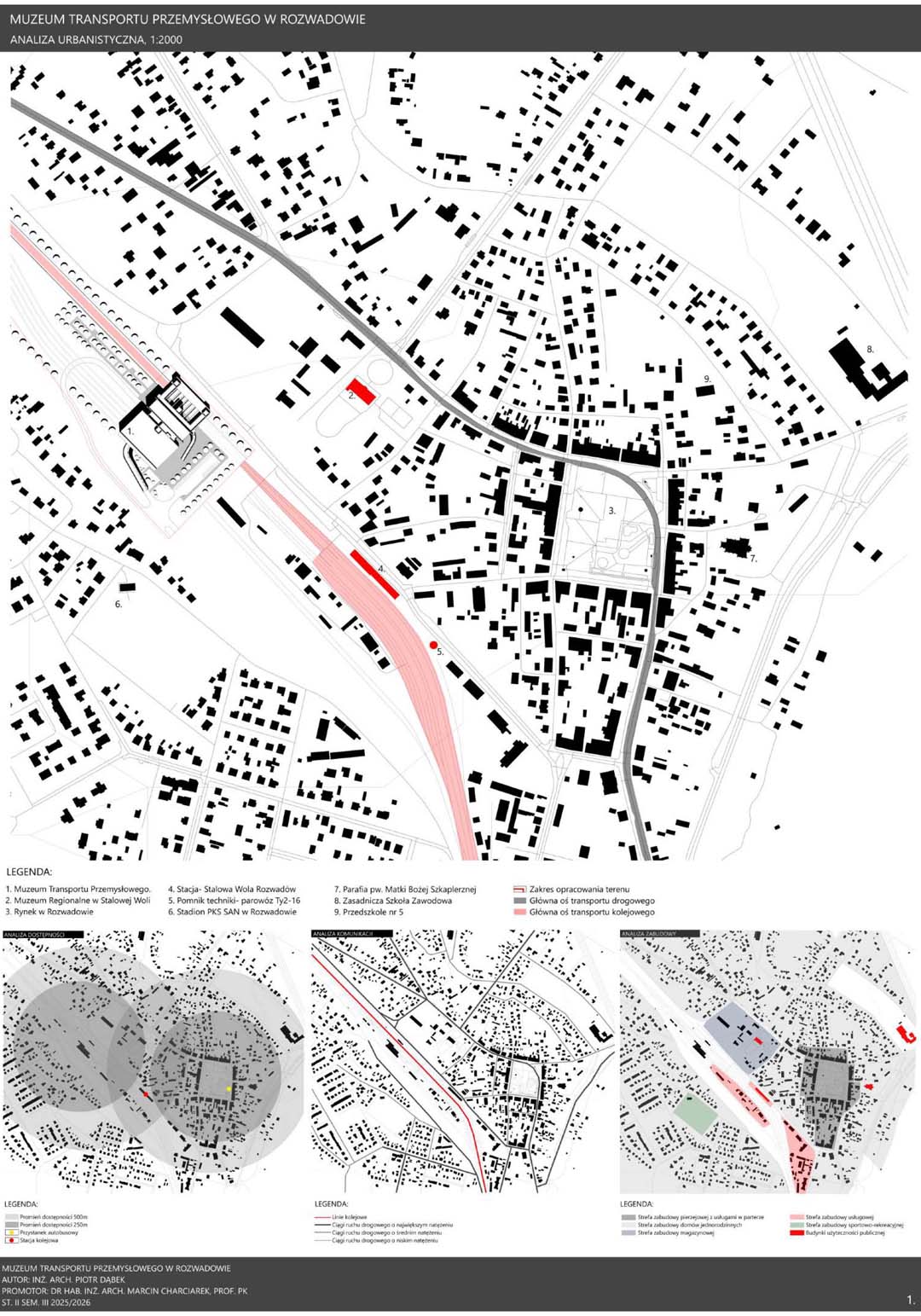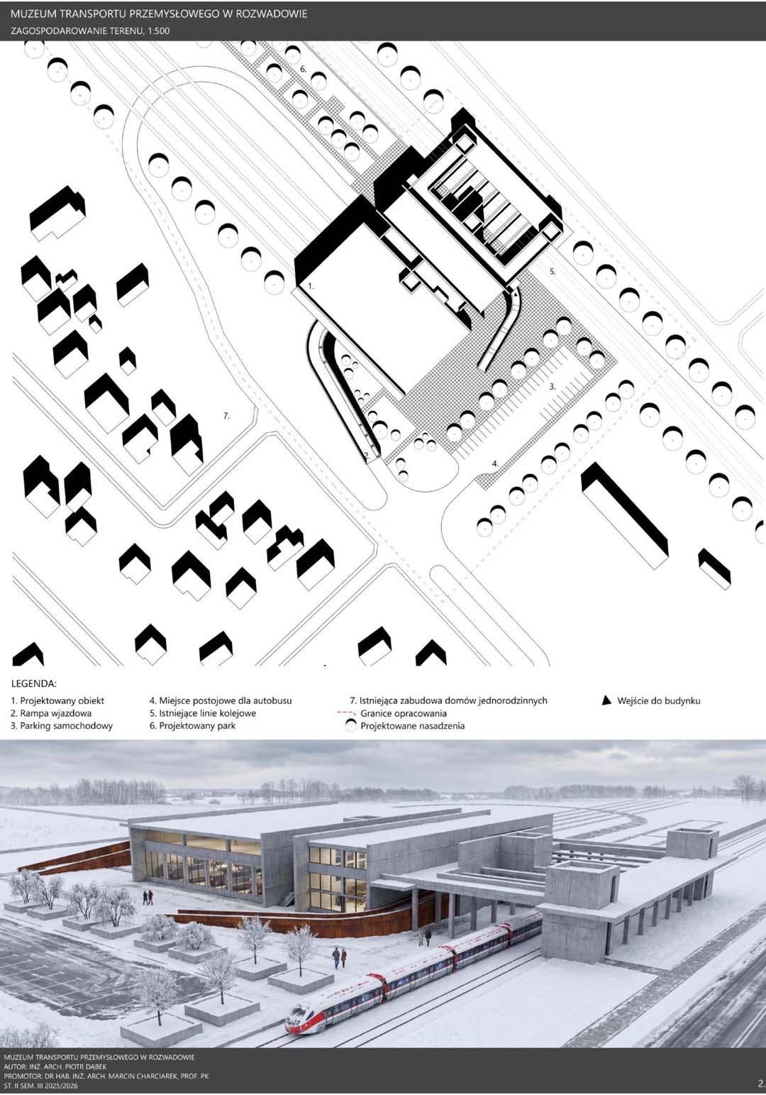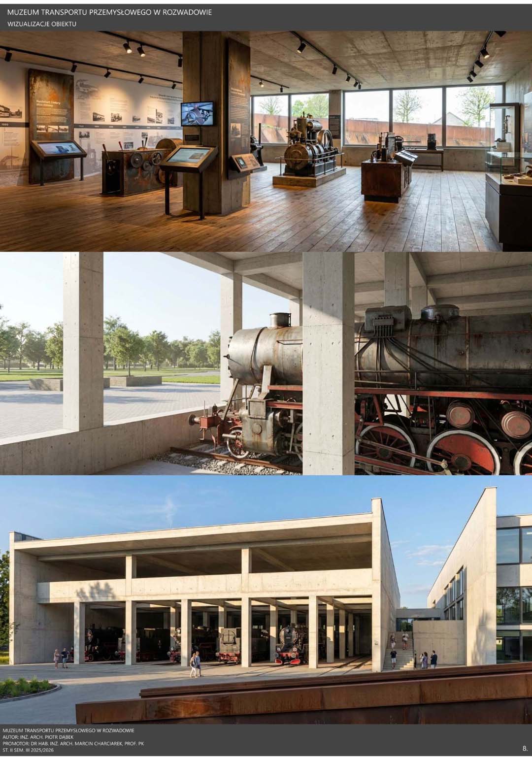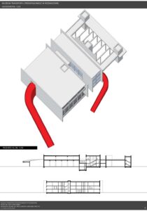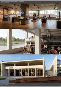 Transport od wieków stanowił jeden z kluczowych czynników rozwoju cywilizacyjnego, wpływając na gospodarkę, strukturę państw oraz codzienne życie społeczeństw. Szczególne znaczenie zyskał w okresie rewolucji przemysłowej, kiedy rozwój kolei i innych środków komunikacji przyczynił się do intensywnej urbanizacji oraz wzrostu mobilności. Postęp techniczny pozostawił liczne materialne świadectwa, które dziś stanowią ważny element dziedzictwa kulturowego, chronionego przez muzea transportu przemysłowego. Instytucje te zajmują się ochroną zabytków techniki, takich jak lokomotywy, tramwaje czy elementy infrastruktury, prowadząc prace konserwatorskie oraz gromadząc dokumentację historyczną. Istotną rolę pełnią również funkcje edukacyjne, umożliwiające poznanie procesów technologicznych poprzez ekspozycje i nowoczesne formy przekazu. Muzea transportu wzmacniają także tożsamość regionalną, przypominając o znaczeniu przemysłu w rozwoju lokalnych społeczności oraz stając się ważnym elementem turystyki poprzemysłowej. Projekt Muzeum Transportu Przemysłowego w Rozwadowie wyrasta z silnych związków miejsca z koleją i technologią. Jego architektura stanowi współczesną interpretację infrastruktury transportowej poprzez zastosowanie ramp, wiaduktów i monumentalnych hal. Horyzontalna bryła składa się z prefabrykowanych bloków betonowych o zróżnicowanej skali, odpowiadającej funkcjom obiektu. Integralną częścią założenia są torowiska prowadzące bezpośrednio do muzeum, wzmacniające autentyczność przestrzeni. Całość tworzy spójny, symboliczny obiekt łączący przeszłość z teraźniejszością.