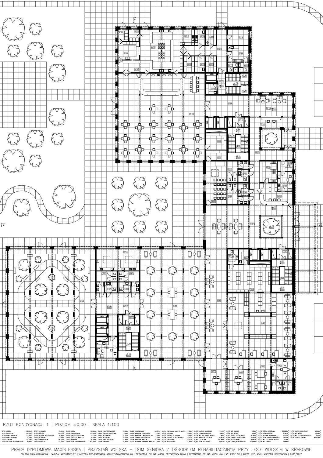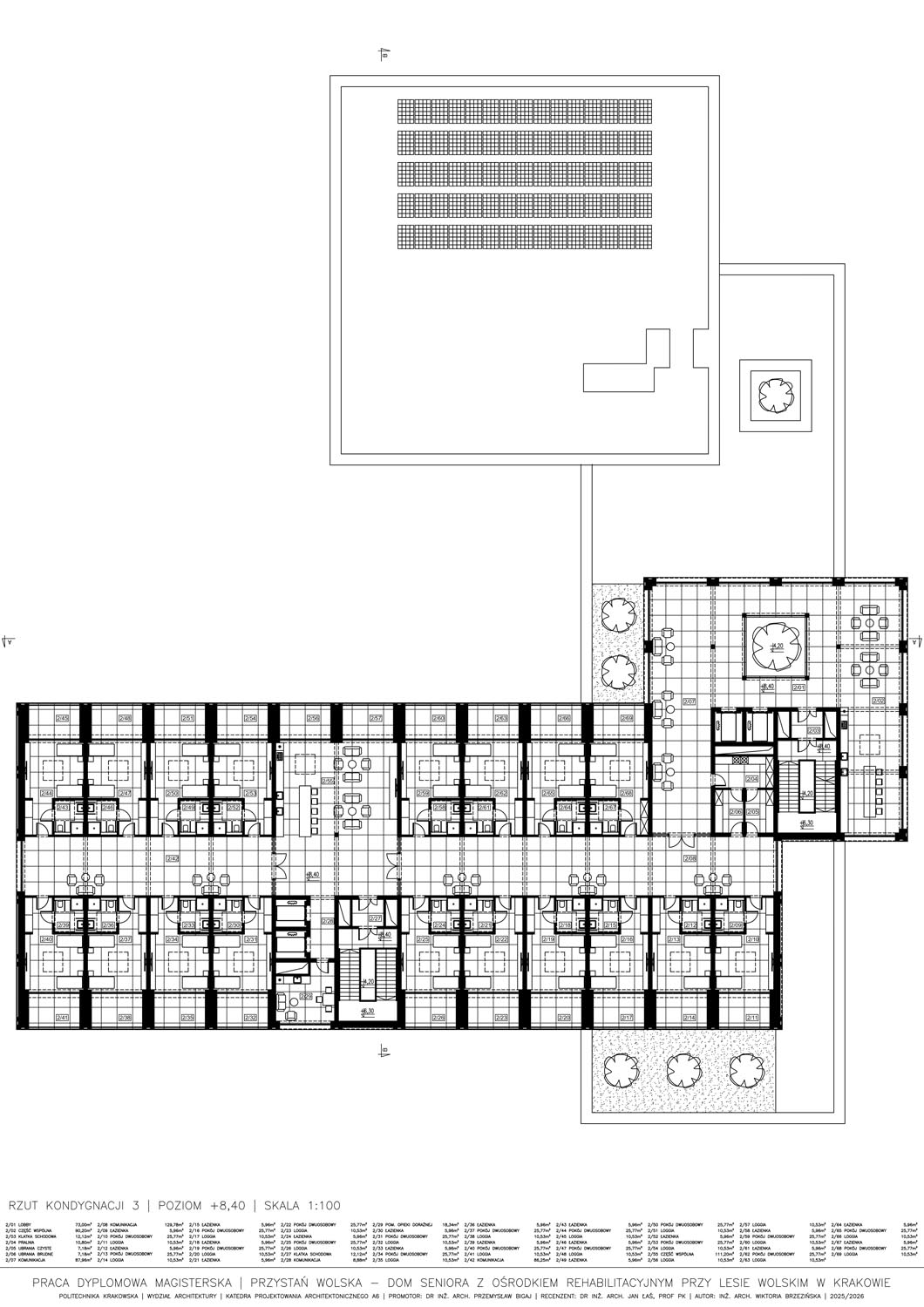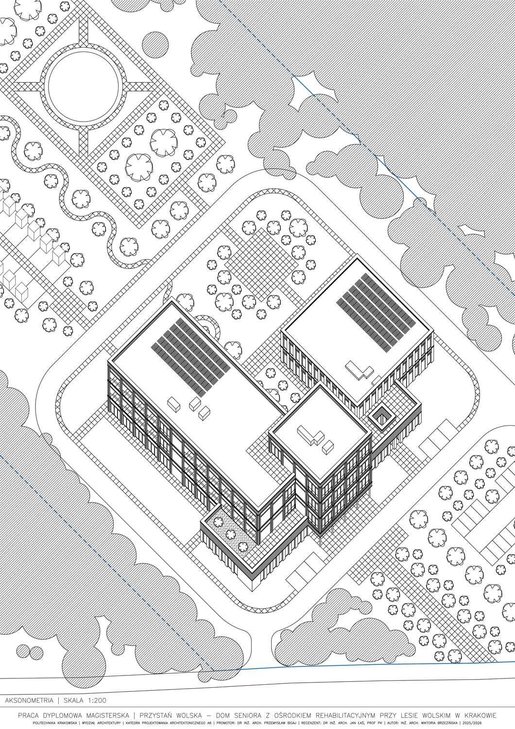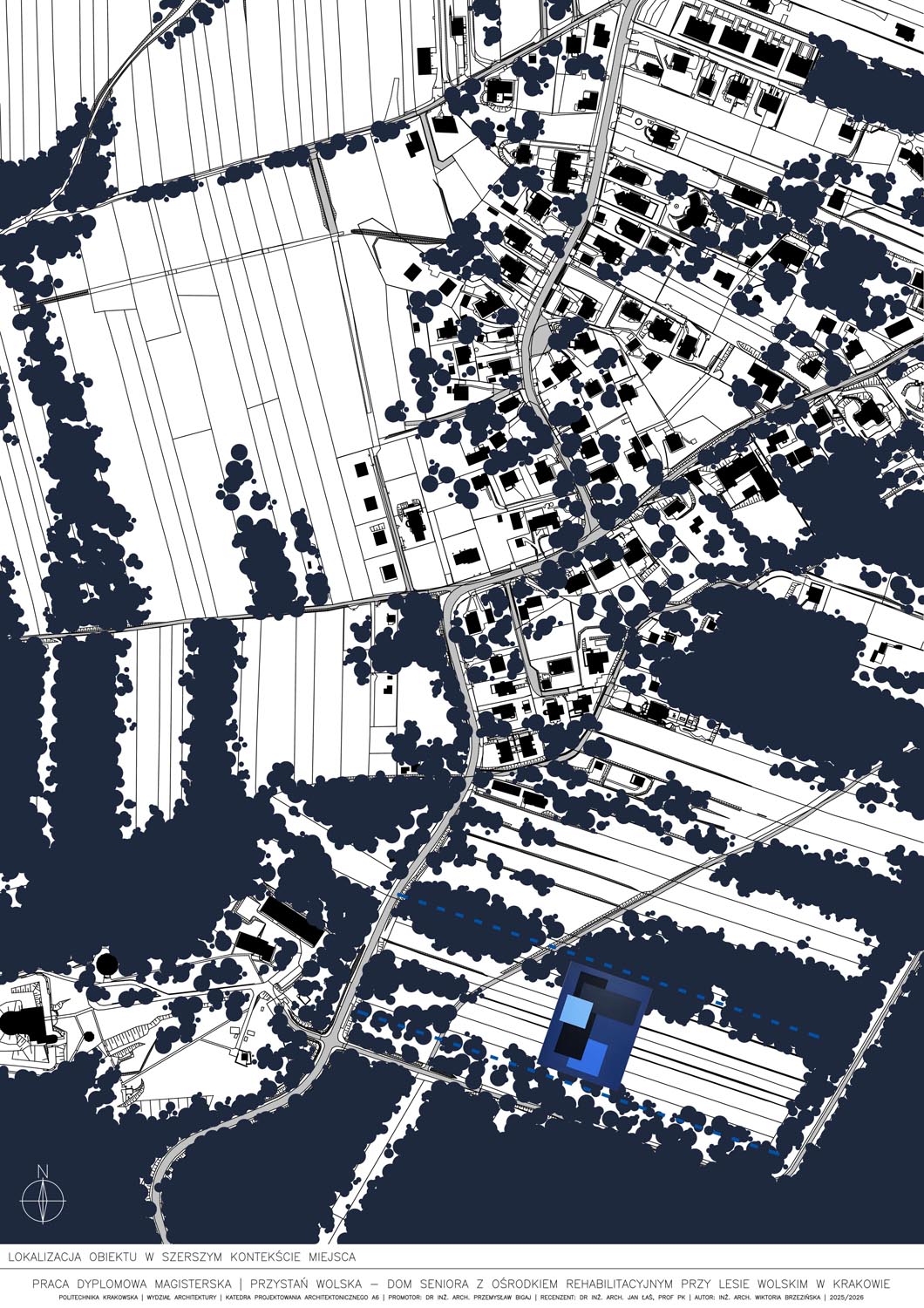 Część pisemna pracy rozwija wątek roli otoczenia w kształtowaniu architektury i jakości życia mieszkańców domów seniora. Bada, jak lokalizacja i typ otoczenia (miejski, podmiejski, naturalny) wpływają na architekturę, funkcjonalność i percepcję przestrzeni przez zamieszkujących seniorów. Praca analizuje także standardy i wytyczne projektowe dotyczące domów opieki, w tym wymagania funkcjonalne, dostępności jak i bezpieczeństwa. Uzupełnieniem części opisowej jest opis idei, analizy, zdjęcia stanu istniejącego wybranej lokalizacji oraz opis techniczny projektowanego domu seniora.