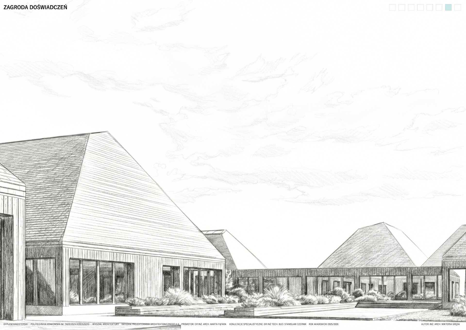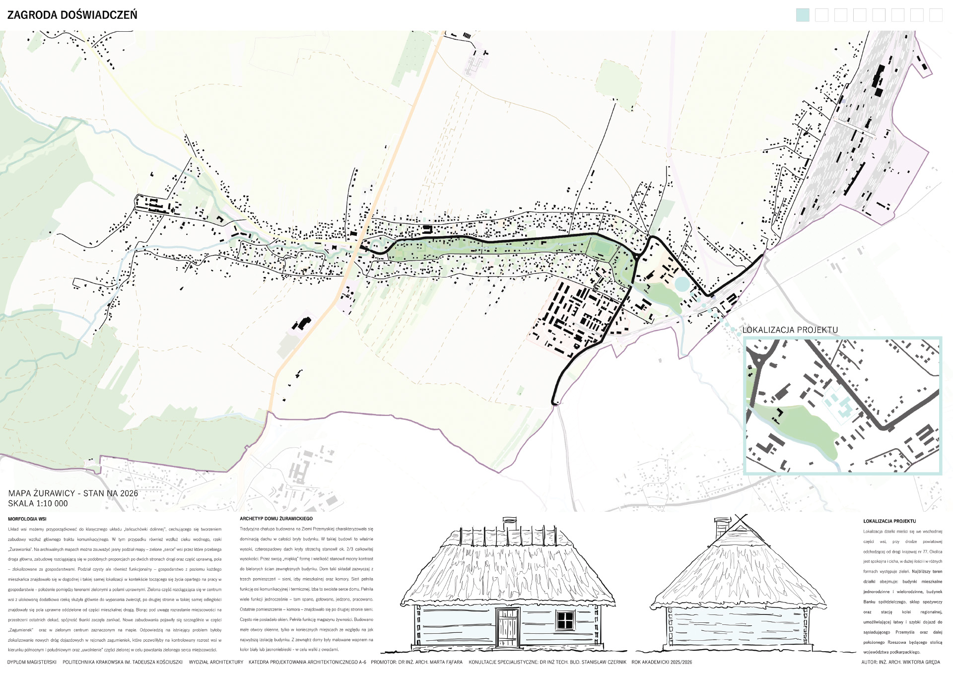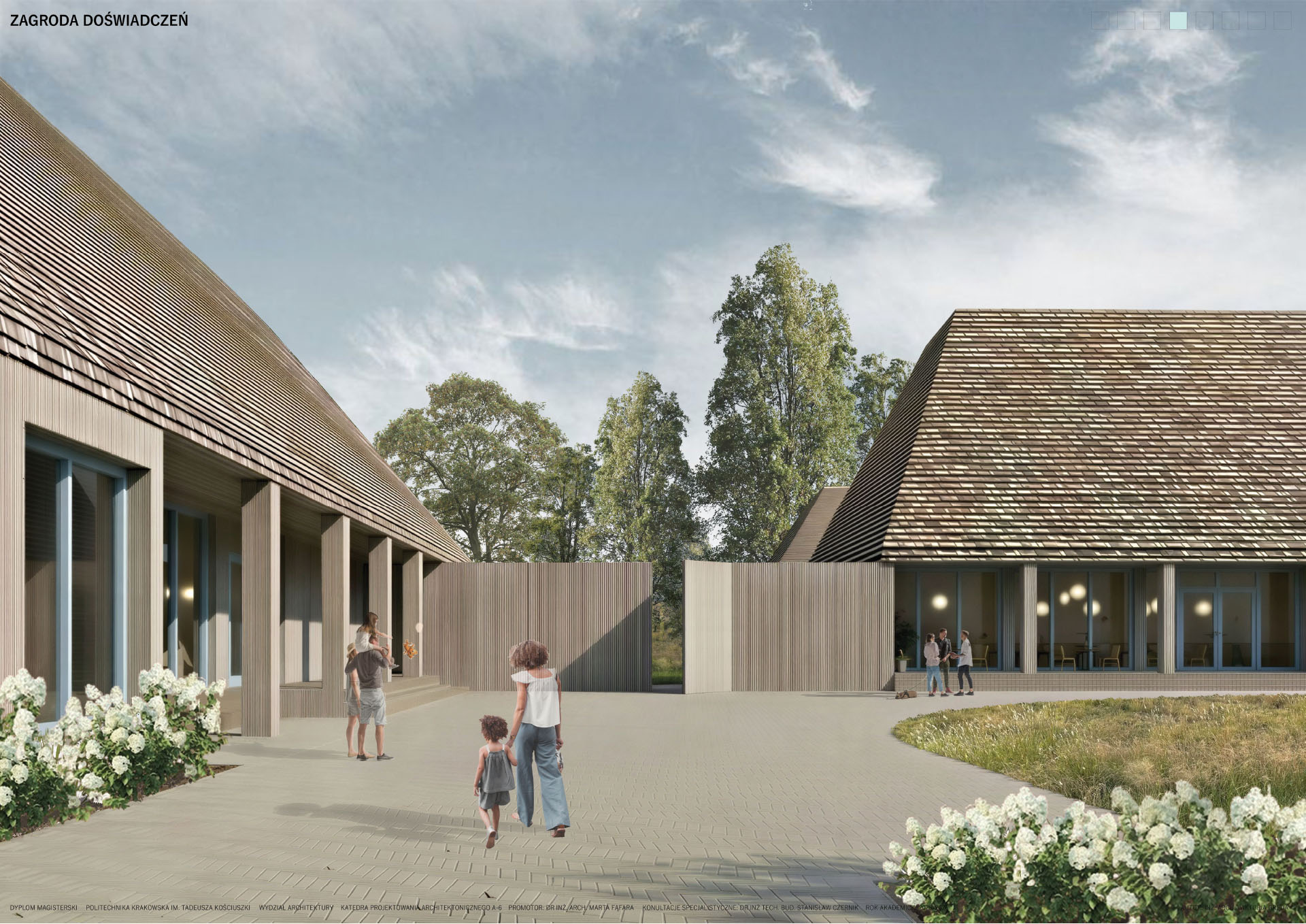 Zagroda Doświadczeń to projekt zespołu budynków zlokalizowanych w podkarpackiej wsi Żurawica, którego celem jest odtworzenie i twórcza interpretacja lokalnego archetypu zabudowy wiejskiej. Linearny układ wsi oraz zachowane ślady dawnych „błoń” stały się punktem wyjścia do analizy historycznego układu urbanistycznego i jego współczesnej adaptacji. Projekt sytuowany jest na zakończeniu głównej osi kompozycyjnej, w bezpośrednim sąsiedztwie parku, gdzie powstaje zagroda jako miejsce otwarte, integrujące lokalną społeczność.