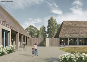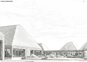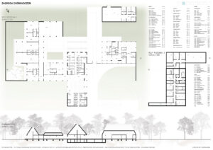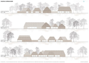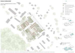 Świadoma kompozycja zespołu zakłada rozczłonkowanie programu na kilka mniejszych obiektów, co pozwala zachować kameralną skalę architektury użyteczności publicznej i harmonijnie wpisać ją w wiejskie otoczenie. Dzięki temu powstają zróżnicowane wnętrza urbanistyczne – od ogólnodostępnych placów po bardziej prywatne przestrzenie, takie jak place zabaw czy ogrody warzywne.