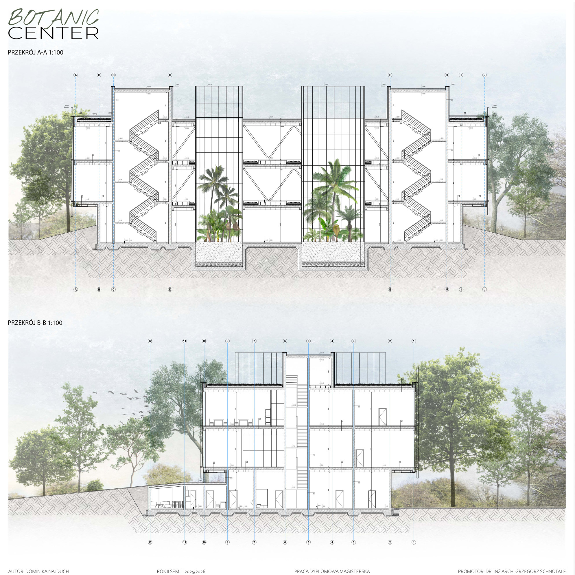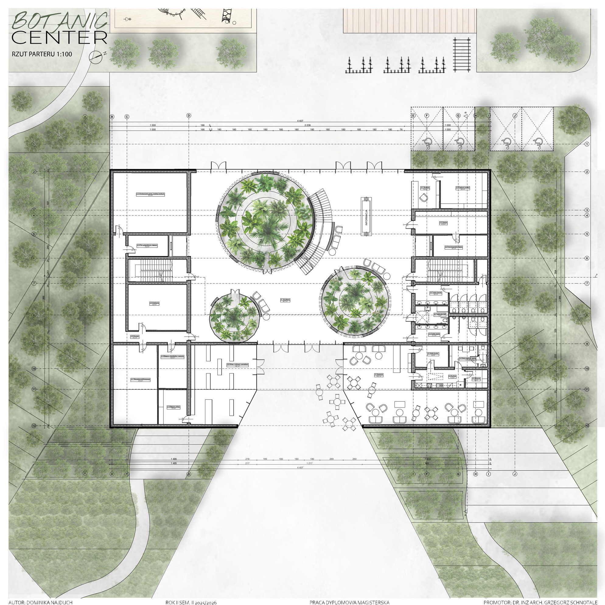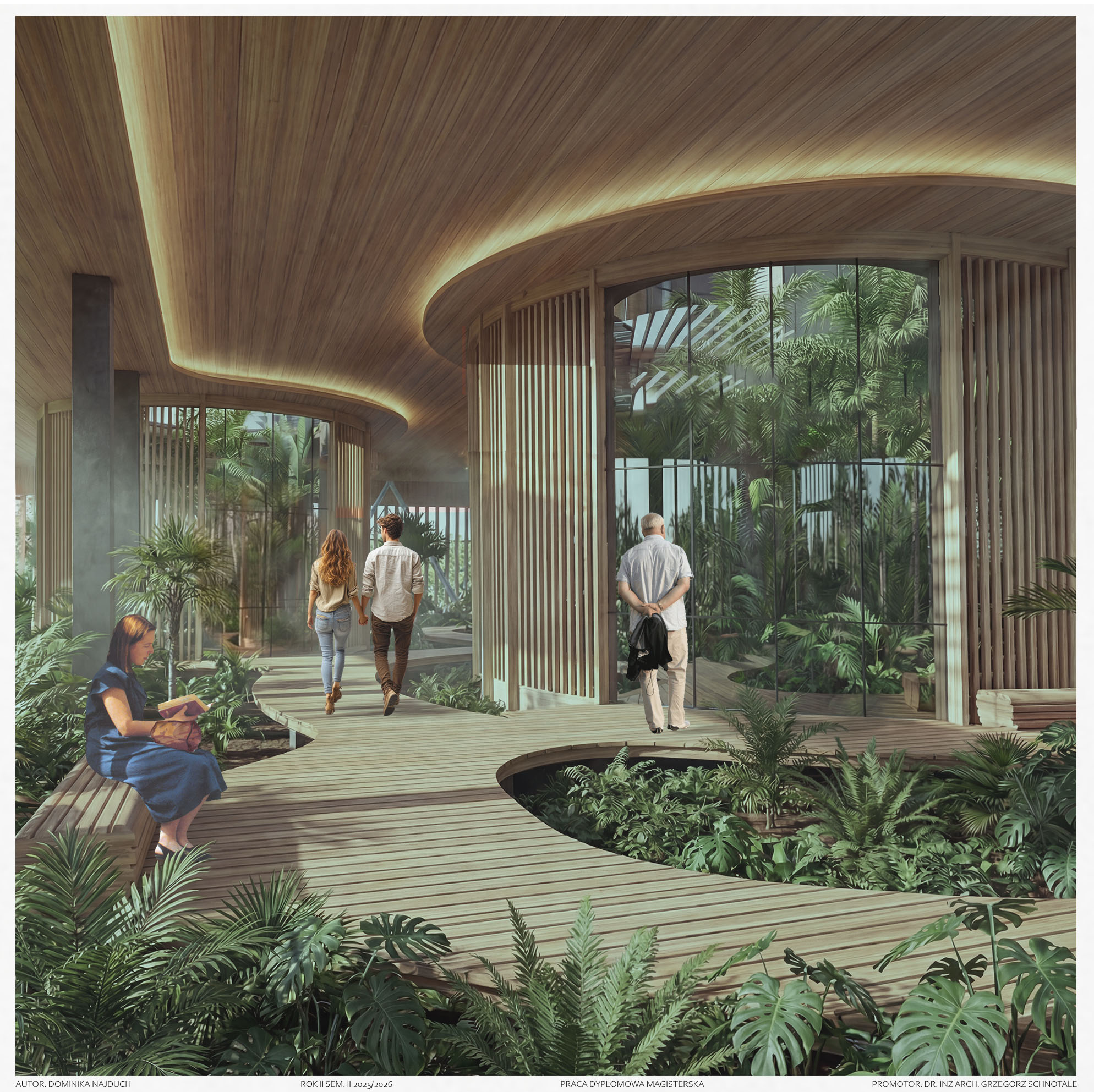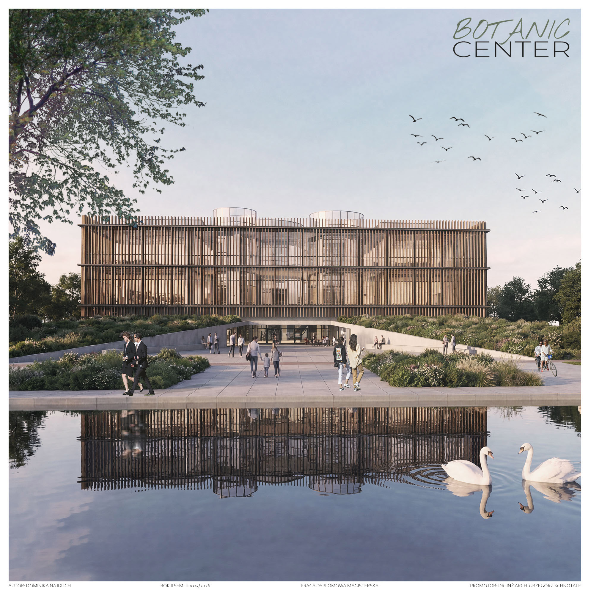 Część teoretyczna omawia pojęcie architektury biofilnej, jej genezę, główne założenia oraz wpływ na zdrowie i samopoczucie użytkowników. Uzupełnieniem tej części jest analiza społeczna oparta na wynikach ankiety dotyczącej postrzegania zieleni i potrzeby tworzenia obiektów zintegrowanych z naturą. Część projektowa obejmuje koncepcję architektoniczną centrum botanicznego wraz z opisem technicznym i opracowaniem graficznym.
