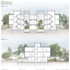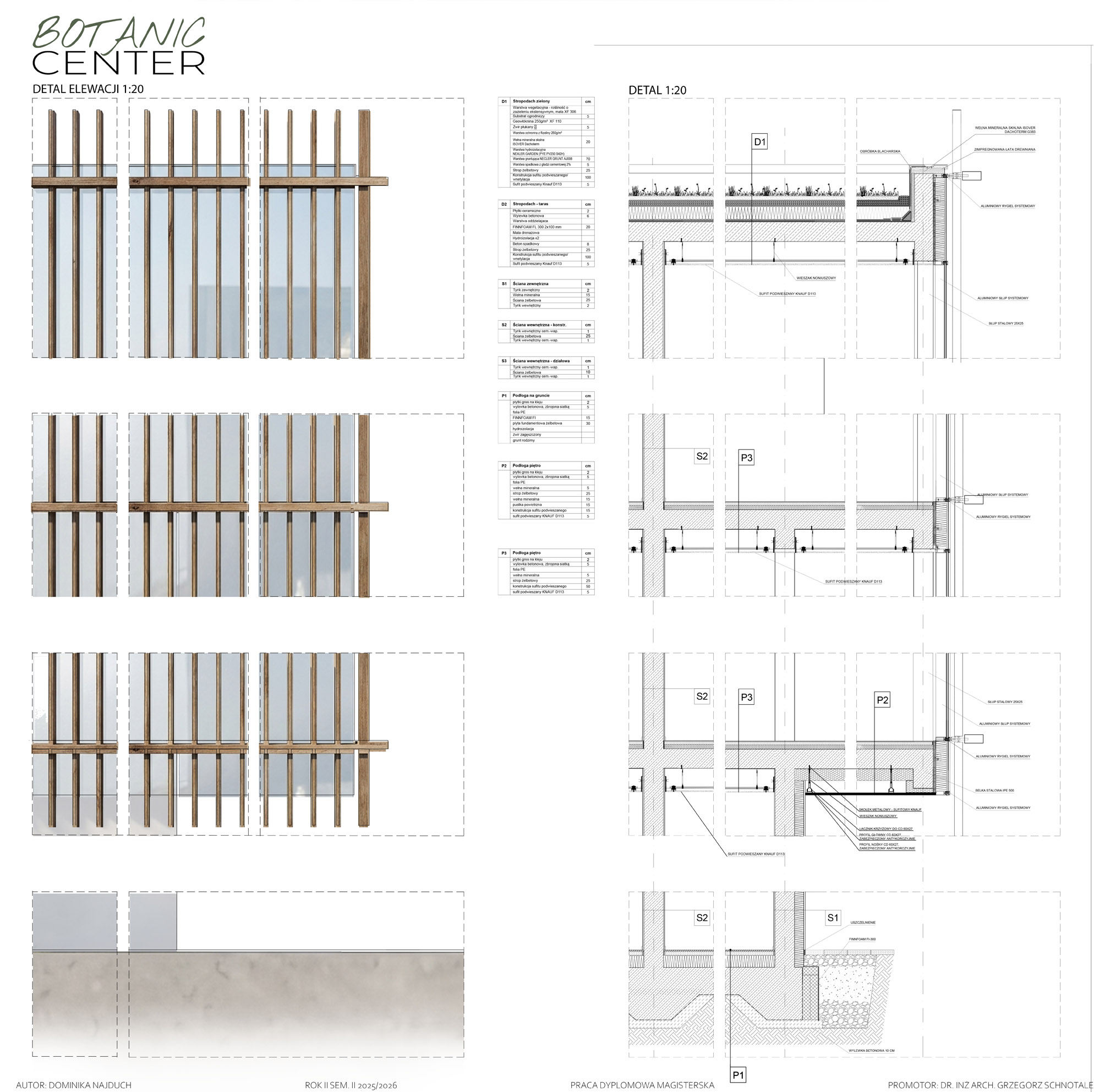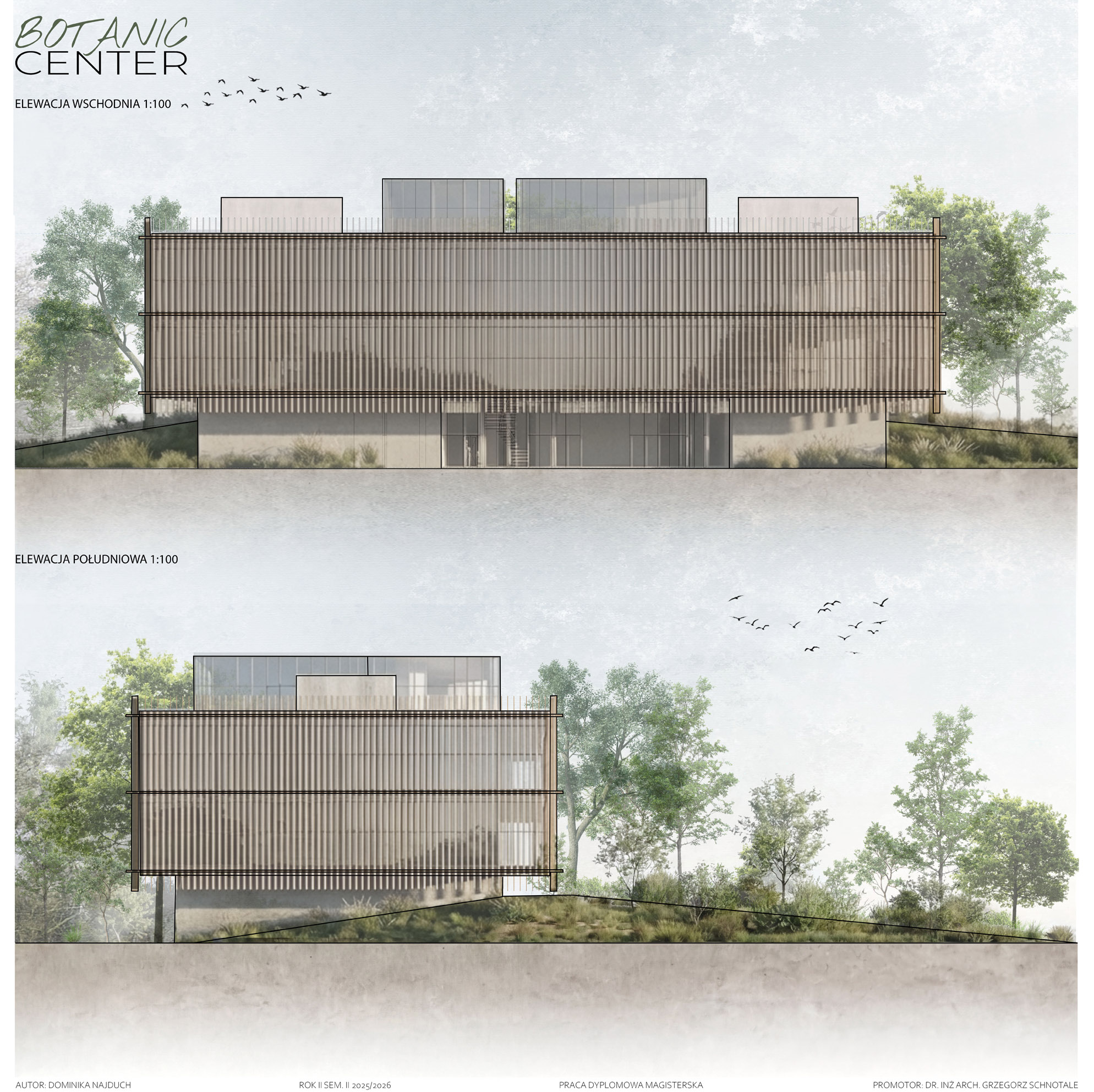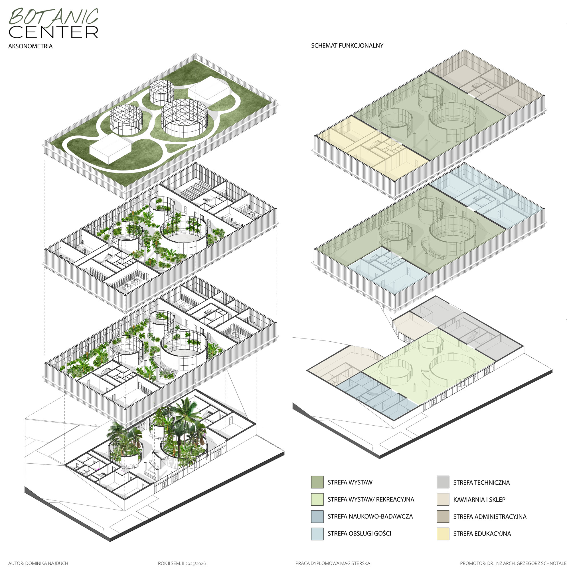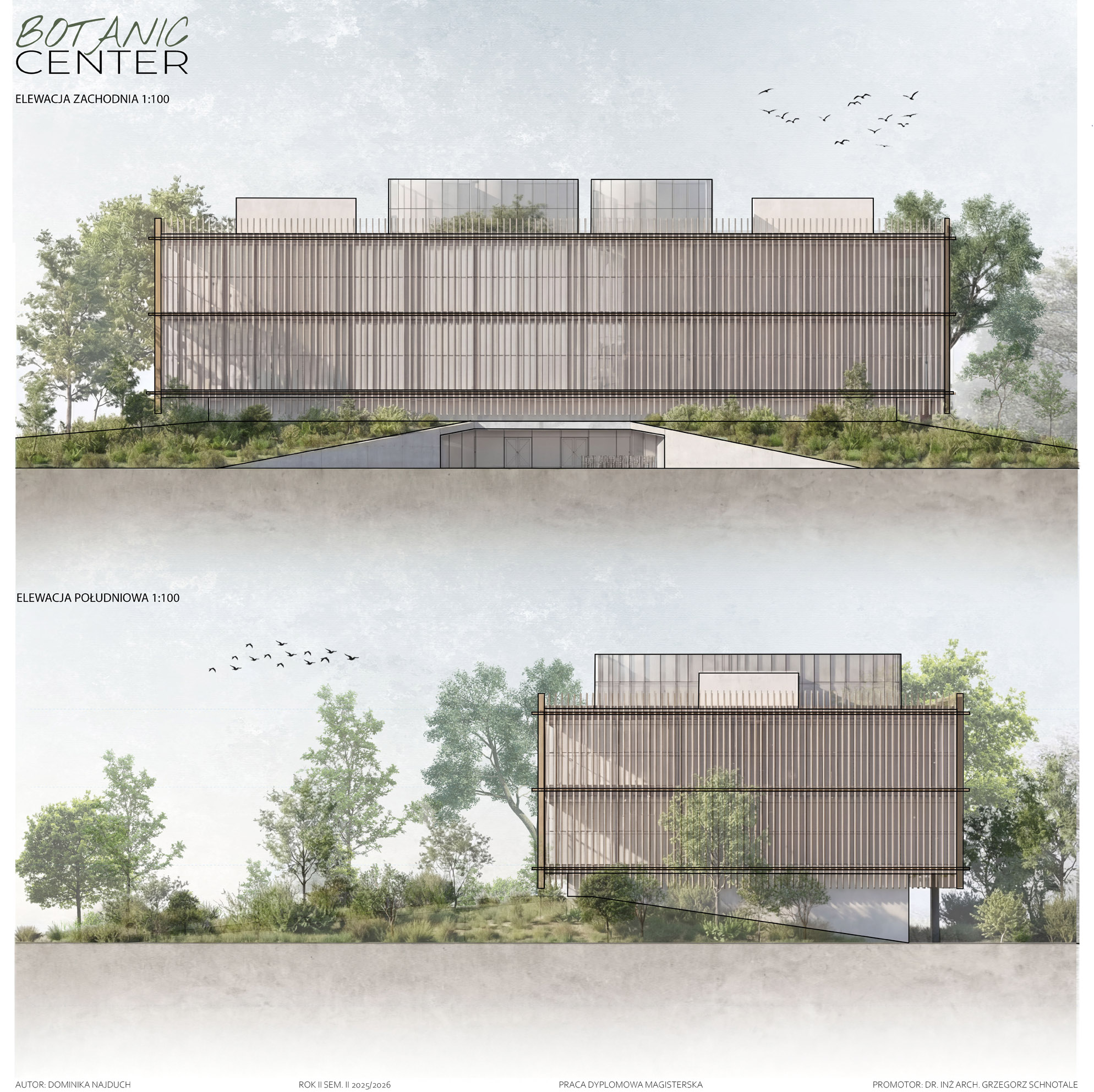 Część teoretyczna omawia pojęcie architektury biofilnej, jej genezę, główne założenia oraz wpływ na zdrowie i samopoczucie użytkowników. Uzupełnieniem tej części jest analiza społeczna oparta na wynikach ankiety dotyczącej postrzegania zieleni i potrzeby tworzenia obiektów zintegrowanych z naturą. Część projektowa obejmuje koncepcję architektoniczną centrum botanicznego wraz z opisem technicznym i opracowaniem graficznym.