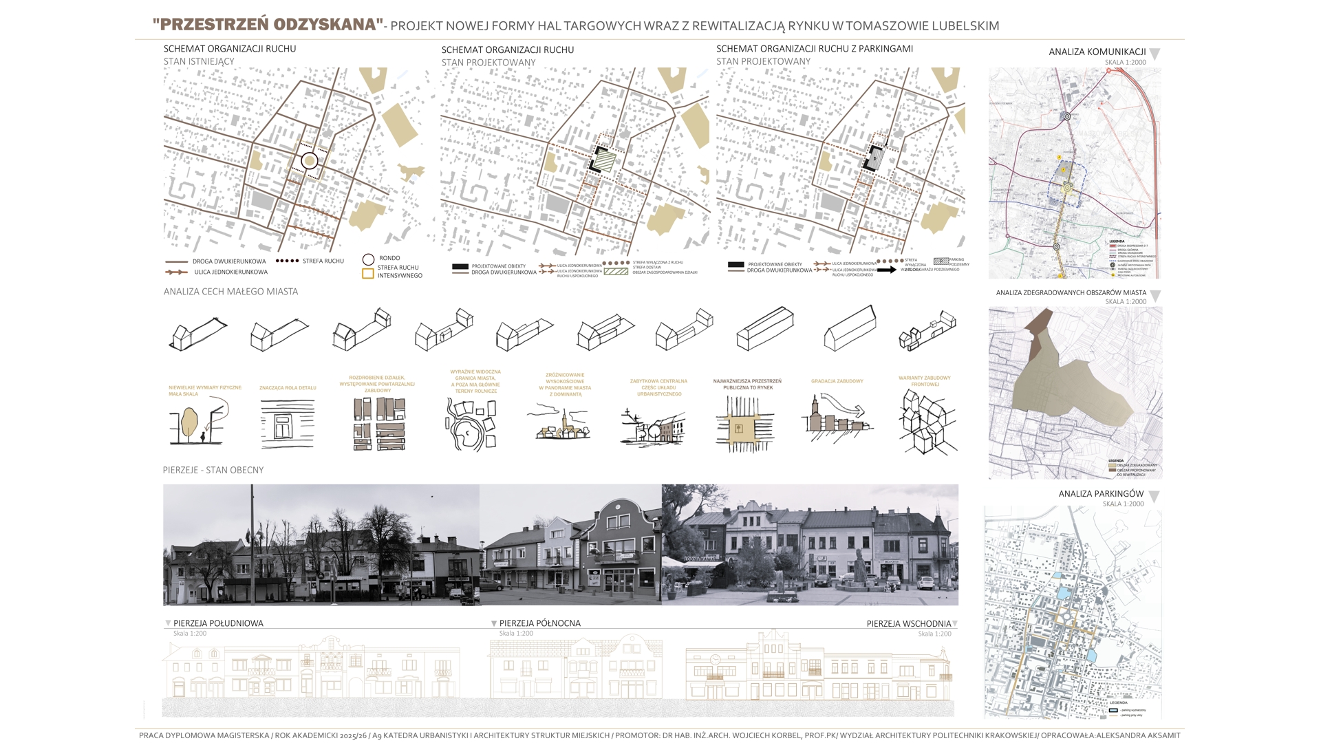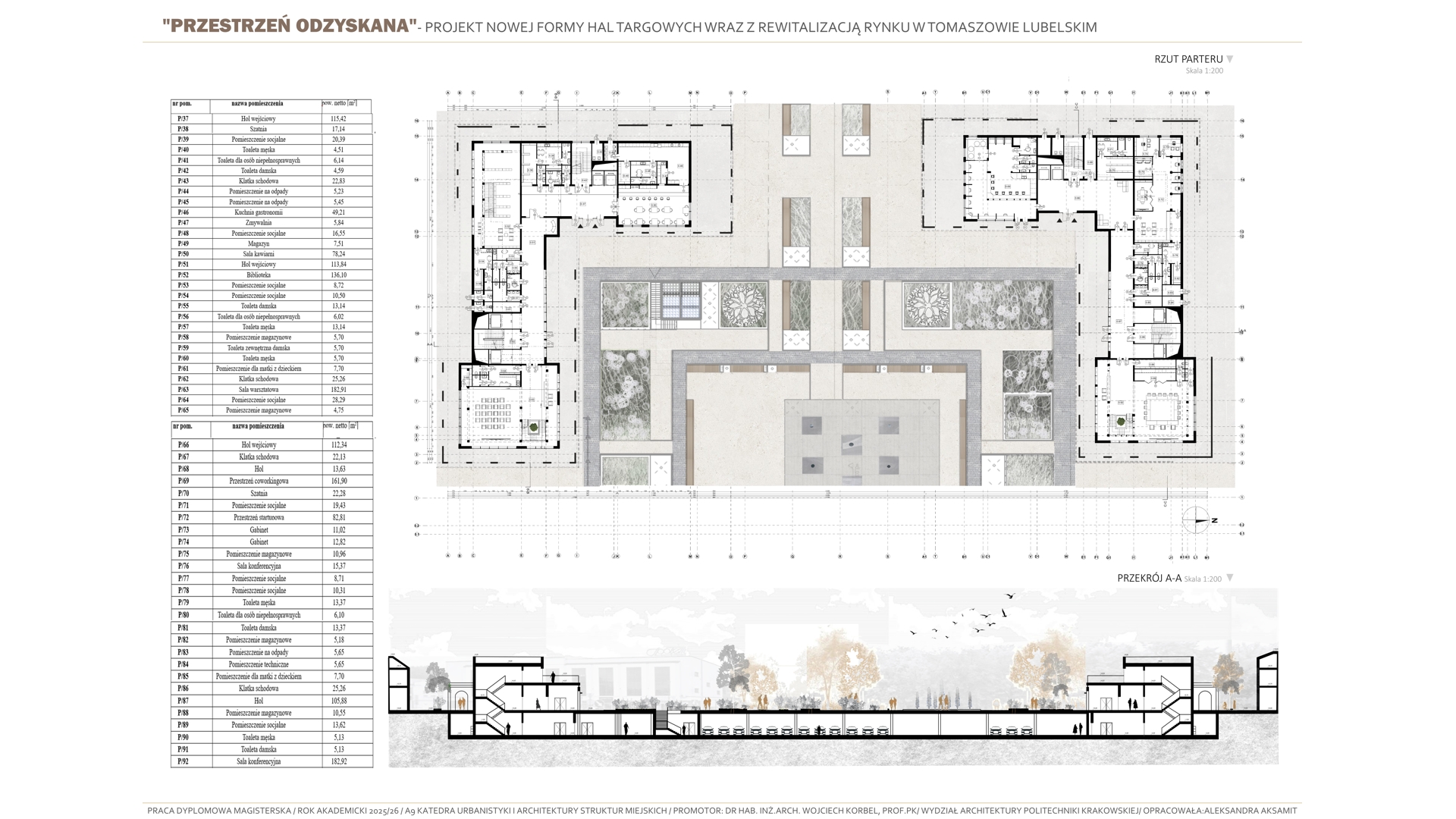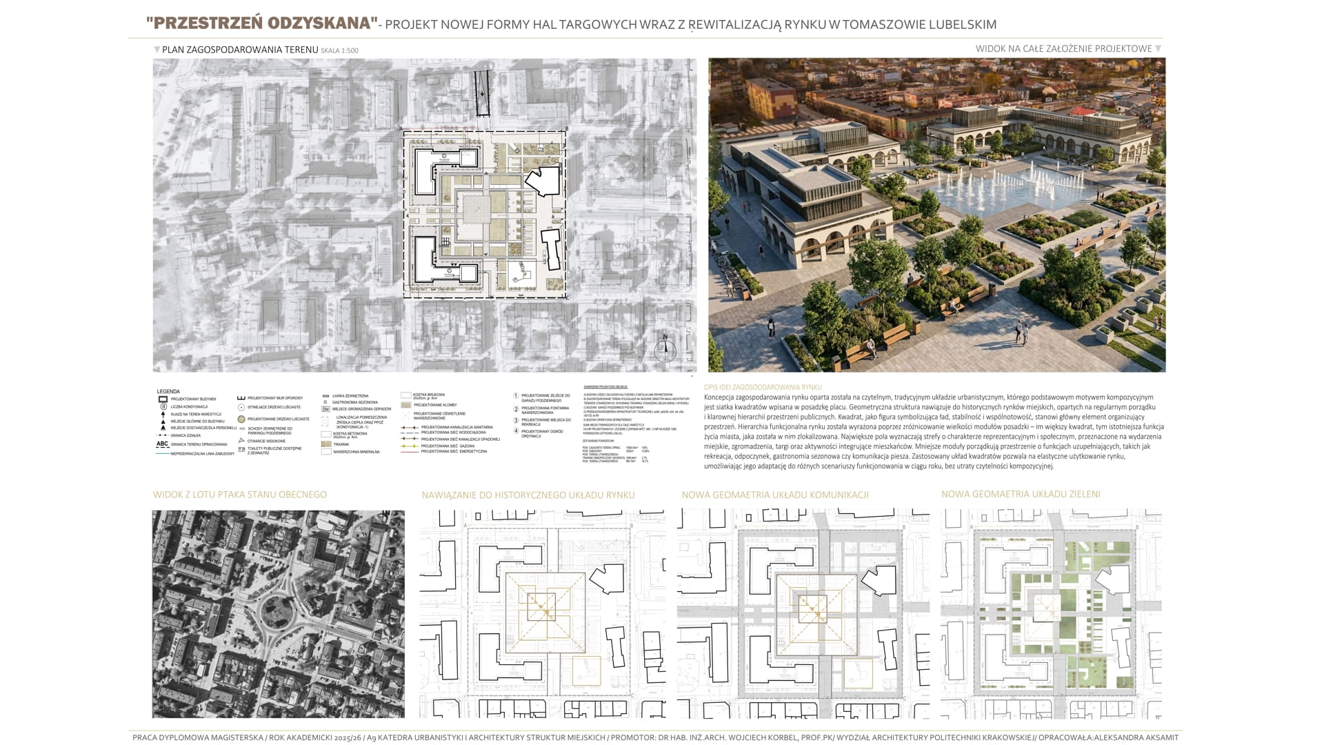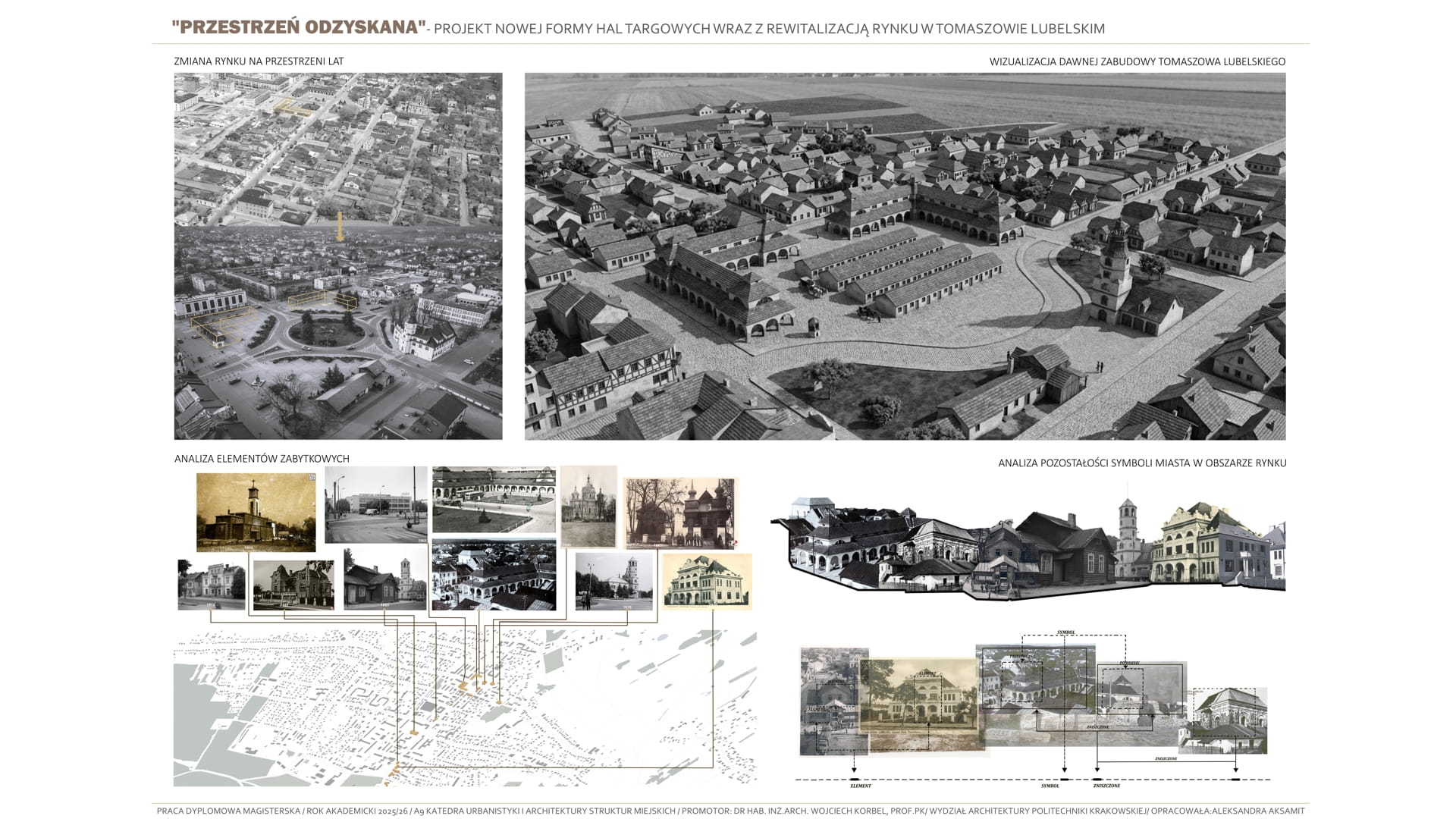 Tematem pracy jest projekt budowy nowej formy hal targowych wraz z rewitalizacją rynku w Tomaszowie Lubelskim. Projekt jest próbą przywrócenia „zabranej przestrzeni”- przestrzeni, która wraz z dawnymi halami targowymi tworzyła centralny obszar w mieście. Celem opracowania jest przywrócenie dawnej rangi i znaczenia historycznego centrum miasta, a także nadanie mu współczesnych funkcji odpowiadających aktualnym potrzebom społecznym kulturowym i usługowym mieszkańców. Koncepcja projektowa opiera się na analizie historycznego układu miasta, wywodzącego się z tradycji miast ordynackich, w których rynek i przyległe do niego obiekty, pełniły rolę głównego ośrodka życia publicznego. Projekt stanowi próbę analizy dawnej formy hal targowych, opierając się na ich lokalizacji i formie, poprzez wprowadzenie nowej funkcji kulturowo-usługowej, który integruje przestrzenie spotkań, wydarzeń kulturalnych oraz aktywności społecznych, pozwalając użytkownikom na trakty wymiany między obiektami. Zaprojektowane nowe hale targowe mają stanowić nowoczesne „forum” miejskie, łącząc w sobie otwartość przestrzenną, elastyczność użytkowania oraz dialog z istniejącą już zabudową pierzejową. Rozwiązania architektoniczne i urbanistyczne nawiązują do idei ciągłości i trwałości formy miejskiej, zakłóconej obecnie poprzez układ komunikacyjny dzielący przestrzeń rynku, jednocześnie wykorzystując nowoczesne tendencje projektowe, takie jak wielofunkcyjność, dostępność przestrzeni publicznych i integracje z zastaną siatką miejską. Projekt przywraca centralnej przestrzeni jej dawną świetność w nowoczesnej interpretacji.