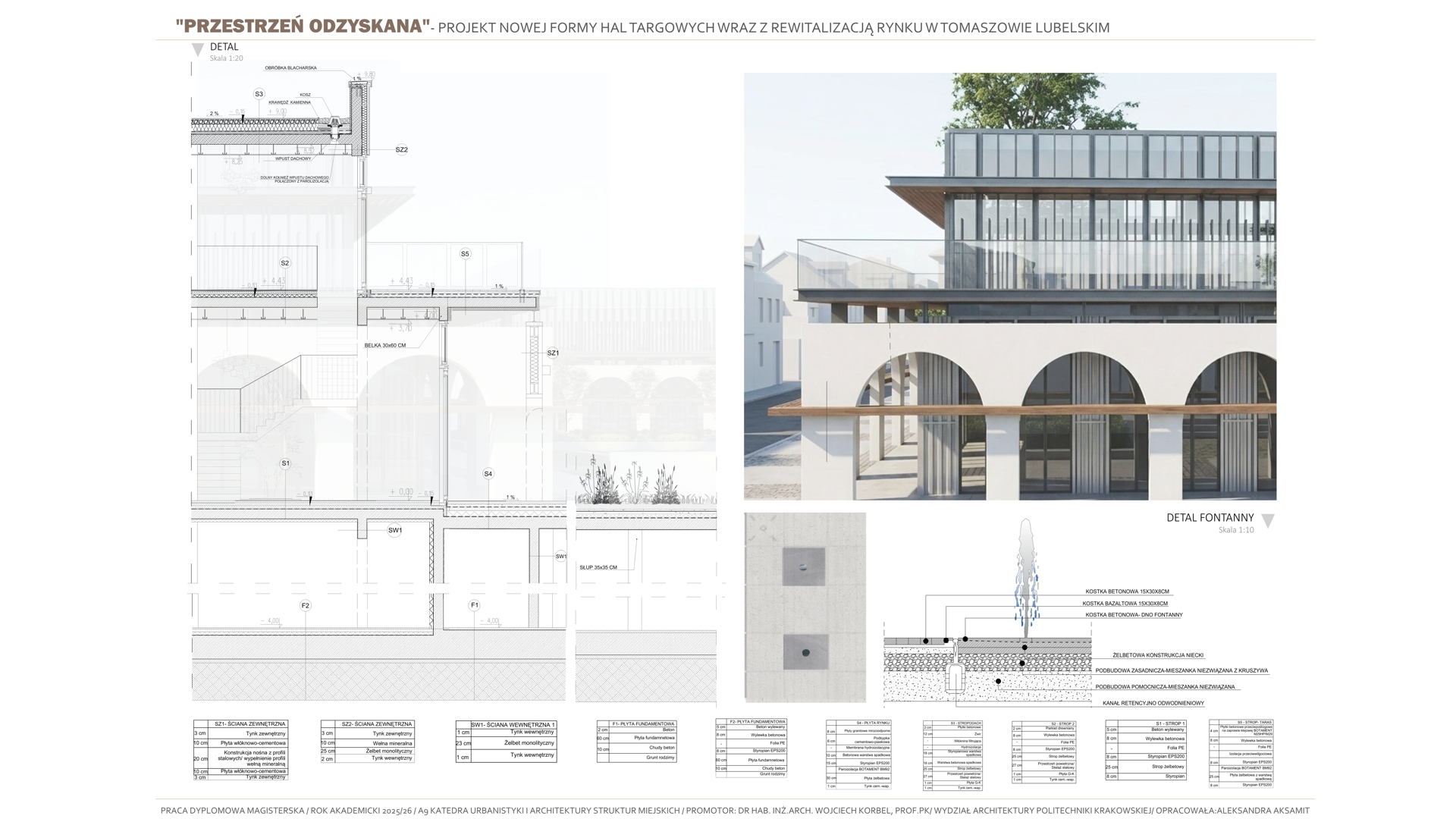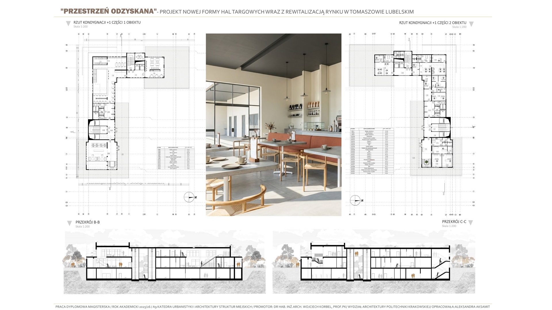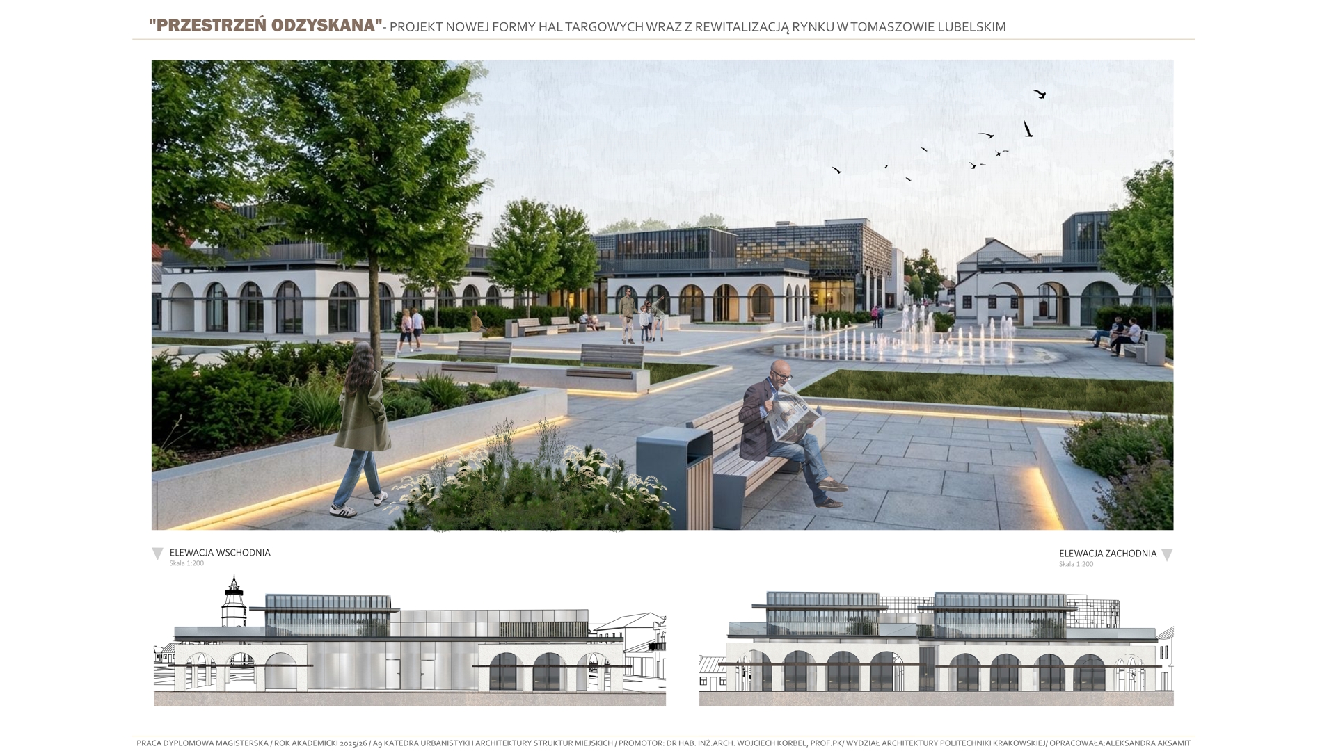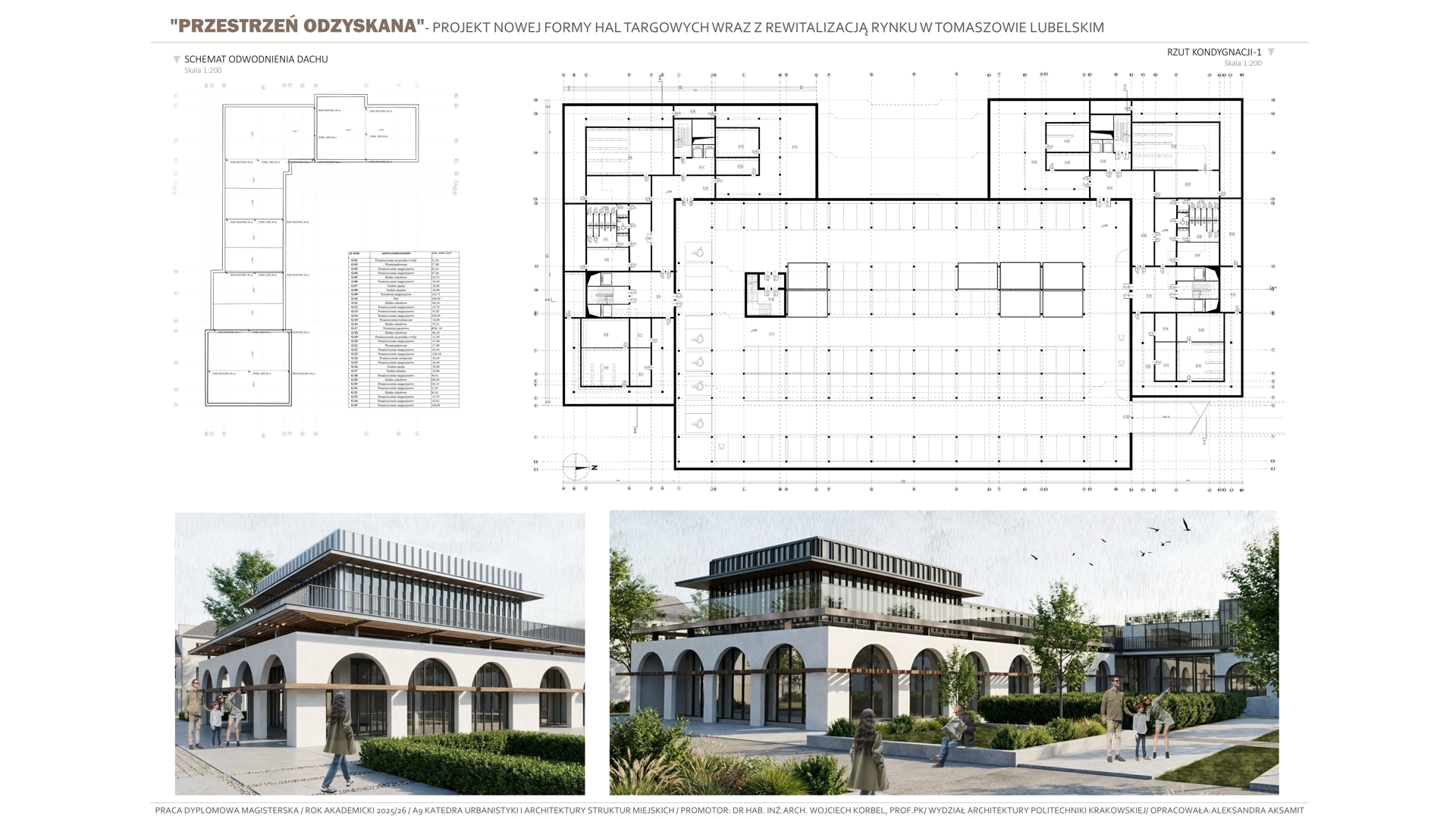Tematem pracy jest projekt budowy nowej formy hal targowych wraz z rewitalizacją rynku w Tomaszowie Lubelskim. Projekt jest próbą przywrócenia „zabranej przestrzeni”- przestrzeni, która wraz z dawnymi halami targowymi tworzyła centralny obszar w mieście. Celem opracowania jest przywrócenie dawnej rangi i znaczenia historycznego centrum miasta, a także nadanie mu współczesnych funkcji odpowiadających aktualnym potrzebom społecznym kulturowym i usługowym mieszkańców. Koncepcja projektowa opiera się na analizie historycznego układu miasta, wywodzącego się z tradycji miast ordynackich, w których rynek i przyległe do niego obiekty, pełniły rolę głównego ośrodka życia publicznego. Projekt stanowi próbę analizy dawnej formy hal targowych, opierając się na ich lokalizacji i formie, poprzez wprowadzenie nowej funkcji kulturowo-usługowej, który integruje przestrzenie spotkań, wydarzeń kulturalnych oraz aktywności społecznych, pozwalając użytkownikom na trakty wymiany między obiektami. Zaprojektowane nowe hale targowe mają stanowić nowoczesne „forum” miejskie, łącząc w sobie otwartość przestrzenną, elastyczność użytkowania oraz dialog z istniejącą już zabudową pierzejową. Rozwiązania architektoniczne i urbanistyczne nawiązują do idei ciągłości i trwałości formy miejskiej, zakłóconej obecnie poprzez układ komunikacyjny dzielący przestrzeń rynku, jednocześnie wykorzystując nowoczesne tendencje projektowe, takie jak wielofunkcyjność, dostępność przestrzeni publicznych i integracje z zastaną siatką miejską. Projekt przywraca centralnej przestrzeni jej dawną świetność w nowoczesnej interpretacji.