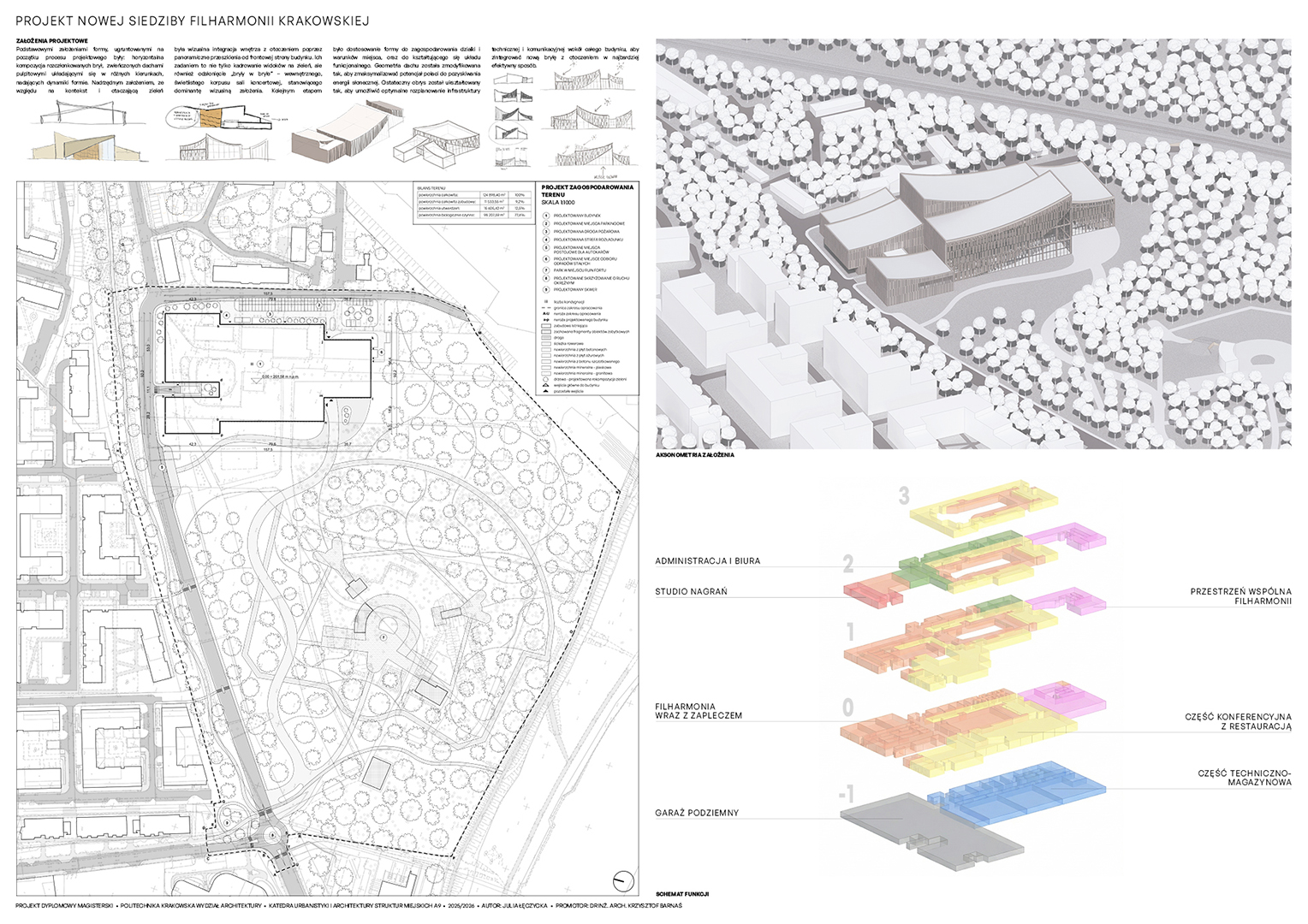 Projekt nowej siedziby Filharmonii Krakowskiej zlokalizowano przy ul. Skrzatów. Wybór ten podyktowany jest korzystnymi uwarunkowaniami akustycznymi oraz potencjałem miastotwórczym, pozwalającym na rewitalizację zabytkowych ruin fortu Twierdzy Kraków. Wykorzystanie zieleni wysokiej jako naturalnej bariery dźwiękowej umożliwiło stworzenie spójnej przestrzeni publicznej.