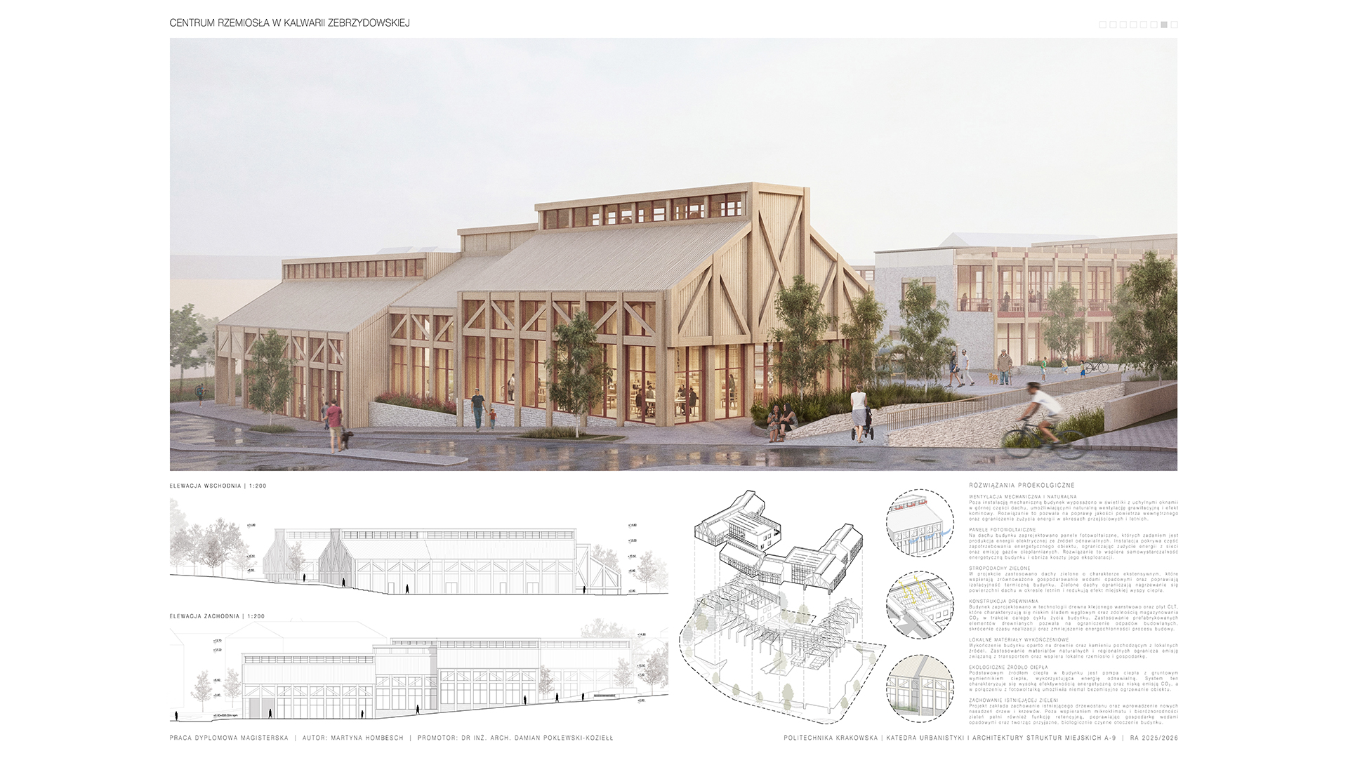 Projekt opiera się na zasadach zrównoważonego rozwoju. Dominującym materiałem konstrukcyjnym i wykończeniowym jest pozyskiwane lokalnie drewno, uzupełnione akcentami kamiennymi. Bryła budynku nawiązuje do form dachów zabytkowej zabudowy przyklasztornej, a jej rozczłonkowana forma wpisuje się w ukształtowanie terenu oraz zróżnicowaną zabudowę sąsiedztwa. Dodatkowo, taras na ostatniej kondygnacji umożliwia podziwianie krajobrazu z otwarciem widokowym na – istotne dla tożsamości miasta – wzgórze klasztorne Sanktuarium Pasyjno-Maryjnego.
