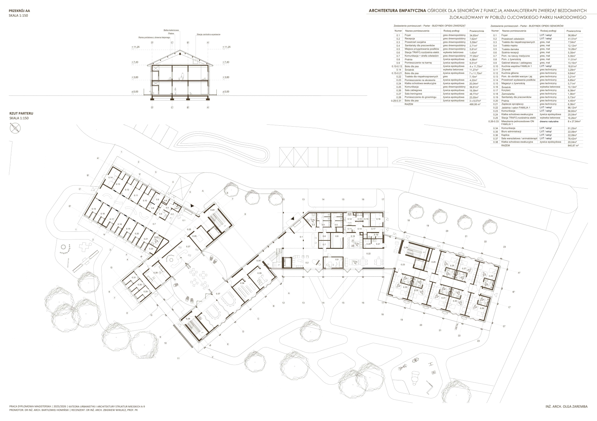 w Ojcowie. Obiekt integruje dwie funkcje opieki, przy jednoczesnej ich funkcjonalnej separacji. Układ wewnętrzny oparto na podziale na mniejsze wspólnoty mieszkaniowe „familie” oraz gradiencie prywatności, od stref publicznych dla gości, po prywatne pokoje seniorów. Część dla zwierząt została zaprojektowana zgodnie z zasadami dobrostanu,