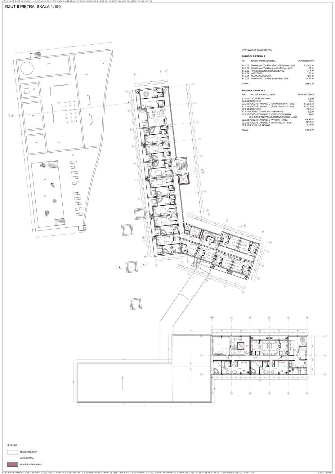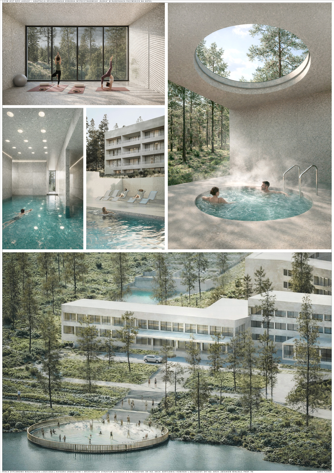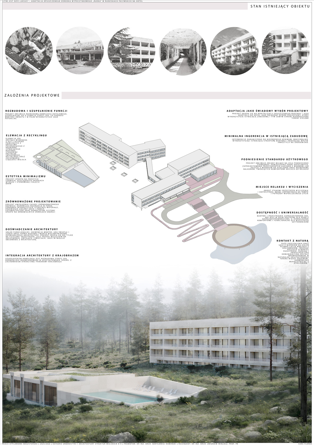 Praca dyplomowa dotyczy adaptacji opuszczonych budynków dawnego ośrodka wypoczynkowego „Rudka” w Rudziskach Pasymskich oraz uzupełnienia zespołu o nowy budynek spa jako brakującą funkcję wypoczynkową. Kompleks zlokalizowany jest w spokojnym otoczeniu lasów, w bezpośrednim sąsiedztwie Jeziora Kalwa, co nadaje mu szczególny potencjał jako miejsca relaksu i regeneracji.