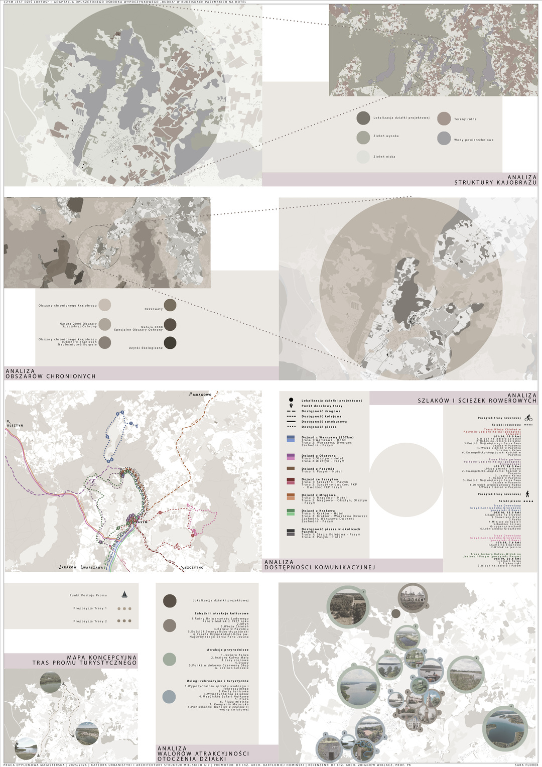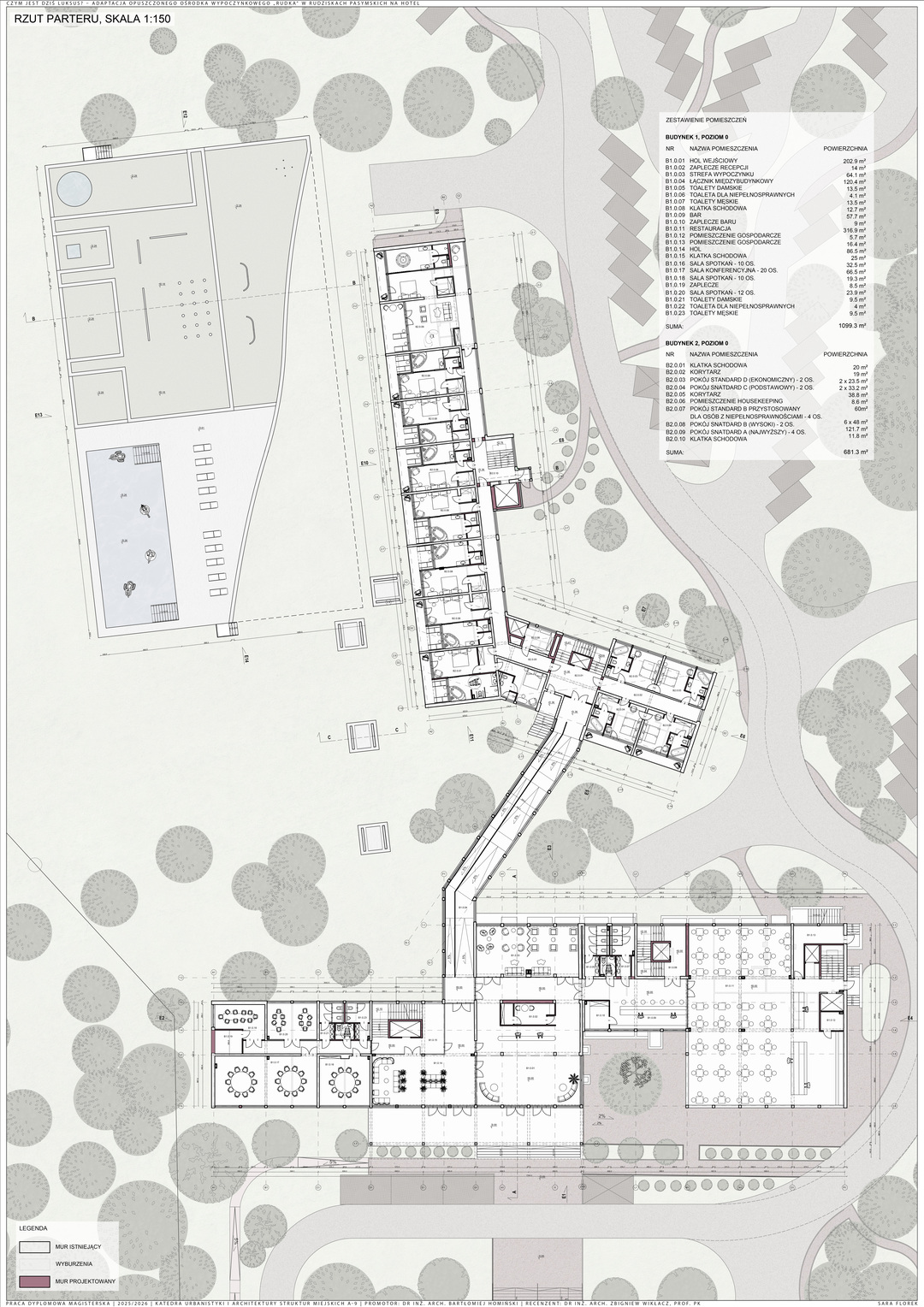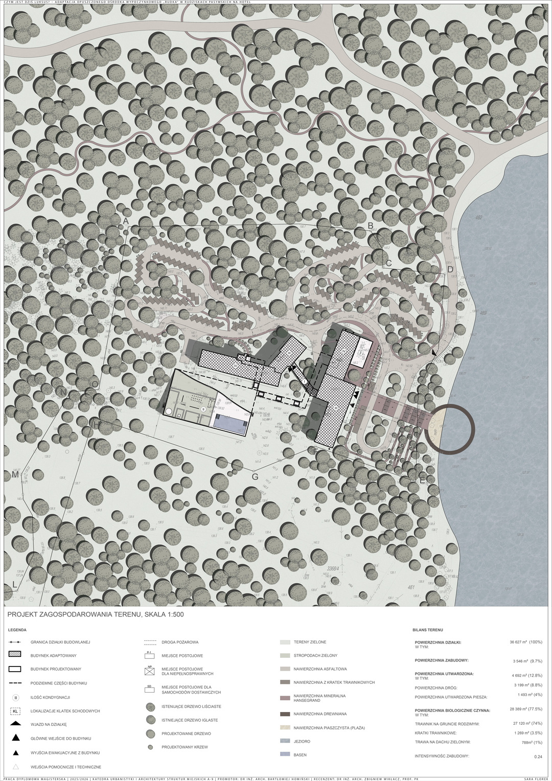 Praca dyplomowa dotyczy adaptacji opuszczonych budynków dawnego ośrodka wypoczynkowego „Rudka” w Rudziskach Pasymskich oraz uzupełnienia zespołu o nowy budynek spa jako brakującą funkcję wypoczynkową. Kompleks zlokalizowany jest w spokojnym otoczeniu lasów, w bezpośrednim sąsiedztwie Jeziora Kalwa, co nadaje mu szczególny potencjał jako miejsca relaksu i regeneracji.