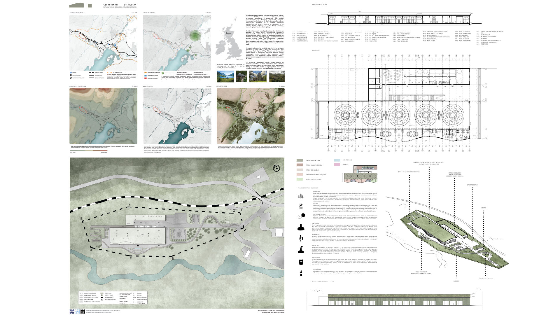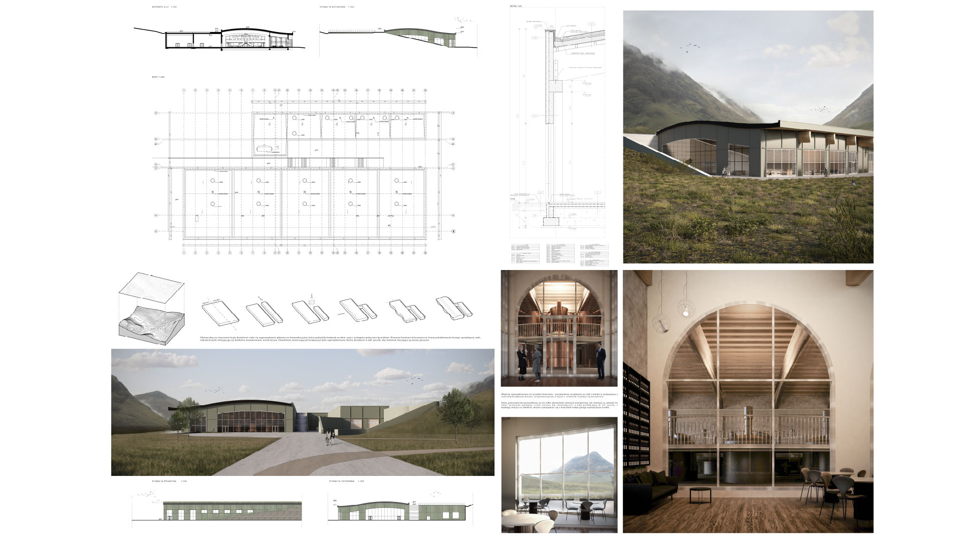 Projekt destylarni whisky wraz z centrum dla zwiedzających, zlokalizowany w malowniczej dolinie szkockich gór, swoją formą ma nawiązywać do natury i współgrać z otaczającym ją krajobrazem. Obiekt ma za zadanie kultywowanie szkockiej tradycji produkcji whisky, wykorzystując lokalne składniki. Projektowany budynek jest nie tylko miejscem pracy i produkcji trunku, ale również strefą spotkań, edukacji i relaksu. Dzięki harmonijnej integracji z naturą oraz lokalną społecznością, celem projektu jest stworzenie wyjątkowego doświadczenia, które pozwoli odwiedzającym odkryć piękno szkockiego krajobrazu oraz urok tradycyjnej sztuki wytwarzania whisky. Aby jak najlepiej wpisać obiekt w dziewiczy teren opracowania i zachęcić jego użytkowników do refleksji nad miejscem, wykorzystano naturalne materiały, takie jak drewno, kamień, a obiekt zwieńczono zielonym dachem o organicznym kształcie, odzwierciedlającym delikatne zbocza gór. Zaprojektowane duże, panoramiczne przeszklenia pozwalają na podziwianie widoków na góry oraz pobliski potok.