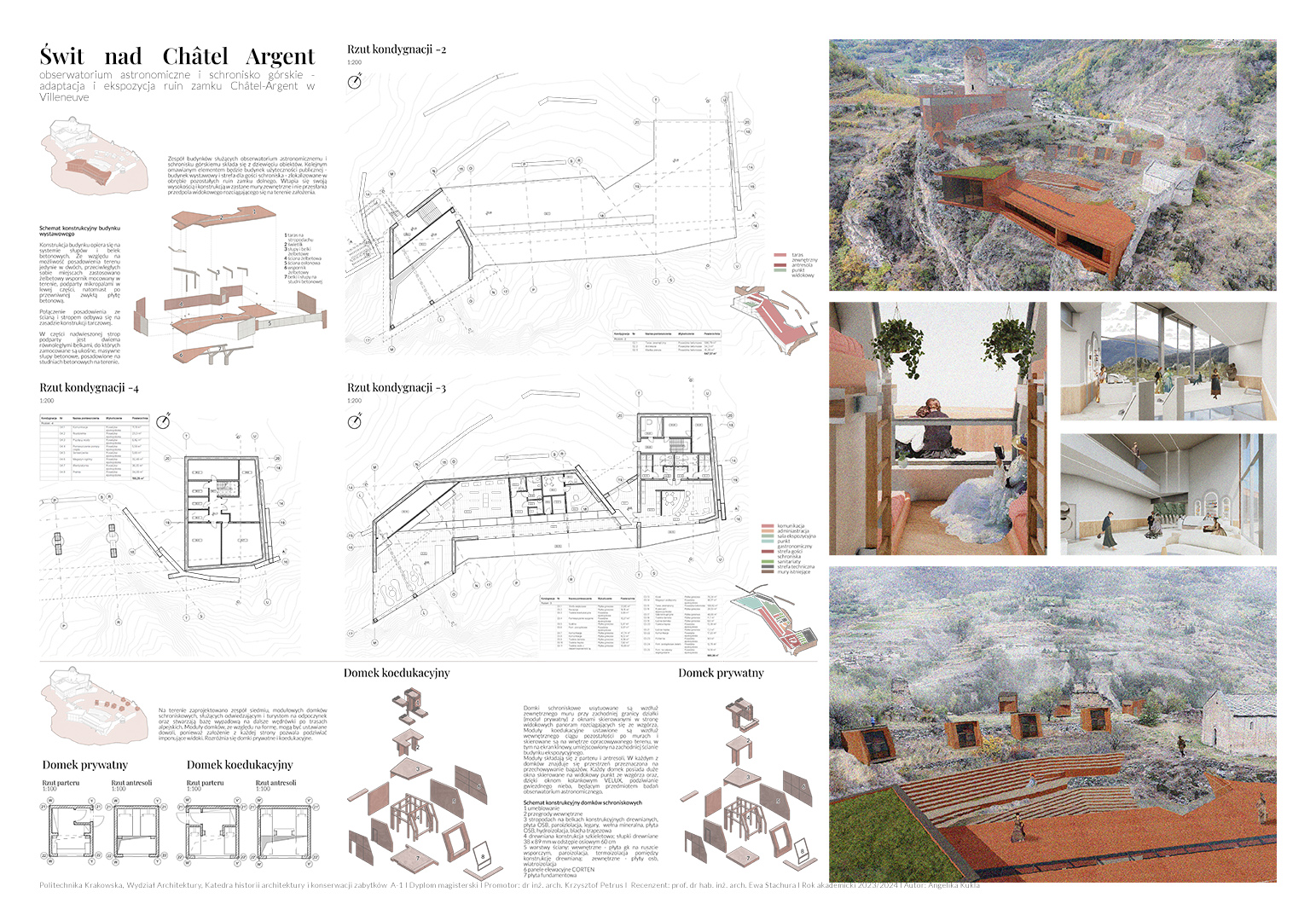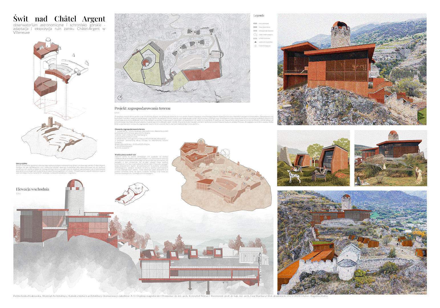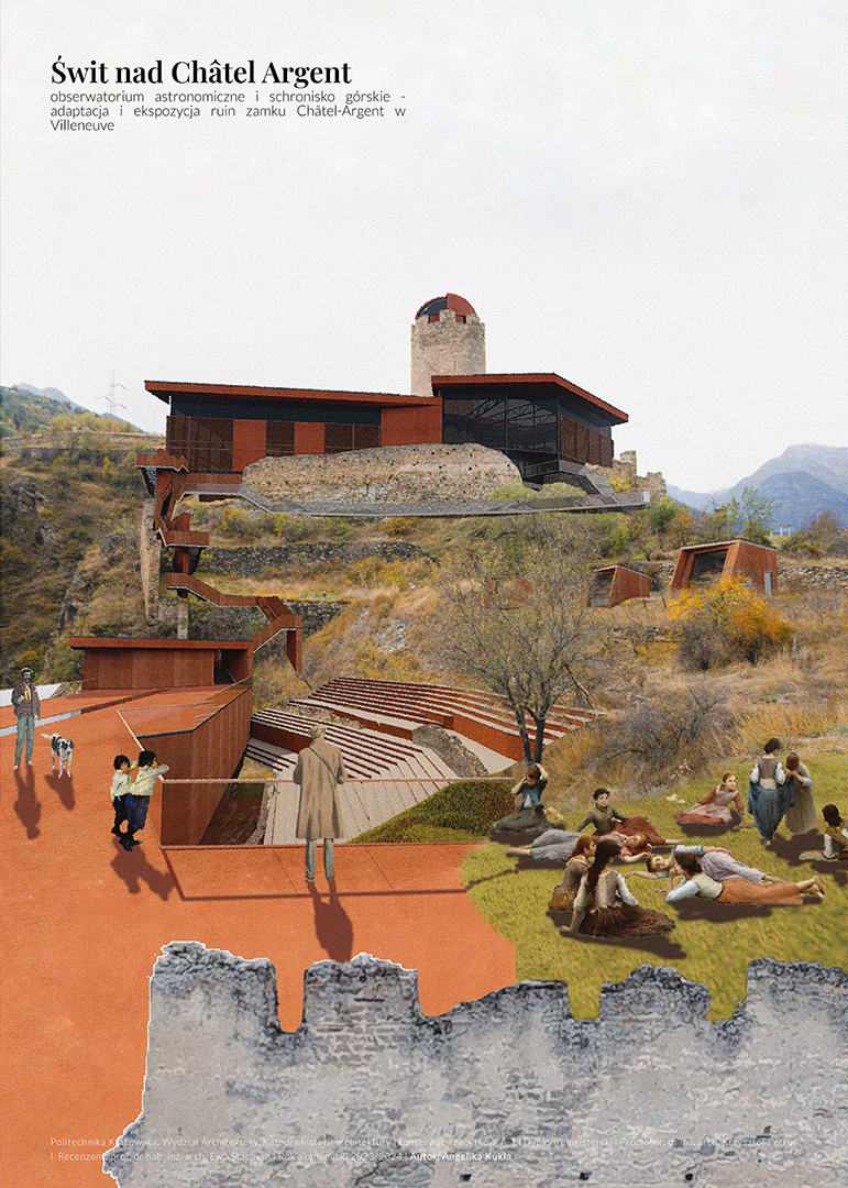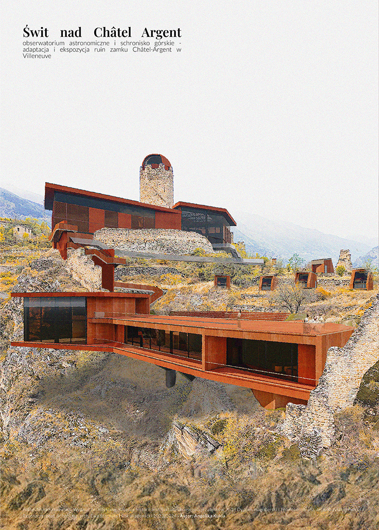 Tematem pracy dyplomowej jest rewaloryzacja ruin średniowiecznego zamku Chatel-Argent, ekspozycja jego historycznej tkanki oraz adaptacja na nową funkcję, jaką będzie stanowiło schronisko górskie oraz obserwatorium astronomiczne. Zakłada się, tym samym, przywrócenie strukturze dawnej funkcji społecznej, gromadzącej ludzi w celach schronienia, a dodatkowo zapewniające rozwój kulturalny czy naukowy. Badania nad strukturą, historią budynku doprowadziły do wyklarowania się idei do stworzenia kompleksu dwóch budynków, jako zaplecza kulturalnego, gastronomicznego i technicznego oraz modularnego zespołu siedmiu koedukacyjnych i prywatnych budynków noclegowych dla turystów. Umożliwiono również obejście dookoła założenia za pomocą kładki pieszej, ciągnącej się wzdłuż murów oraz łączącej dwa ogólnodostępne budynki. Zachowując historię przetrwałych fragmentów zamku, starano się umożliwić obecnym i przyszłym pokoleniom obcowanie z tym miejscem.