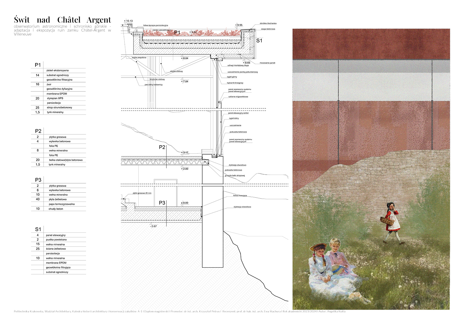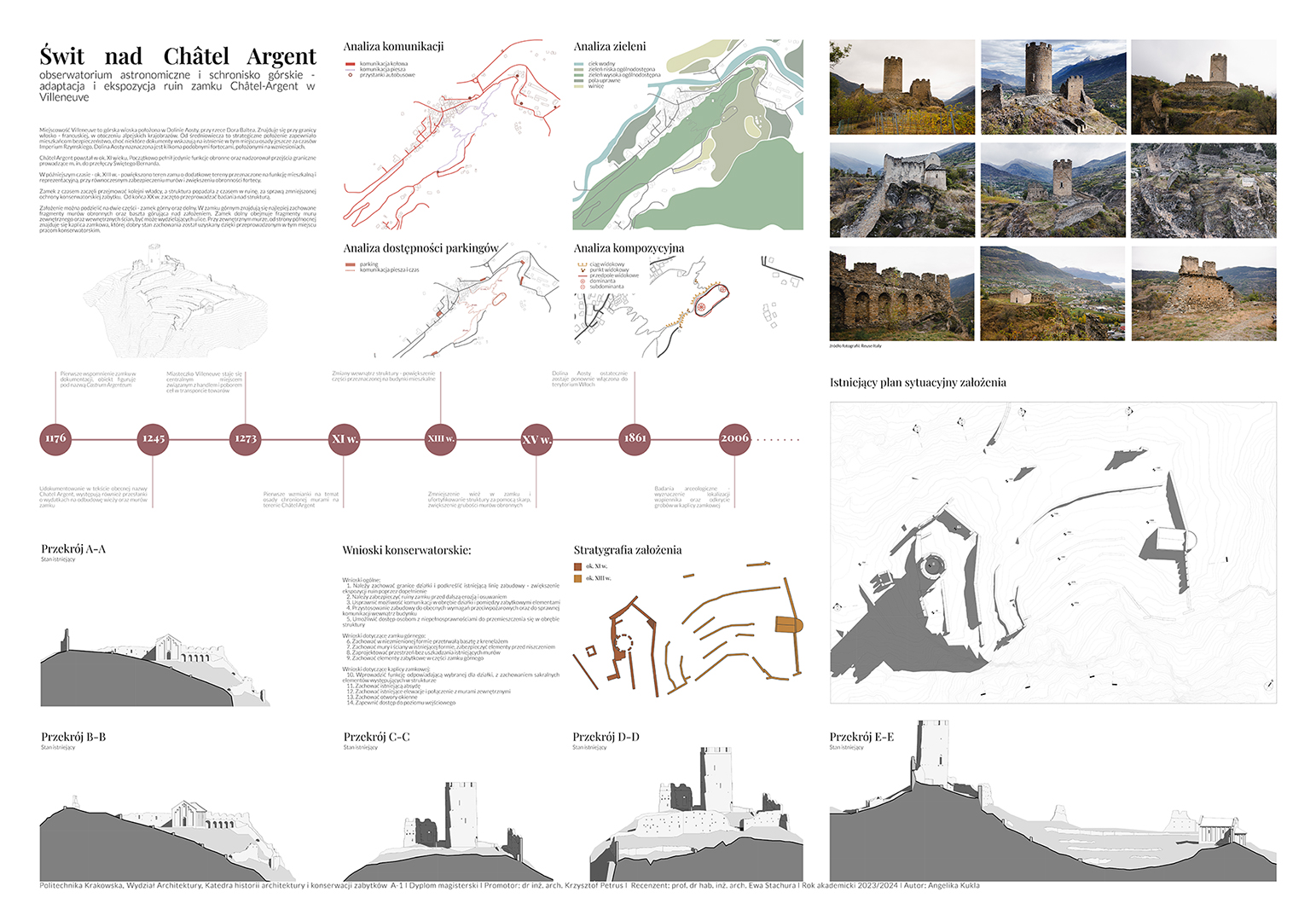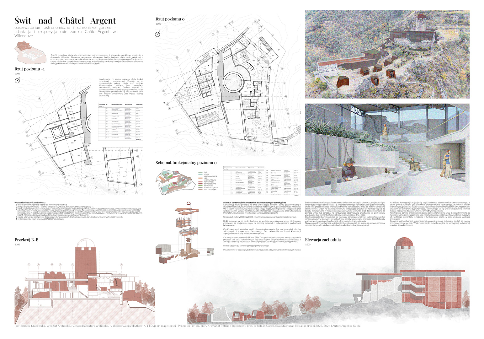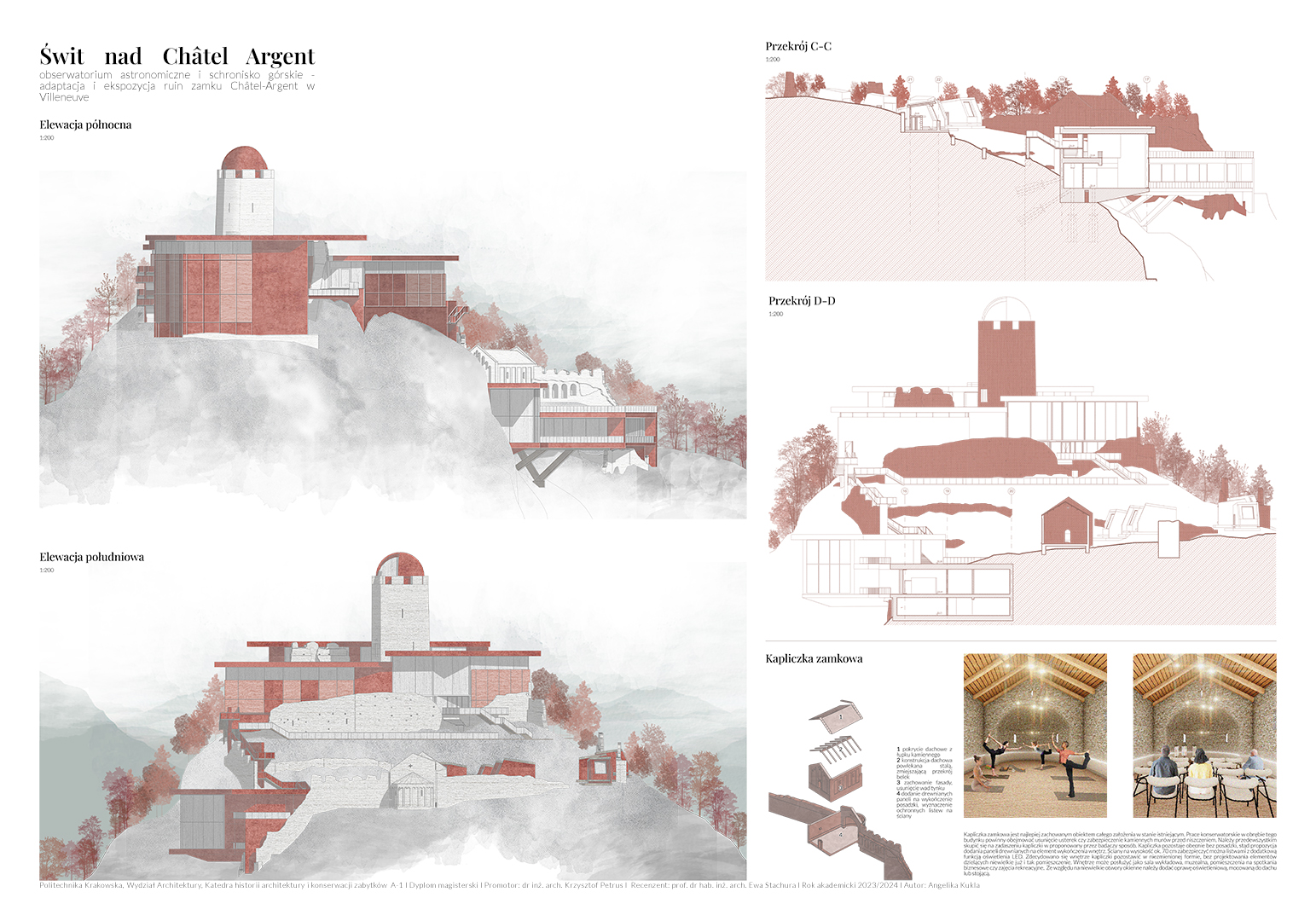 Tematem pracy dyplomowej jest rewaloryzacja ruin średniowiecznego zamku Chatel-Argent, ekspozycja jego historycznej tkanki oraz adaptacja na nową funkcję, jaką będzie stanowiło schronisko górskie oraz obserwatorium astronomiczne. Zakłada się, tym samym, przywrócenie strukturze dawnej funkcji społecznej, gromadzącej ludzi w celach schronienia, a dodatkowo zapewniające rozwój kulturalny czy naukowy. Badania nad strukturą, historią budynku doprowadziły do wyklarowania się idei do stworzenia kompleksu dwóch budynków, jako zaplecza kulturalnego, gastronomicznego i technicznego oraz modularnego zespołu siedmiu koedukacyjnych i prywatnych budynków noclegowych dla turystów. Umożliwiono również obejście dookoła założenia za pomocą kładki pieszej, ciągnącej się wzdłuż murów oraz łączącej dwa ogólnodostępne budynki. Zachowując historię przetrwałych fragmentów zamku, starano się umożliwić obecnym i przyszłym pokoleniom obcowanie z tym miejscem.