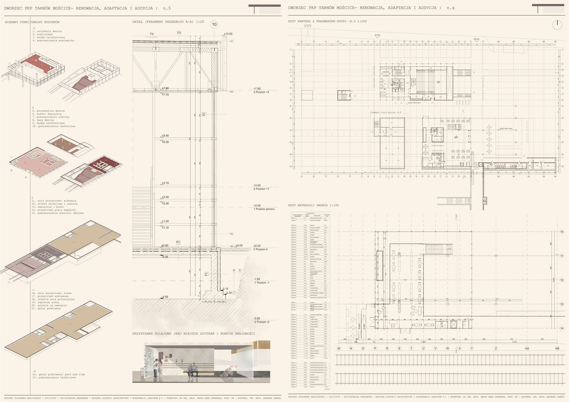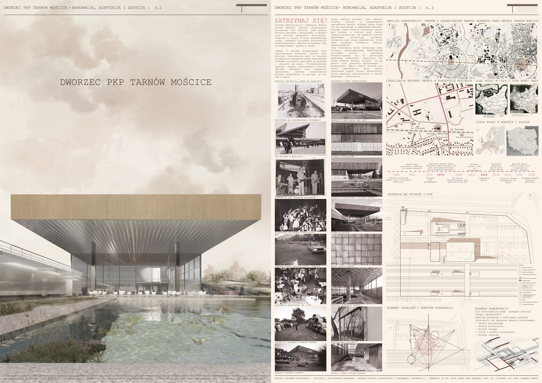 Projekt rewitalizacji i adaptacji dworca Tarnów Mościce zakłada rozszerzenie pierwotnej roli miejsca, jako punktu miejsca odjazdów i przyjazdów, w dynamiczne centrum społeczno-kulturalne. Powstały w latach 70-tych poprzedniego wieku, znakomity przykład architektury modernistycznej, obecnie nieużywany oraz nieremontowany, popada w ruinę. Jednym z założeń projektowych jest wykorzystanie kontrastu funkcji i miejsca. Historycznie było to miejsce użytkowane przez pracowników zakładów azotowych jako punkt przyjazdów i odjazdów do pracy. Przekształcając dworzec z punktu tranzytowego w miejsce spotkań, rekreacji oraz integracji społecznej, zakłada transformację miejsca oczekiwania na pociąg, na cel sam w sobie. Drugą częścią projektu jest addycja obiektu kultury w bezpośrednim sąsiedztwie dworca. Budynek swoją formą nie ma konkurować z zabytkowym dworcem, dlatego część funkcji pozostaje ukryta pod ziemią, a zielony dach tworzy otwartą przestrzeń. Ma zapewnić miejsce dedykowane warsztatom, wystawom, koncertom oraz innym wydarzeniom, które będą sprzyjać budowaniu relacji międzyludzkich. Idea utworzenia mniej formalnego domu kultury, odpowiadającego współczesnym potrzebom wynika z założenia koncentrującego się na społecznym problemie samotności. Według badania „Poczucie samotności wśród dorosłych Polaków” przeprowadzonego przez Instytut Pokolenia, dotyka 54% społeczeństwa. Wymaga to rozważenia, jak przestrzeń wpływa na nasze społeczne interakcje. Projekt przewiduje poszukiwanie osobistych perspektyw, które kształtują nasze doświadczenia w przestrzeni publicznej. Proponowane rozwiązania wykraczają poza granice budynku dworca, rozszerzając koncept. Jednym z założeń jest utworzenie punktów połączeń, które tworzą sieć interakcji społecznych, wykorzystując oczekiwanie na pociąg jako okazję do nawiązania kontaktów. Inspirując się formą budynku dworca, miejsce to ma pełnić rolę „parasola społecznego” – przestrzeni, gdzie ludzie chronią się przed samotnością, mają okazję nawiązania nowych relacji społecznych, które powstają spontanicznie w wyniku wspólnego oczekiwania.