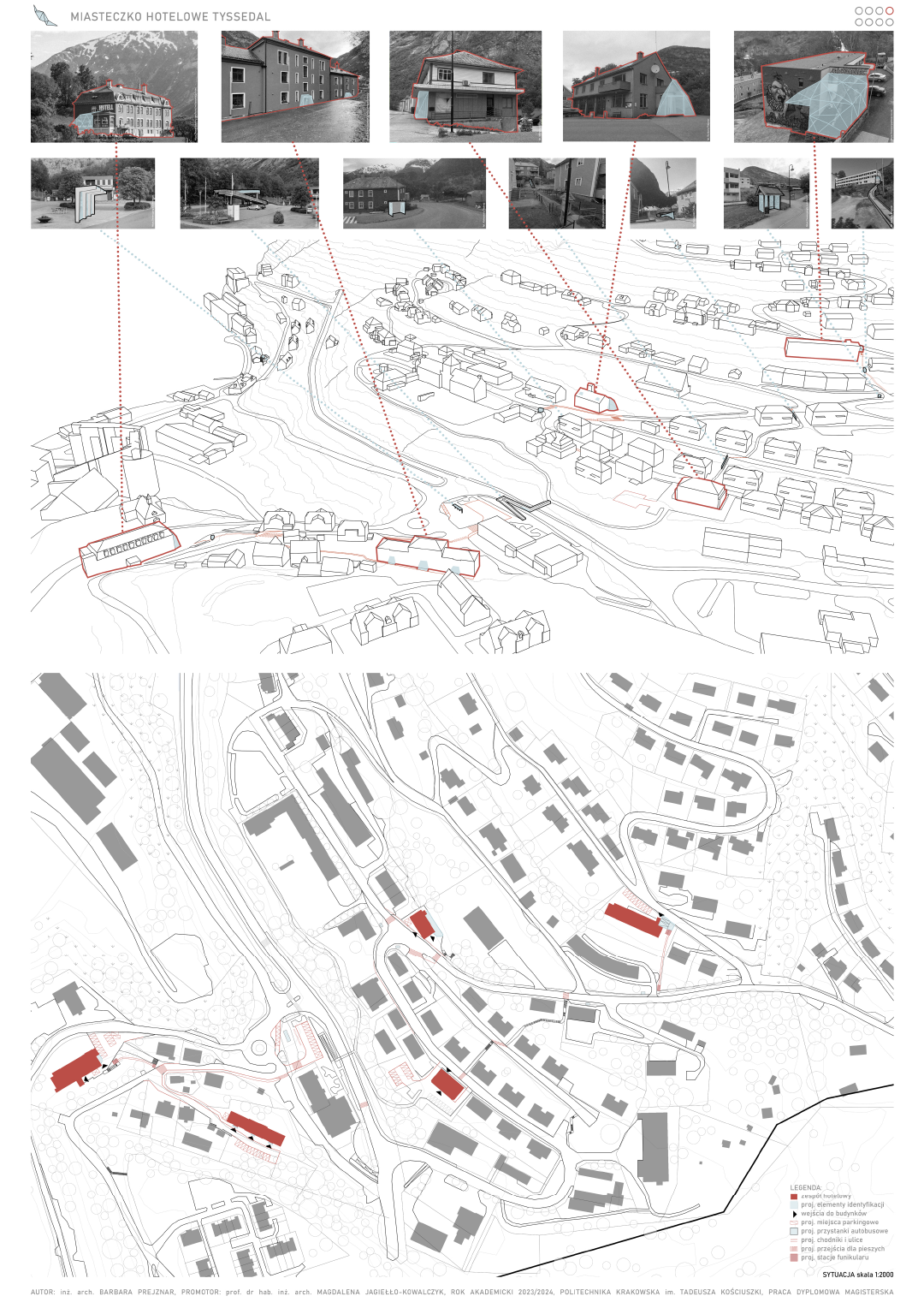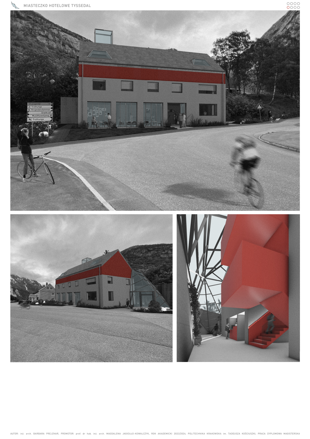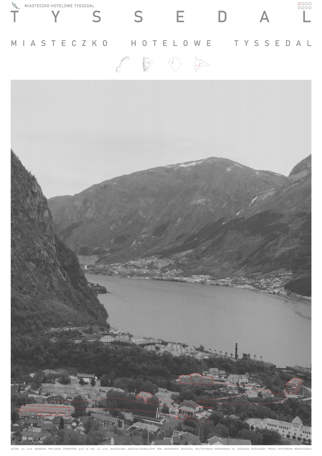 Projekt prezentuje propozycję identyfikacji wizualnej zespołu hotelowego, znajdującego się na działkach rozrzuconych po miejscowości Tyssedal w Norwegii, w gminie Ullensvang. Ze względu na rosnącą popularność szlaku turystycznego w okolicy, zapotrzebowanie na bazę noclegową rośnie, dlatego też na funkcję hotelową adaptowane są budynki o różnej historii, formie i stylu. Połączenie ich nie zawiera się jedynie w warstwie wizualnej, szczegółowo przeanalizowana i przeprojektowana została sieć połączeń pieszych oraz wpływ poszczególnych obiektów na kompozycję miejscowości. Zwrócono uwagę na dostępność budynków dla osób z ograniczonymi możliwościami poruszania się.