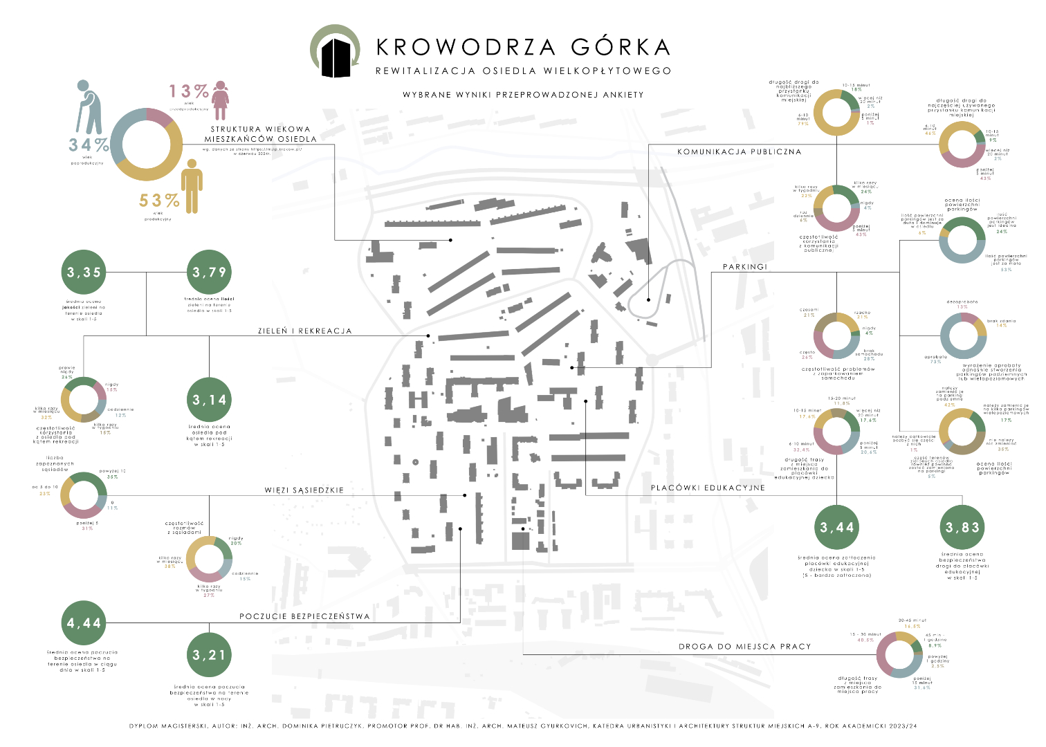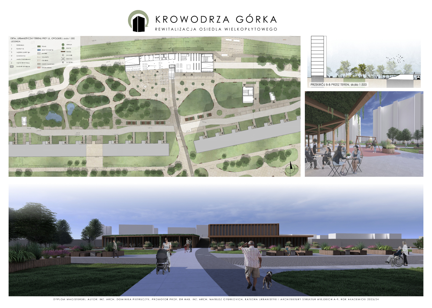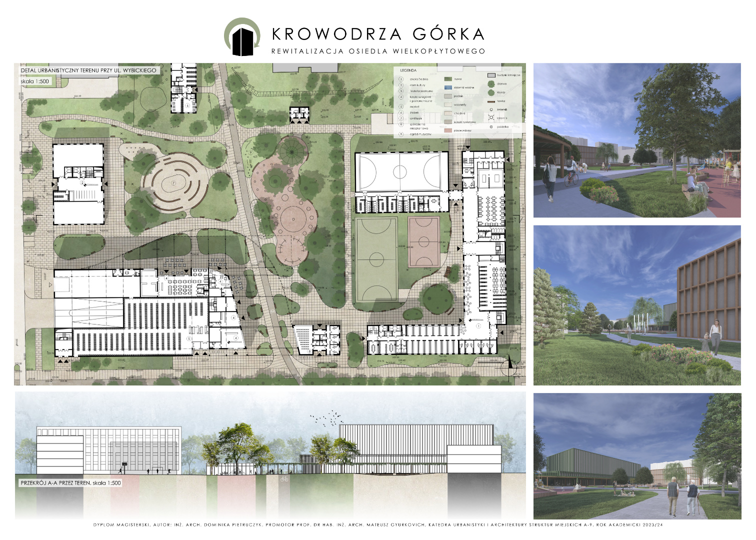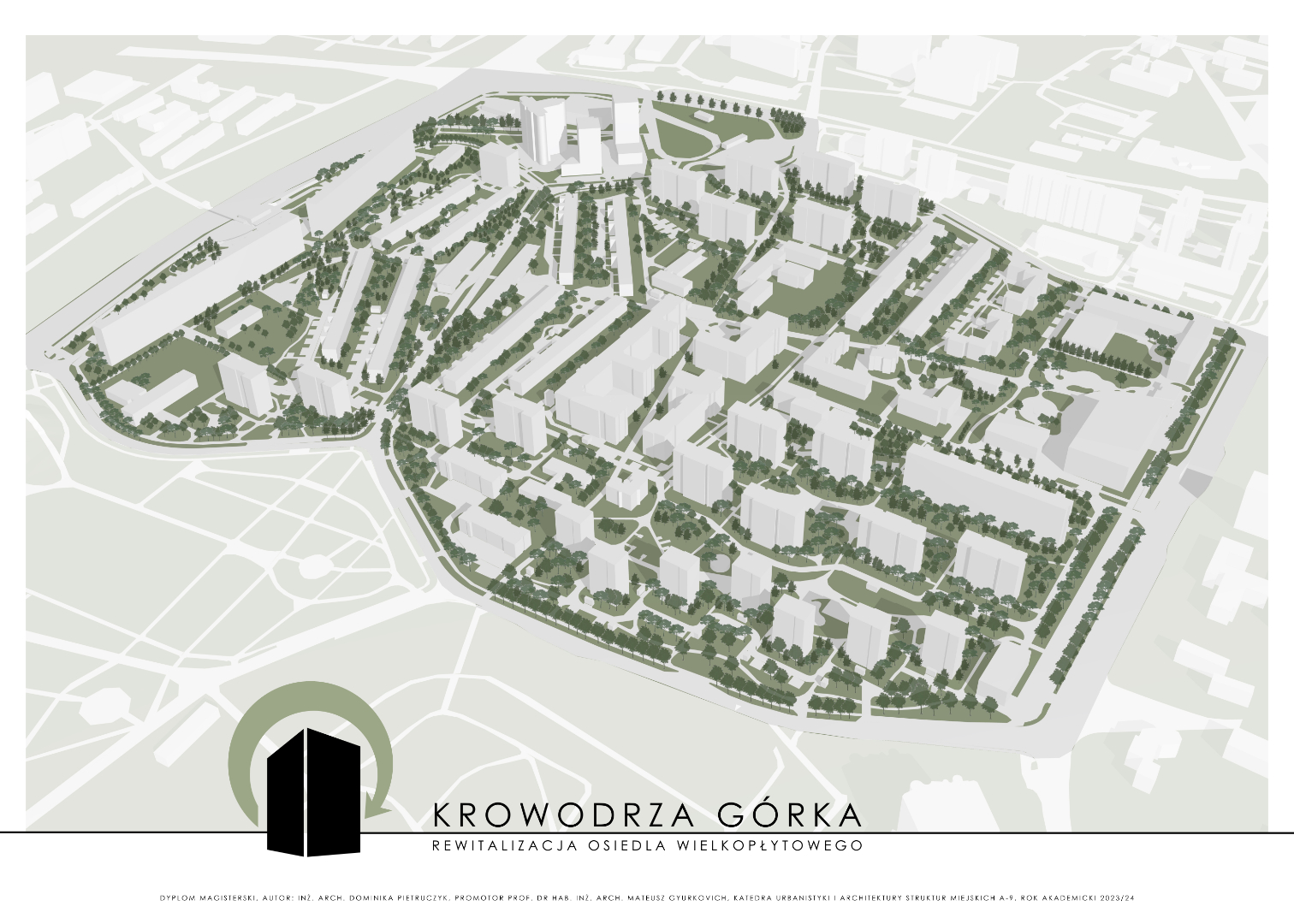 Projekt pochyla się nad problematyką dotyczącą osiedli wielkopłytowych w Polsce. W założeniu urbanistycznym analizy oraz przeprowadzona wśród mieszkańców ankieta wykazała wiele nieprawidłowości w działaniu tej struktury. W projekcie podjęto się więc rozwiązania problemu przytłaczającej liczby miejsc postojowych poprzez zaprojektowanie dwóch dużych parkingów wielopoziomowych, oraz zmniejszenie ich liczby w obrębie osiedla. Pozwoliło to na stworzenie o wiele przyjaźniejszej przestrzeni dla pieszych. Analizy wykazały także zbyt małą ilość usług w obrębie osiedla. Problem ten mają za zadanie rozwiązać lokale usługowe stworzone wzdłuż głównej osi założenia. Rozbudowane zostały także szkoła i przedszkole, a także zaprojektowano nowy żłobek i szkołę średnią w odpowiedzi na skargi mieszkańców dotyczący zbyt małej liczby miejsc w placówkach oświatowych. Wskazywany przez ankietowanych problem braku wind, lub lokalizacji ich na podwyższonym parterze, co sprawia kłopoty osobom z niepełnosprawnościami oraz trudnościami w poruszaniu się, został rozwiązany poprzez powiększenie stref wejściowych lub dobudowanie zewnętrznych pionów komunikacyjnych. Główna oś kompozycyjna została podkreślona poprzez zakończenie jej na dwóch końcach ważnymi dla lokalnej społeczności przestrzeniami publicznymi. Na terenie osiedla przy projekcie rewitalizacji nie zaplanowano wyburzeń budynków mieszkalnych wielorodzinnych. Likwidacji podlegają jedynie budynki mieszkalne jednorodzinne. Na terenie całego założenia zwrócono szczególną uwagę na kreowanie przestrzeni sąsiedzkich mających zacieśniać więzy pomiędzy mieszkańcami, oraz stworzono widoczne z każdego bloku place zabaw dla dzieci.