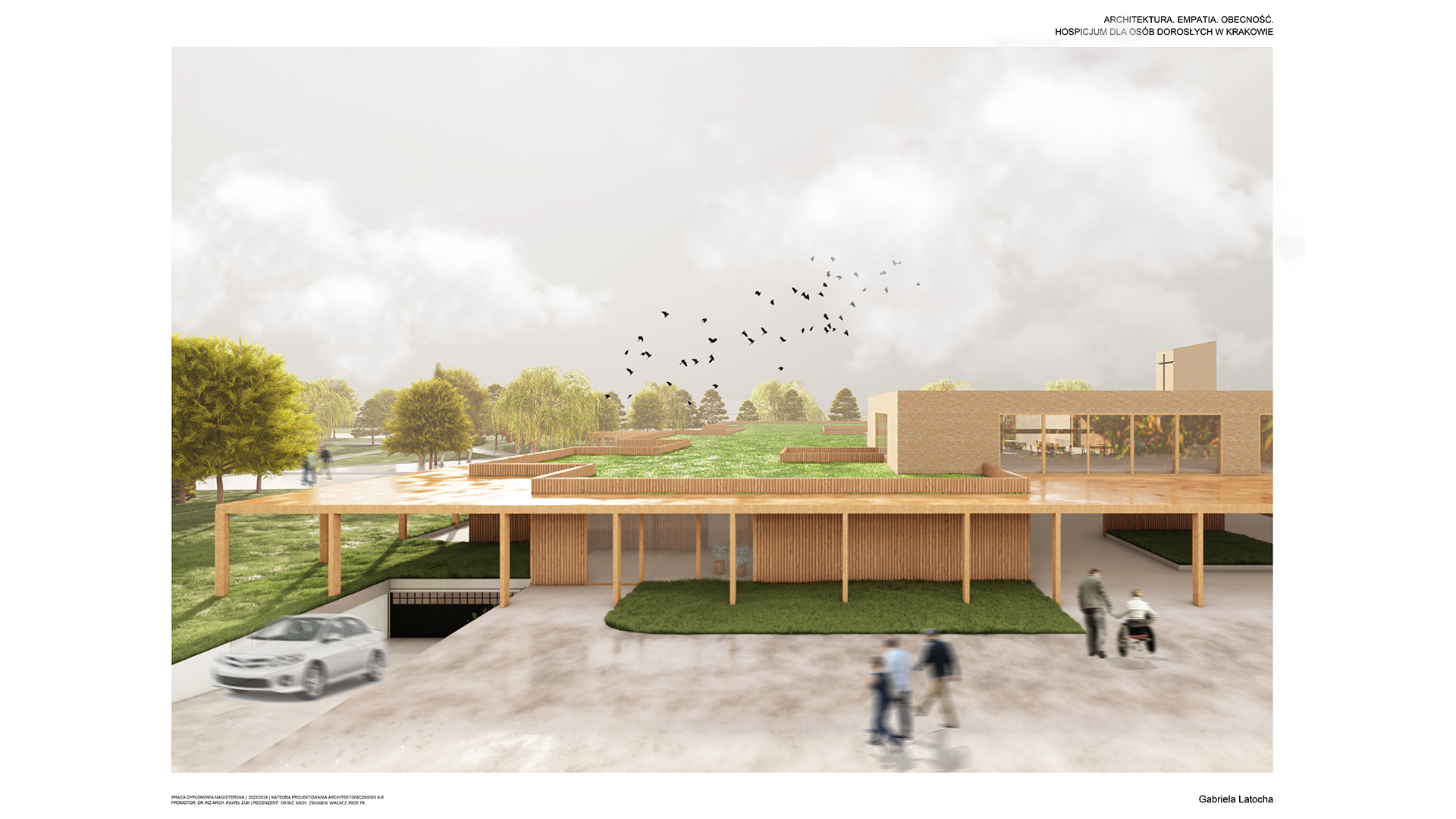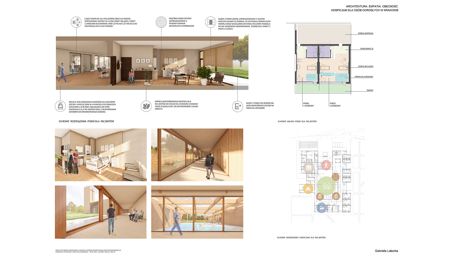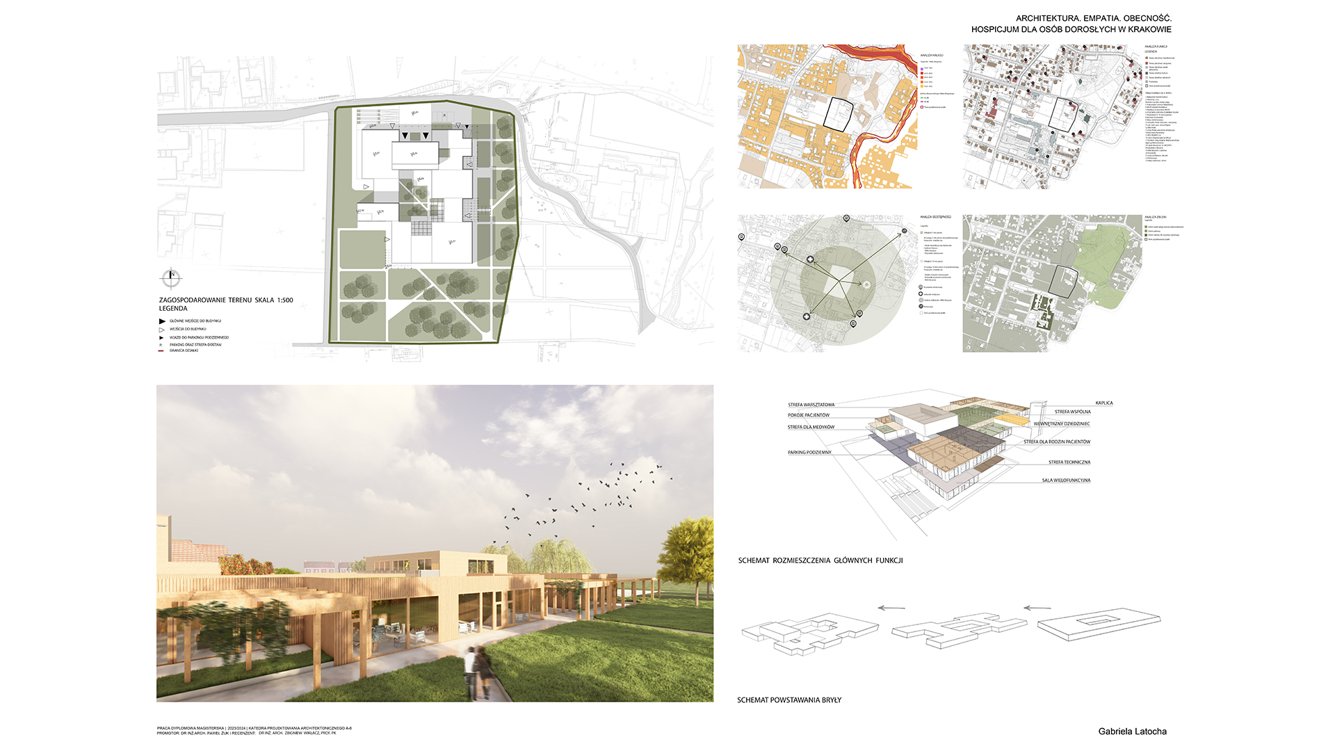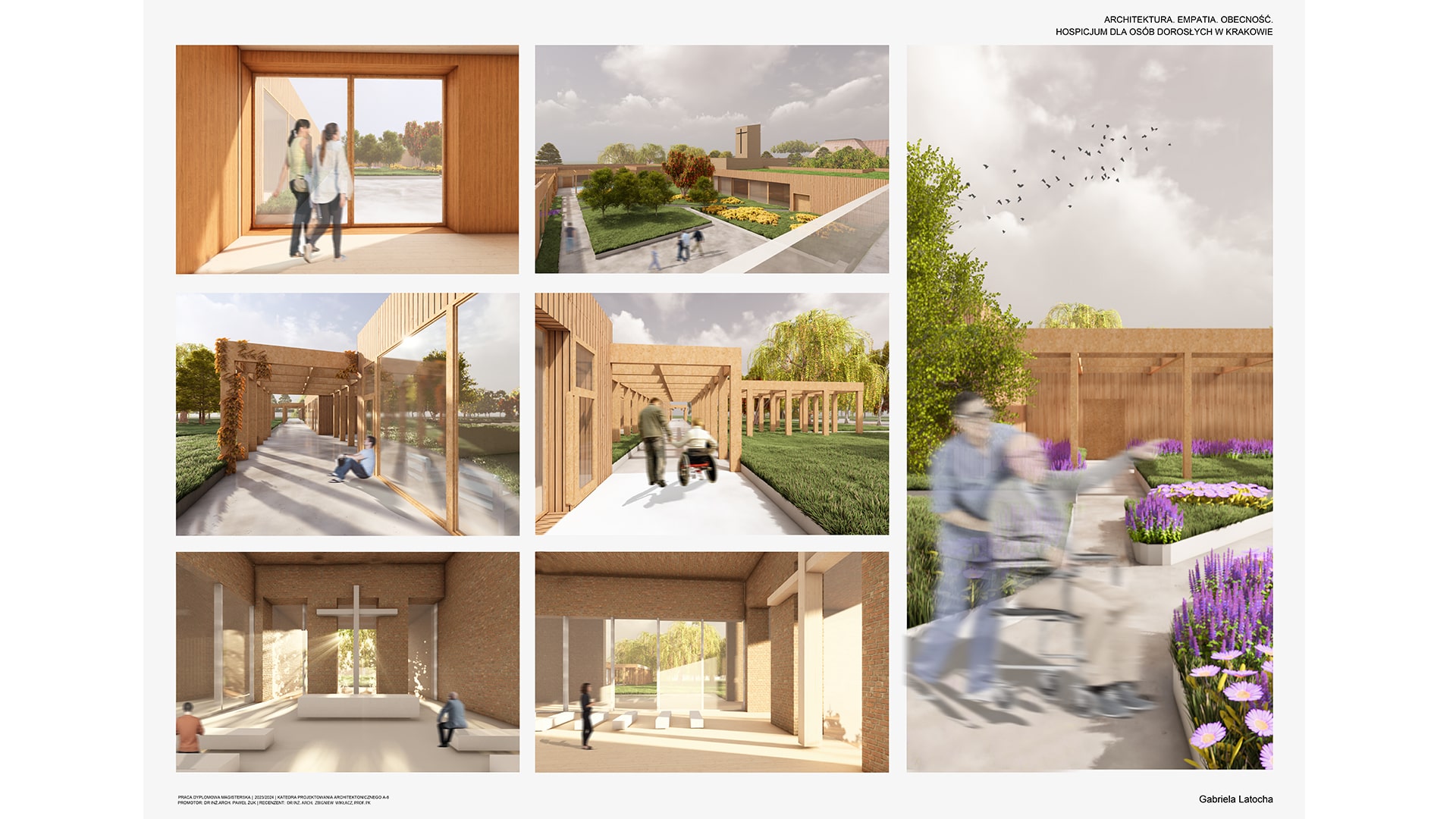 Tematem pracy magisterskiej jest projekt Hospicjum dla osób dorosłych w Krakowie. Obserwując obecną sytuację społeczną, w której wiele osób dotyka choroba nowotworowa, celem projektu stało się stworzenie wyjątkowej przestrzeni dla pacjentów hospicjum. Często kojarzone z ponurym szpitalem, hospicja budzą lęk i wyrzuty sumienia u rodzin, które umieszczają tam swoich najbliższych. Projekt ten ma na celu całkowite odwrócenie tego wizerunku, oferując pacjentom miejsce, które będzie dawało im bezpieczeństwo oraz spokój. W obiekcie zaplanowano liczne przestrzenie zielone, sprzyjające aktywnościom dostosowanym do możliwości chorych. Wnętrza zostały zaprojektowane w sposób nawiązujący do domowego klimatu, które mają tworzyć atmosferę wspólnoty. W projekcie wykorzystano naturalne materiały takie jak cegła oraz drewno. Bezpośredni dostęp do tarasów i ogrodu umożliwia pacjentom ciągły kontakt z naturą, niezależnie od ich stanu kontakt z naturą. Projekt ten stawia na potrzeby pacjentów, dbając także o komfort ich rodzin w tym trudnym dla nich czasie.