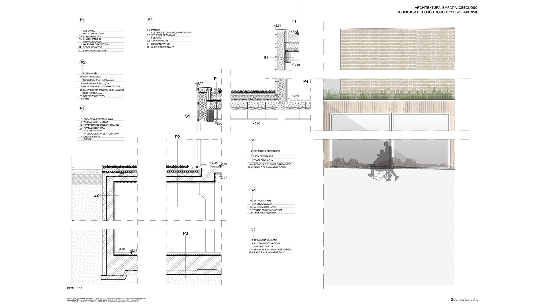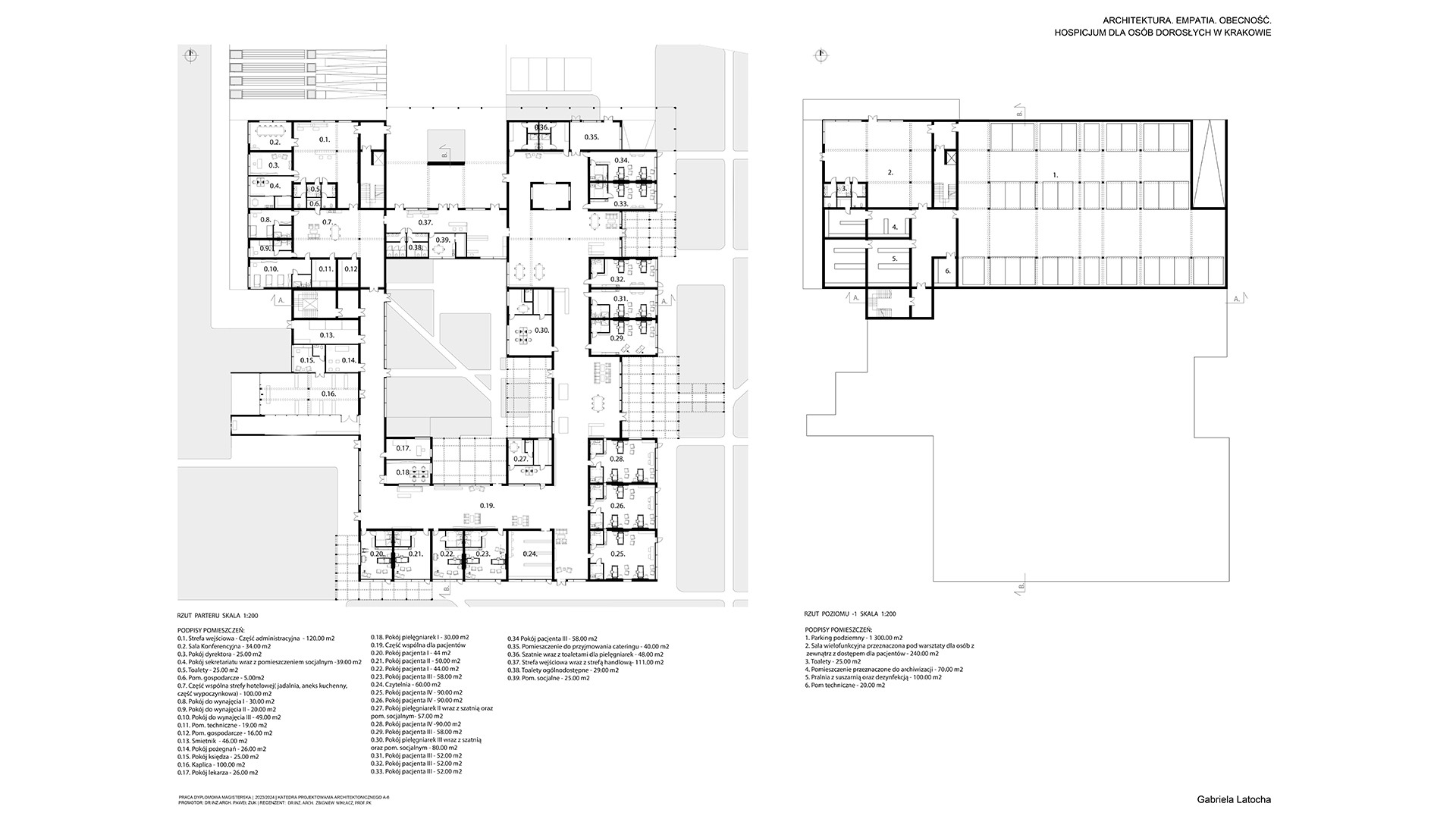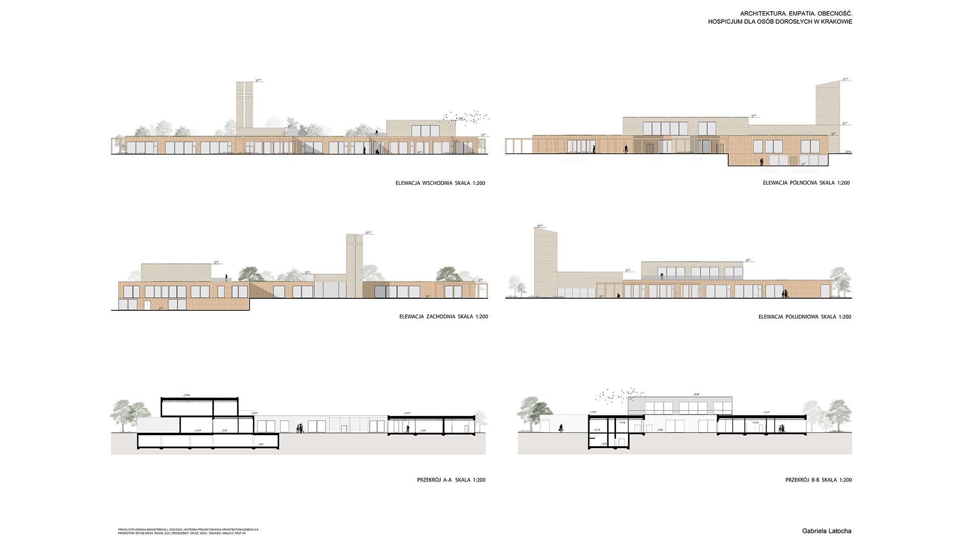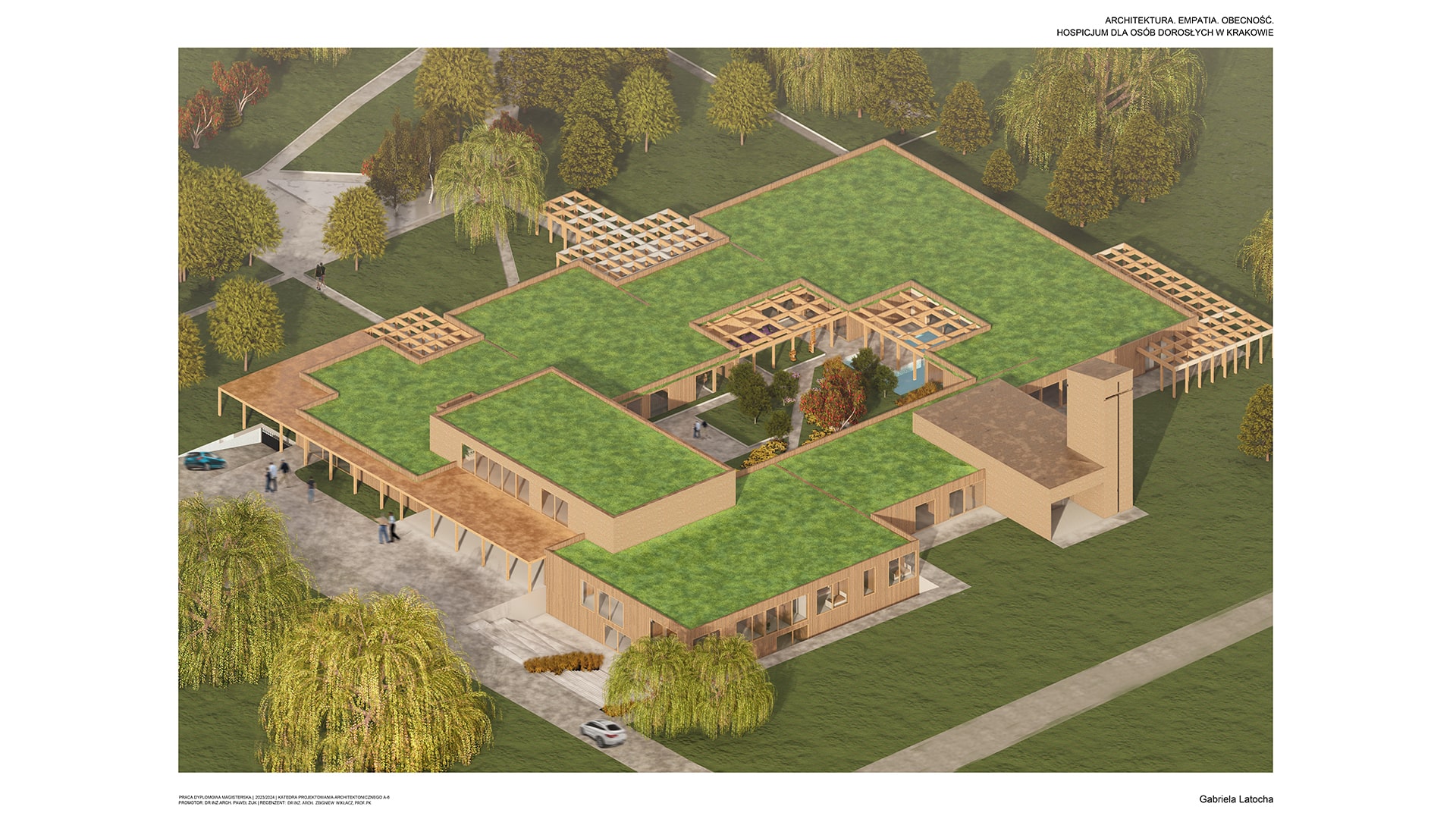 Tematem pracy magisterskiej jest projekt Hospicjum dla osób dorosłych w Krakowie. Obserwując obecną sytuację społeczną, w której wiele osób dotyka choroba nowotworowa, celem projektu stało się stworzenie wyjątkowej przestrzeni dla pacjentów hospicjum. Często kojarzone z ponurym szpitalem, hospicja budzą lęk i wyrzuty sumienia u rodzin, które umieszczają tam swoich najbliższych. Projekt ten ma na celu całkowite odwrócenie tego wizerunku, oferując pacjentom miejsce, które będzie dawało im bezpieczeństwo oraz spokój. W obiekcie zaplanowano liczne przestrzenie zielone, sprzyjające aktywnościom dostosowanym do możliwości chorych. Wnętrza zostały zaprojektowane w sposób nawiązujący do domowego klimatu, które mają tworzyć atmosferę wspólnoty. W projekcie wykorzystano naturalne materiały takie jak cegła oraz drewno. Bezpośredni dostęp do tarasów i ogrodu umożliwia pacjentom ciągły kontakt z naturą, niezależnie od ich stanu kontakt z naturą. Projekt ten stawia na potrzeby pacjentów, dbając także o komfort ich rodzin w tym trudnym dla nich czasie.